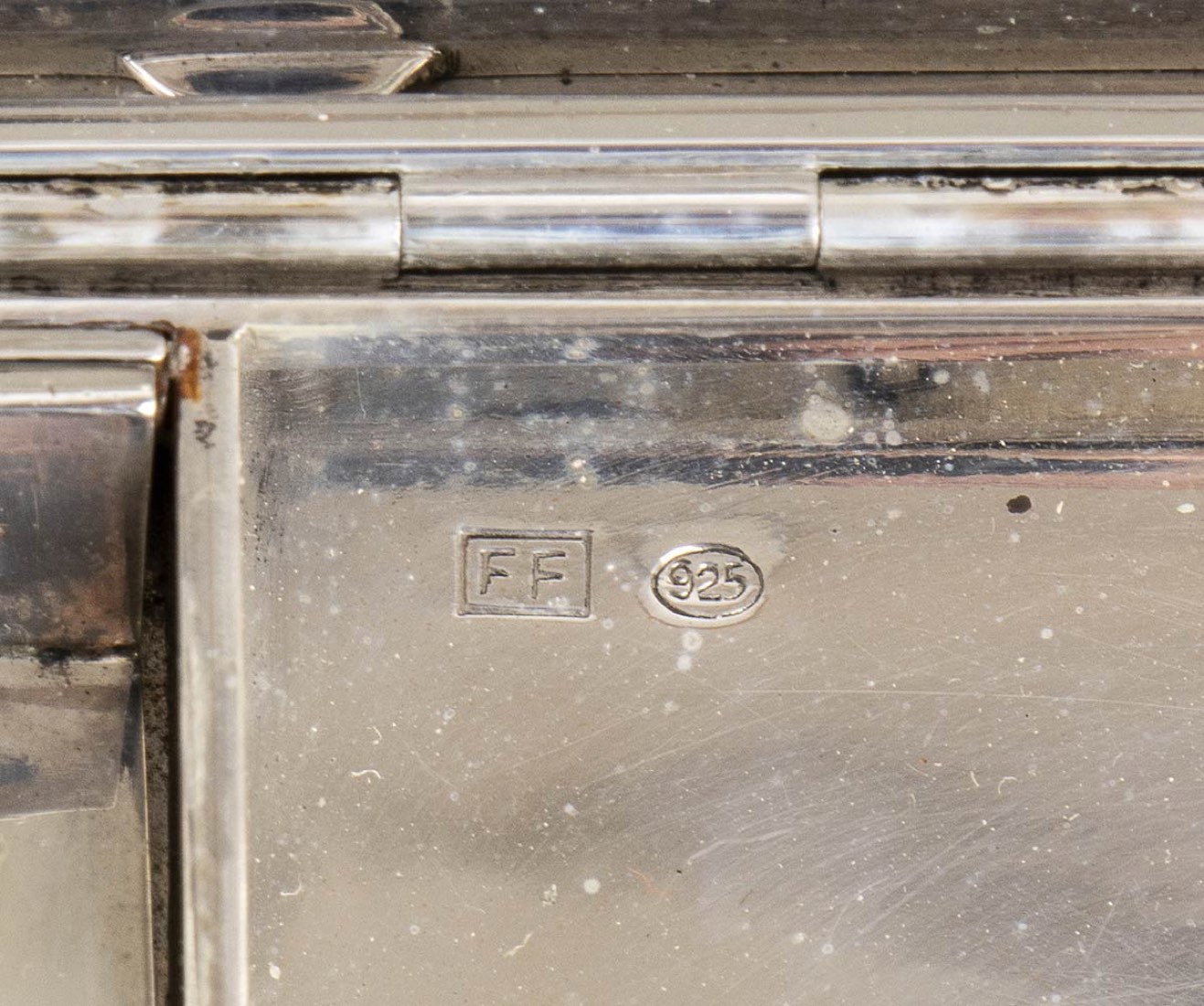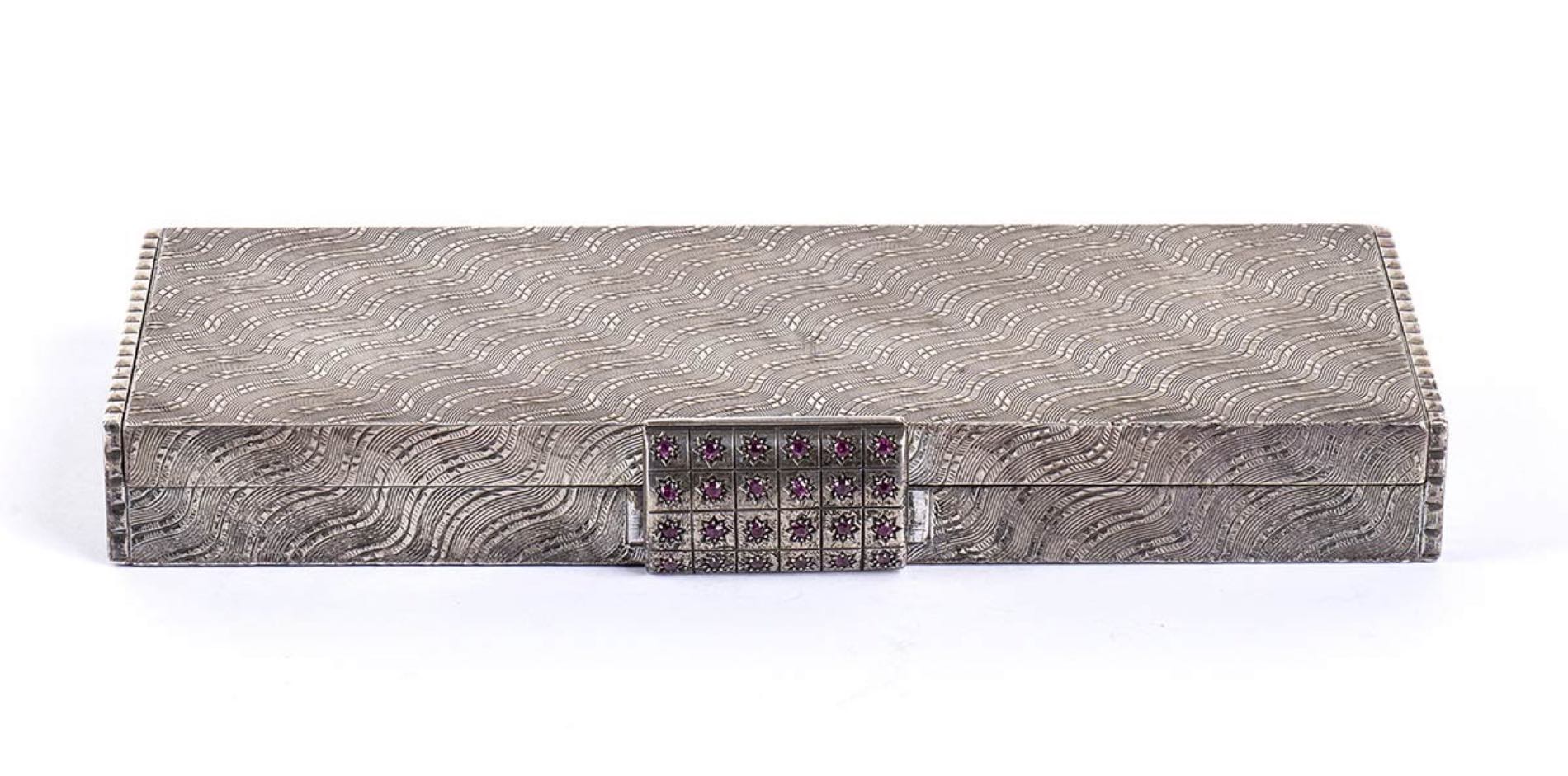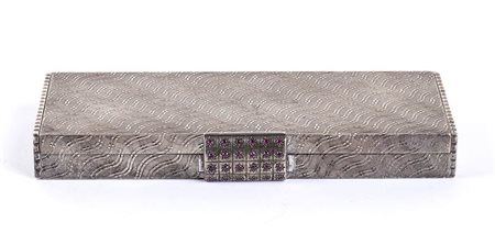 di forma rettangolare, interamente inciso con motivi ad onda, chiusura incastonata con rubini di sintesi. Argento 925/1000, punzonato "F F" e "925".