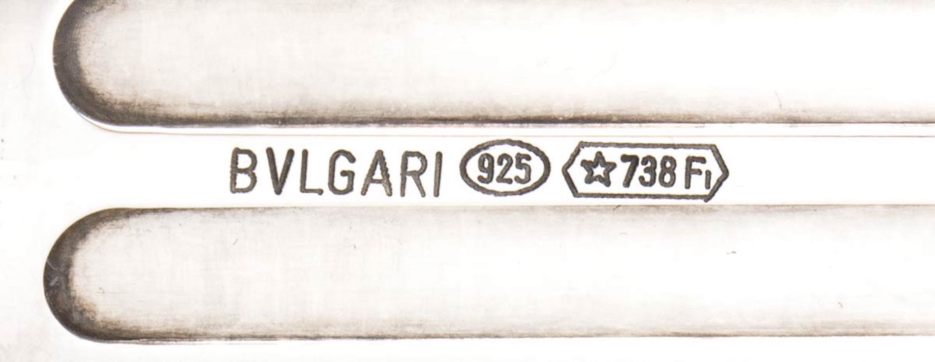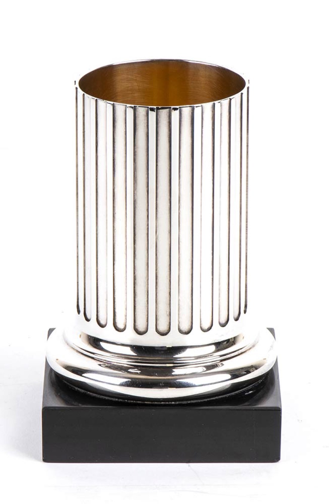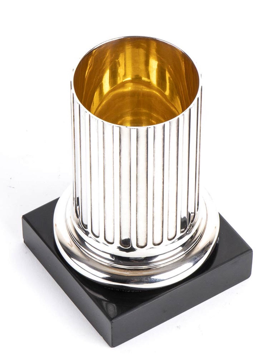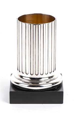 sezione di colonna con finitura scanalata su base quadrata di marmo nero, dorata internamente. Punzonata "BVLGARI", "925" e "738 FI", argentiere Bvlgari.