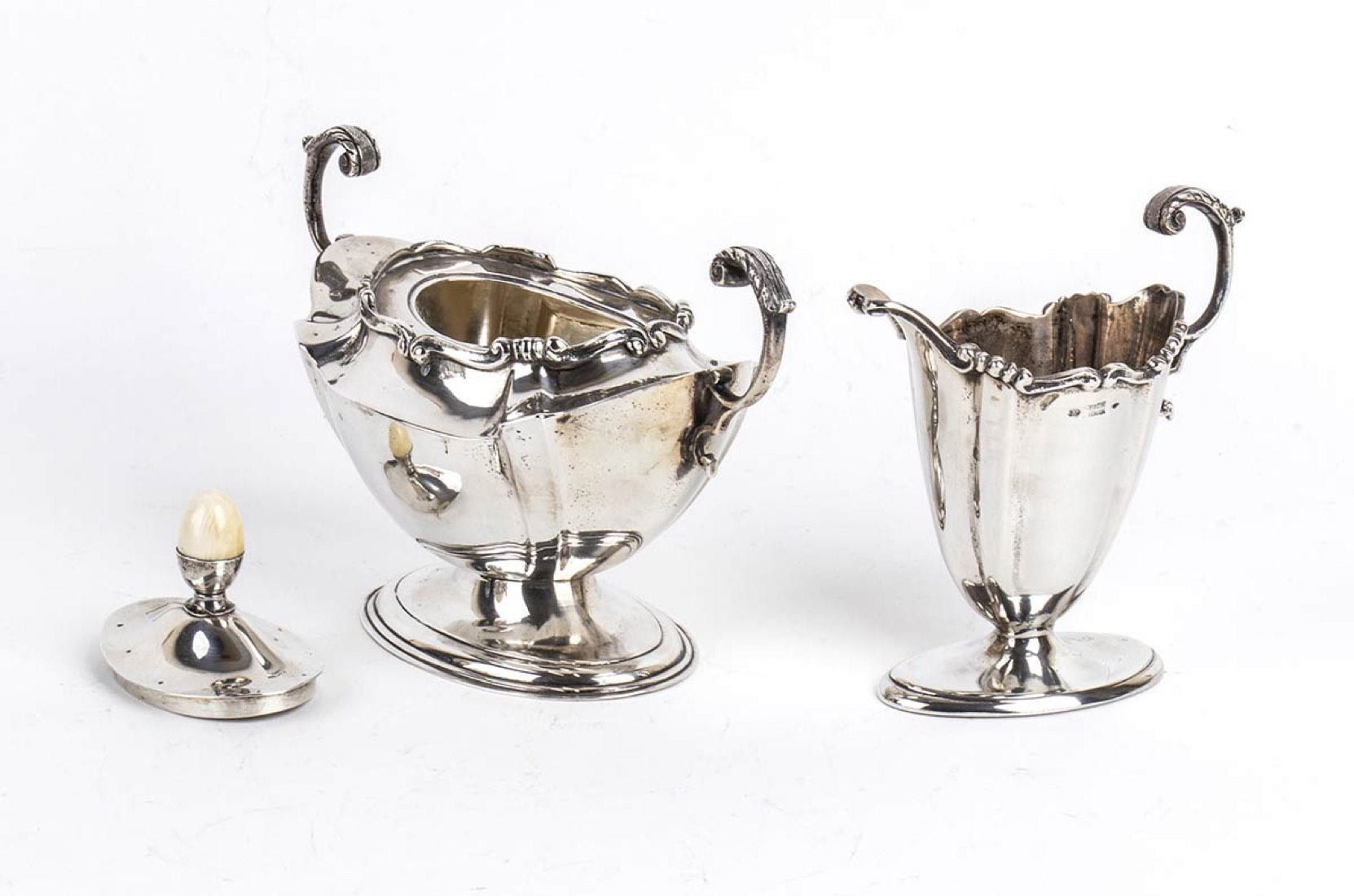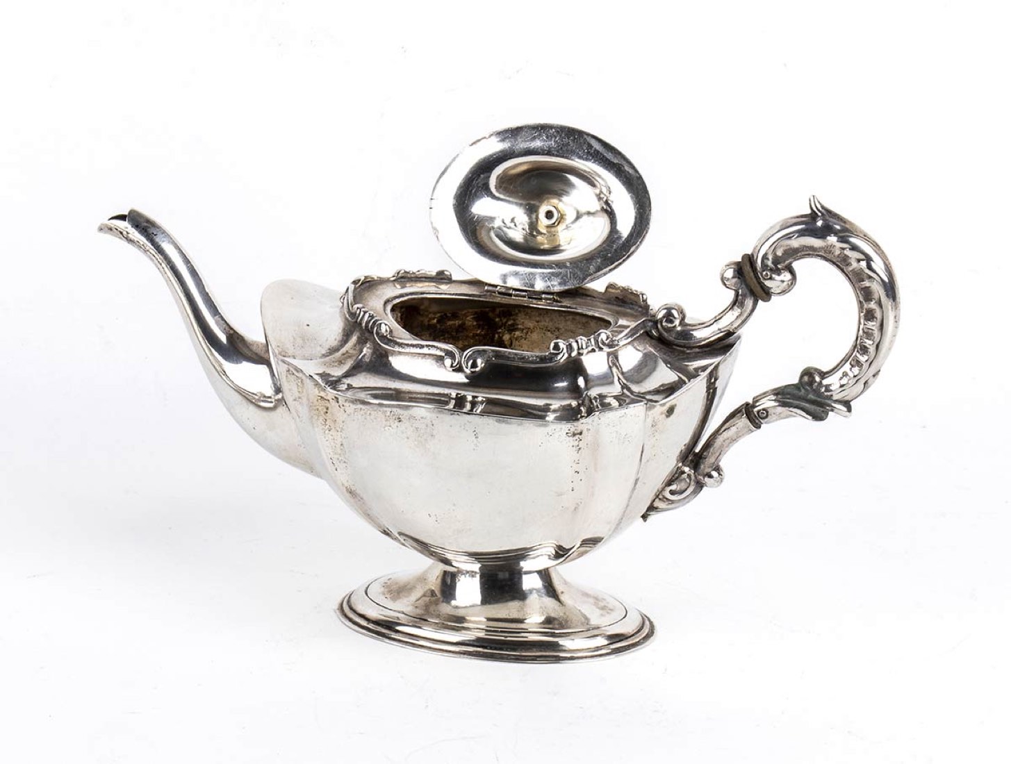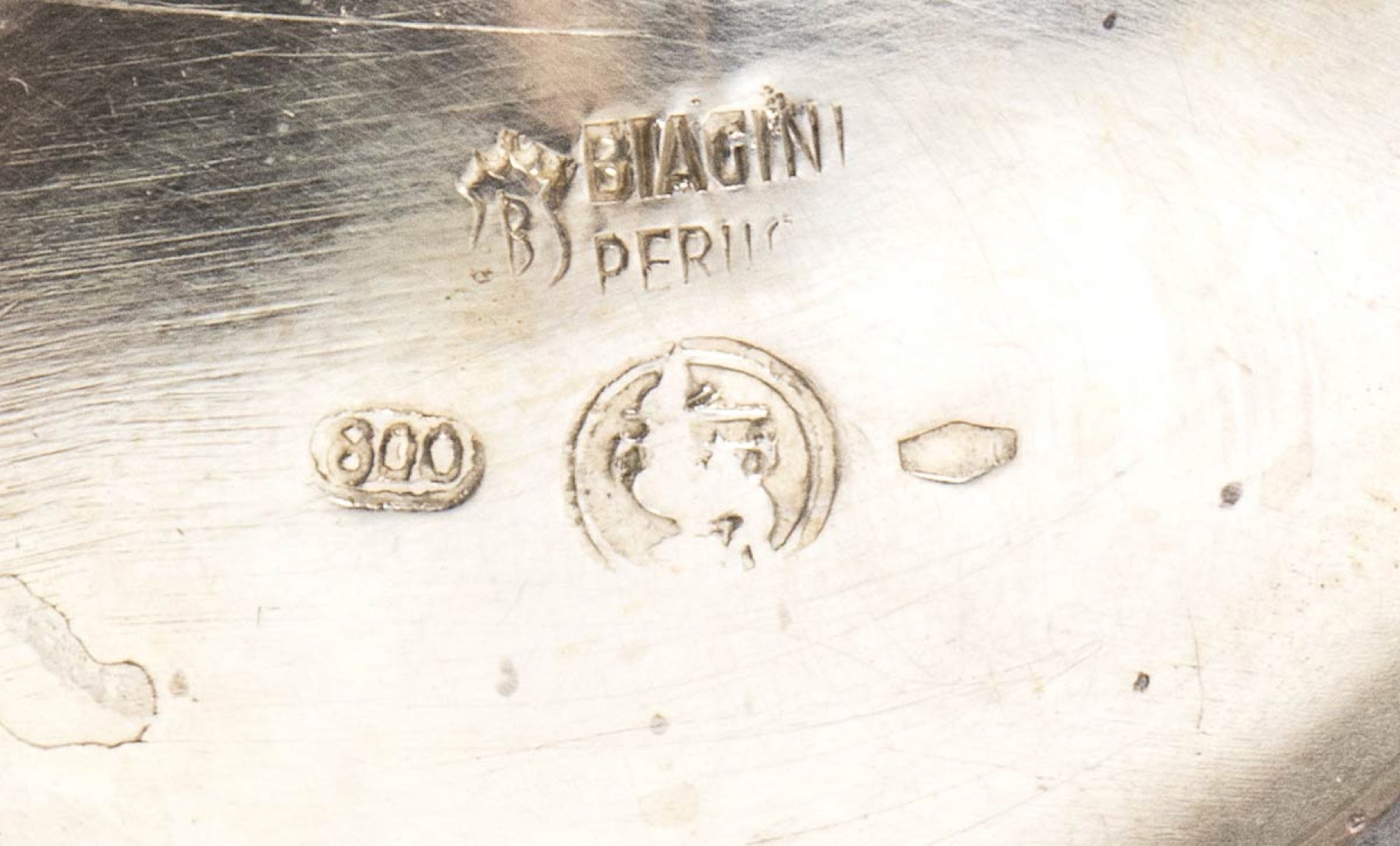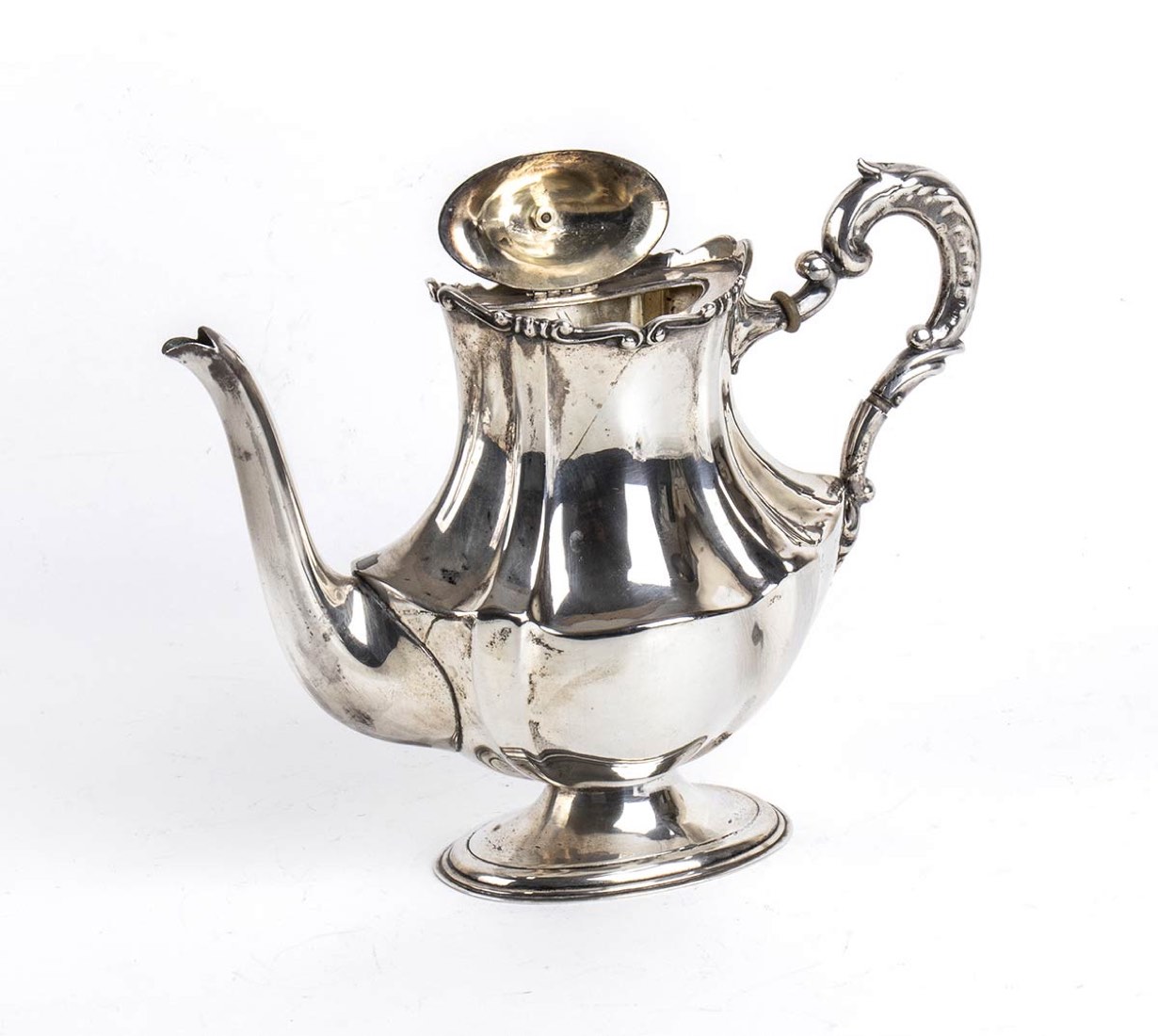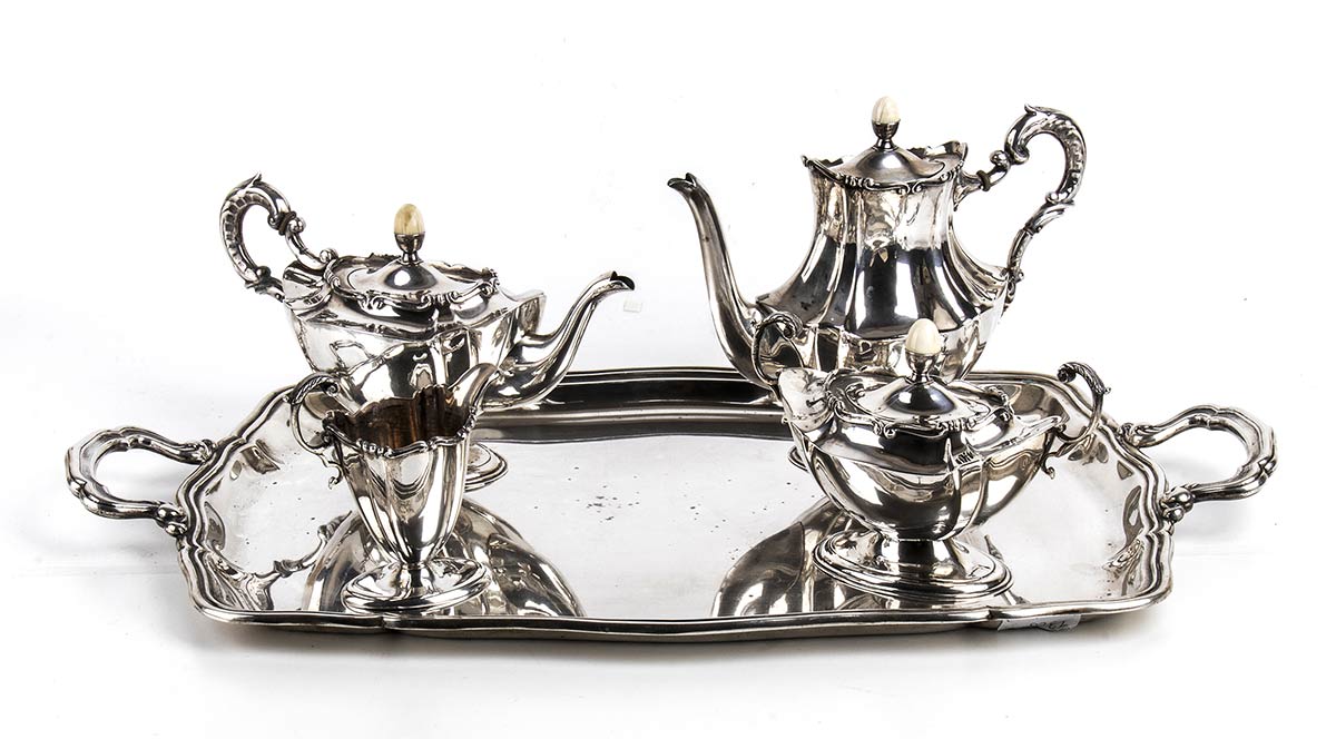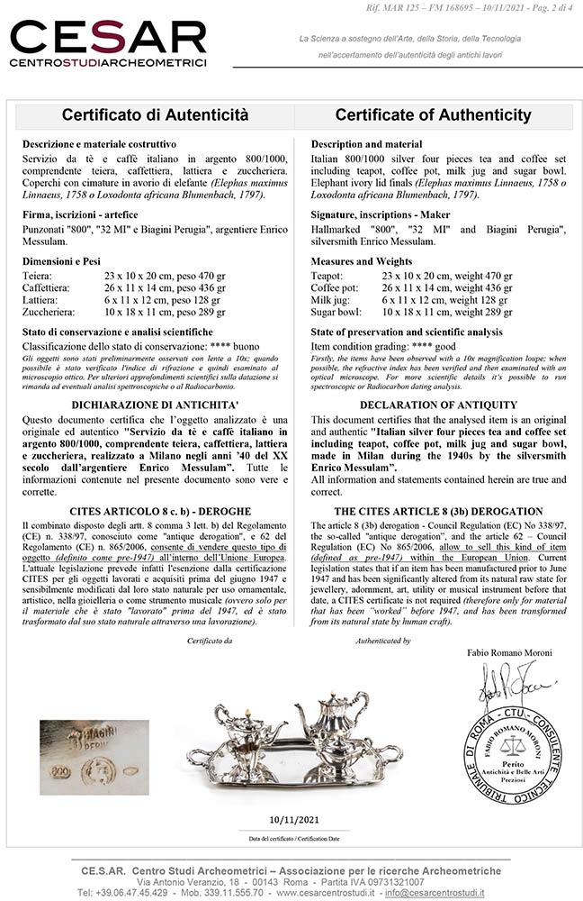 comprendente teiera, caffettiera, cremiera o lattiera, zuccheriera e vassoio. Coperchi con cimature in avorio (Elephas maximus Linnaeus, 1758 o Loxodonta africana Blumenbach, 1797) . Argento 800/1000, i bricchi punzonati "800", "32 MI" e Biagini Perugia", argentiere Enrico Messulam, il vassoio punzonato "800" e "3 VC", argentiere Castaudi e Gautero. Dimensioni e pesi: teiera 23 x 10 x 20 cm, peso 470 gr; caffettiera 26 x 11 x 14 cm, peso 436 gr, lattiera 6 x 11 x 12 cm, peso 128 gr; zuccheriera 10 x 18 x 11 cm, peso 289 gr; vassoio 60 x 40 cm, peso 1717 gr. Peso complessivo 3040 gr. Stato di conservazione: **** buono. Accompagnato da certificato di antichità Ce.S.Ar. Centro Studi Archeometrici (pre-1947).