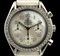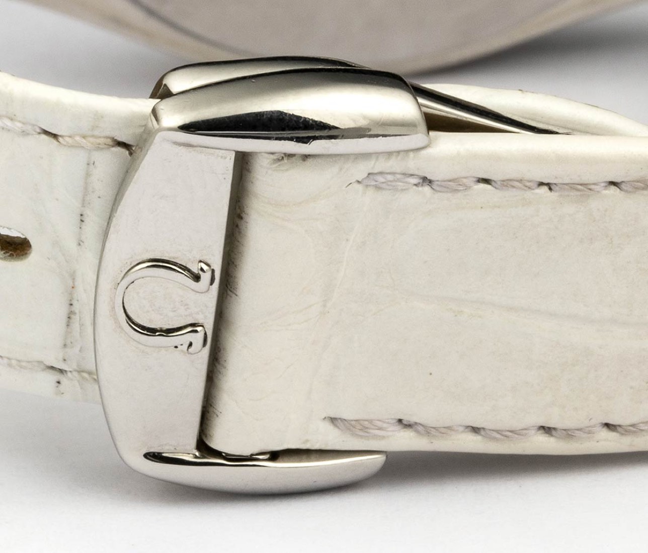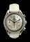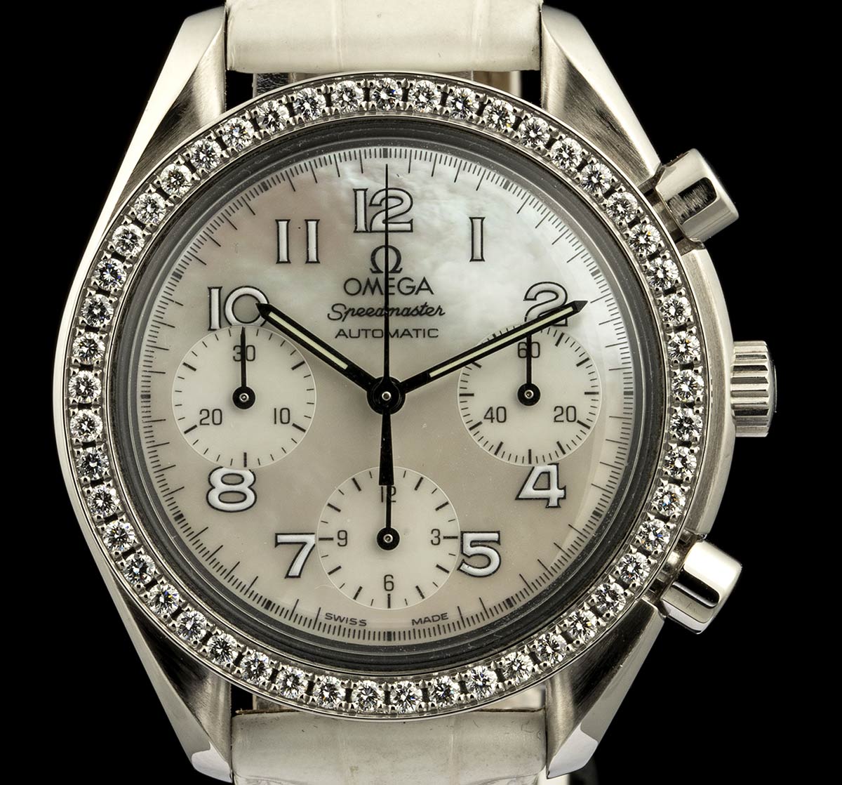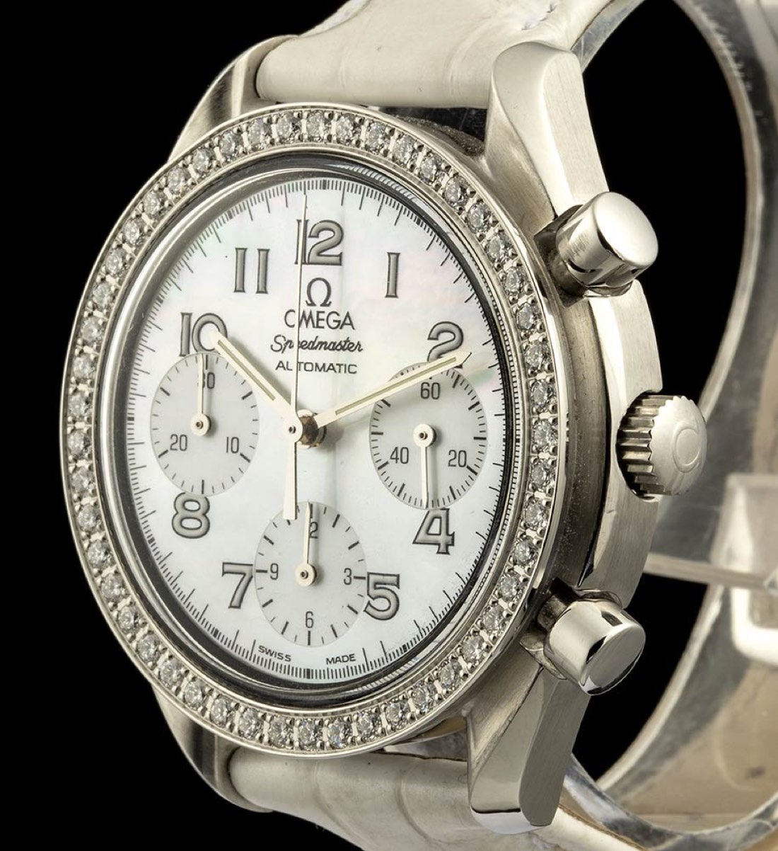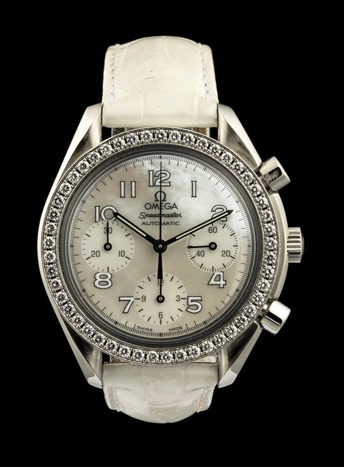 in acciaio, quadrante in madreperla con numeri arabi e ghiera con diamanti. Movimento automatico, cronografo Omega Speedmaster Ref. 3835.70.36. Cinturino in pelle bianca e chiusura deployante. Diametro della cassa 39 mm.