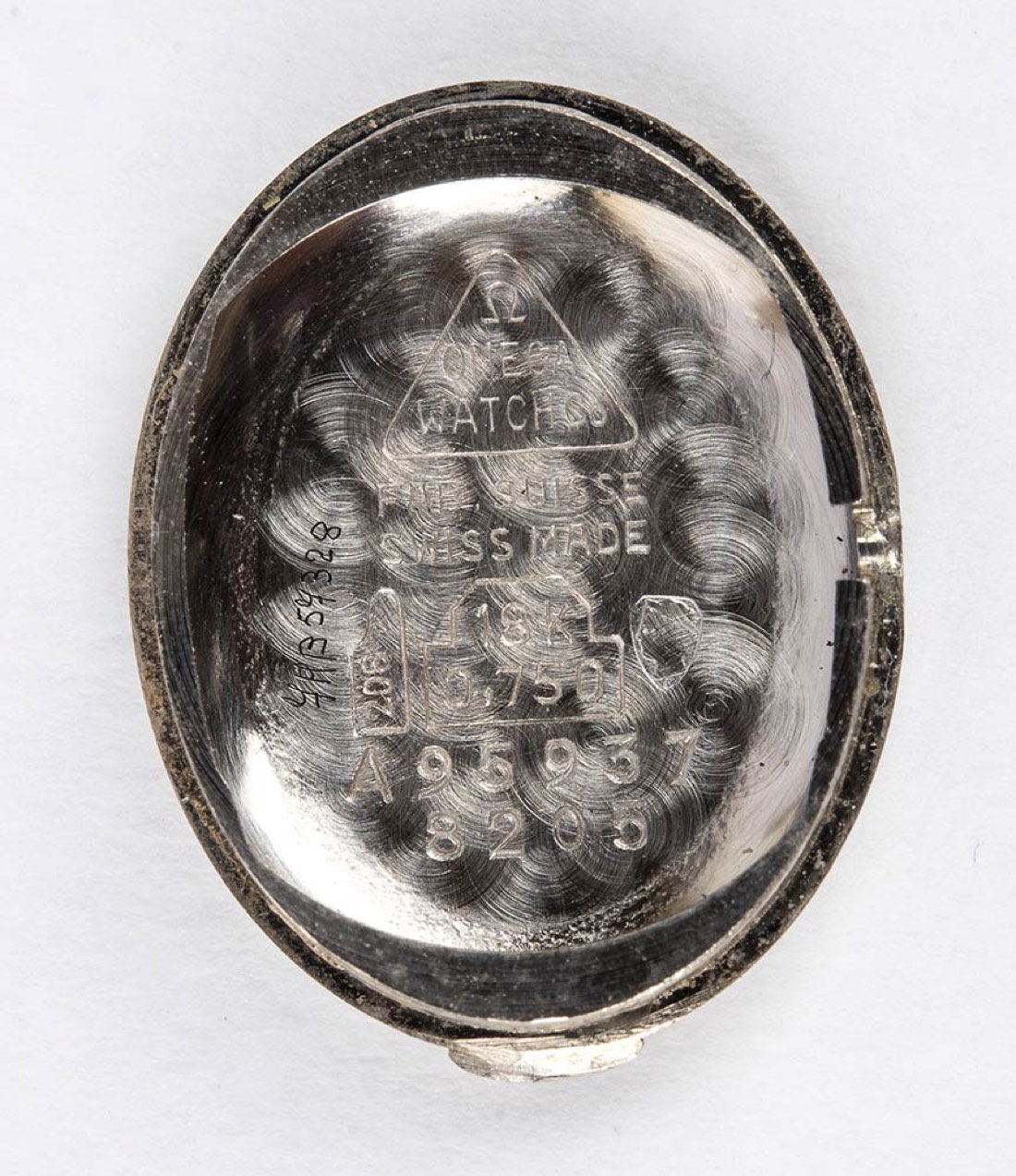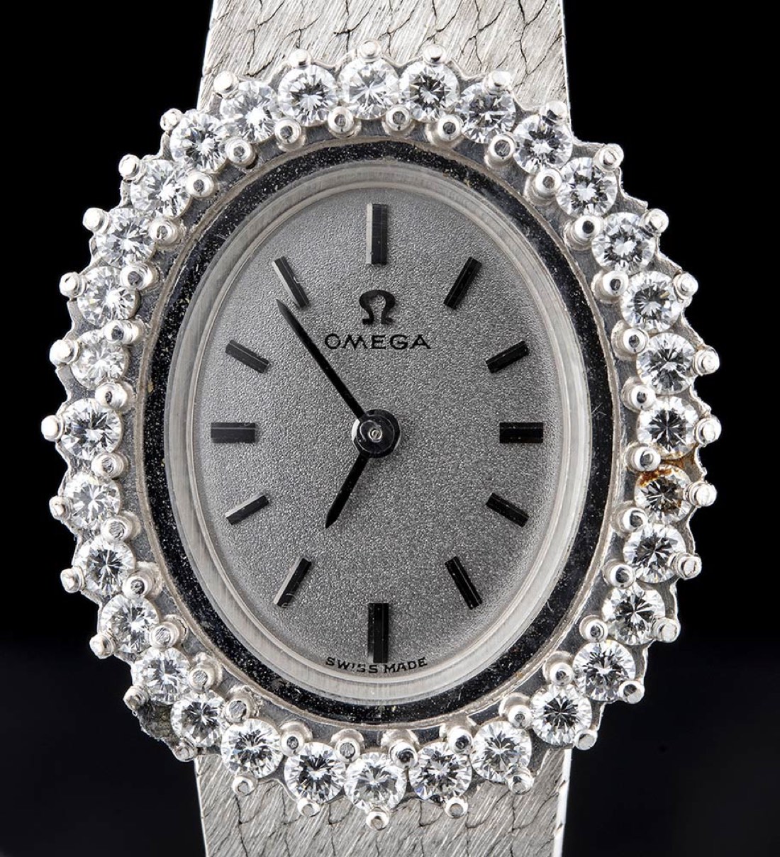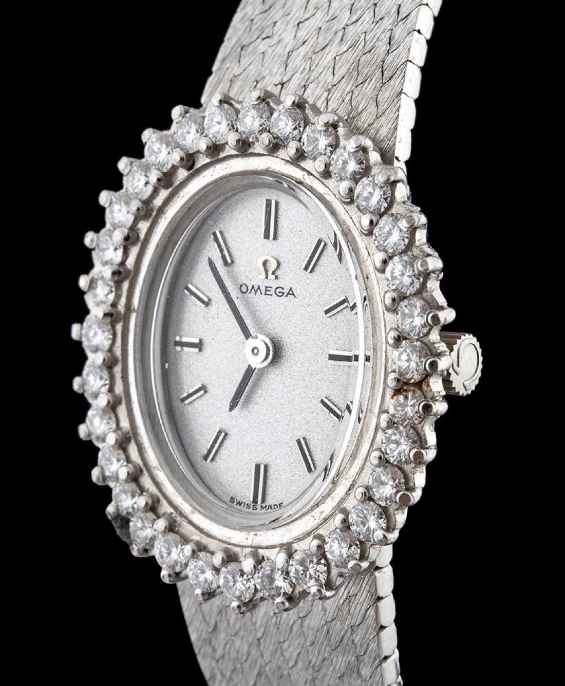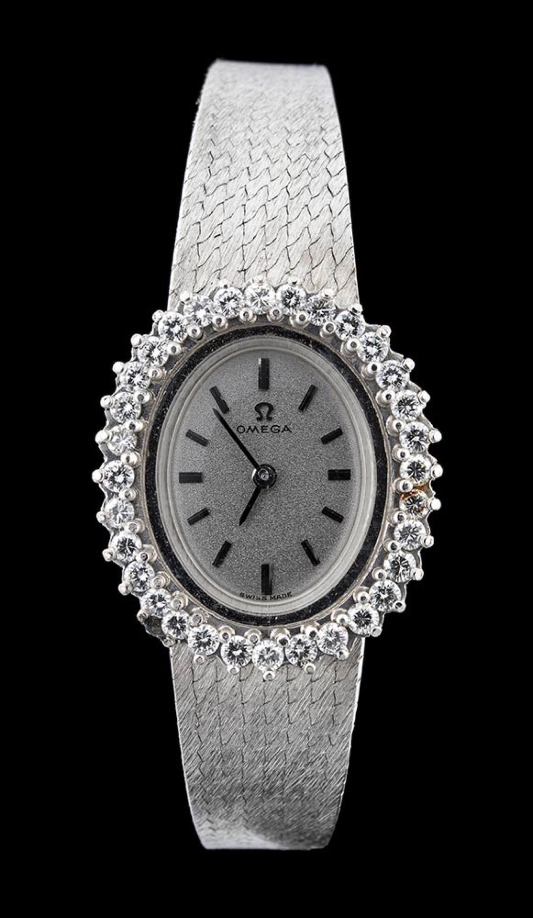 cassa e bracciale in oro bianco 18k, quadrante argentato con indici a bastoni e ghiera in diamanti. Movimento 17j., seriale 27293409, referenza 8205. Dimensione della cassa 26 x 22 mm, lunghezza bracciale 16 cm. Peso 37,1 gr. Stato di conservazione: ***** eccellente.