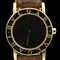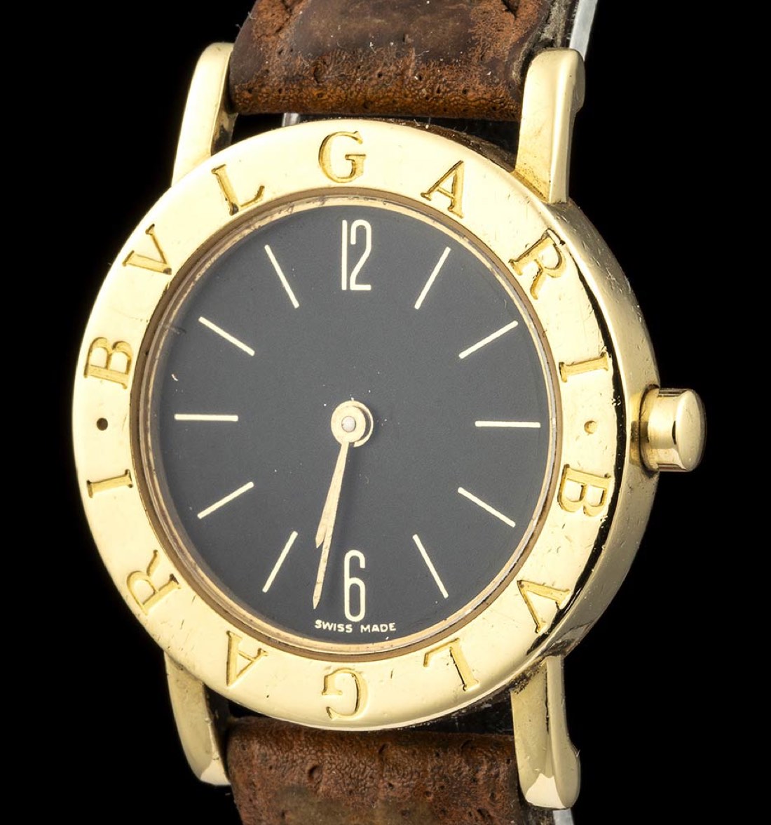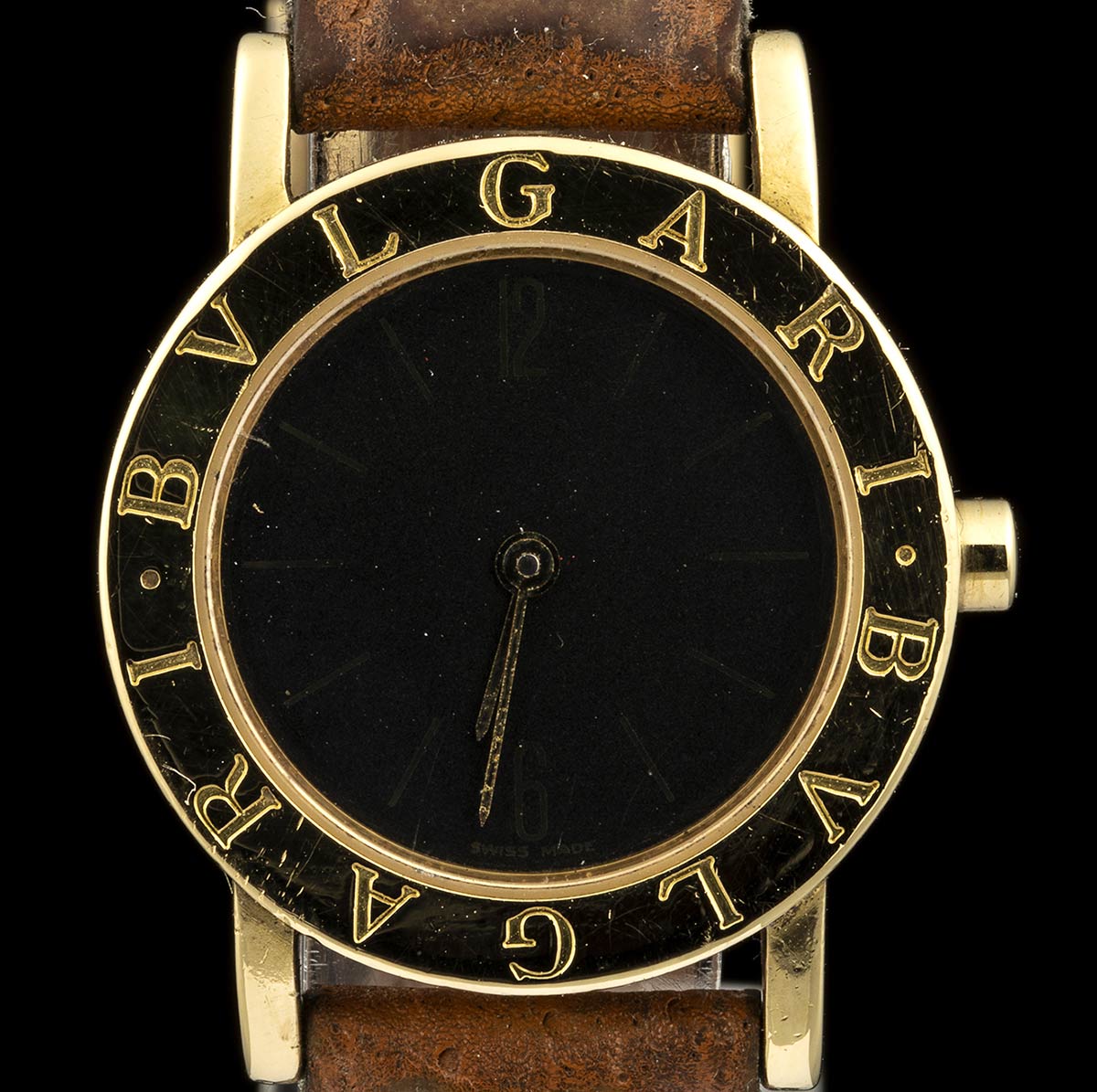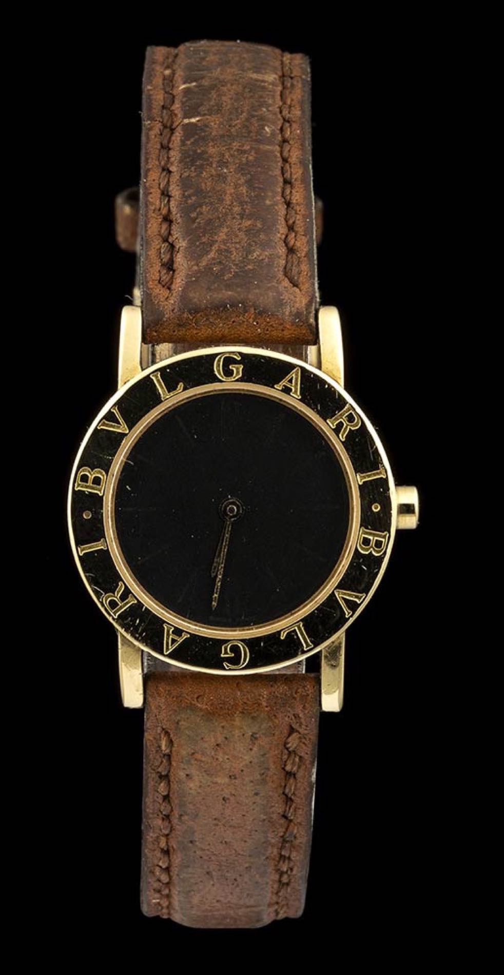 quadrante nero con indici applicati a bastone e numeri arabi dorati. Cassa e fibbia in oro giallo 18k con cinturino in pelle, modello BVLGARI BVLGARI ref. BB 26 GL con movimento al quarzo. Diametro cassa 26 mm.
