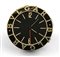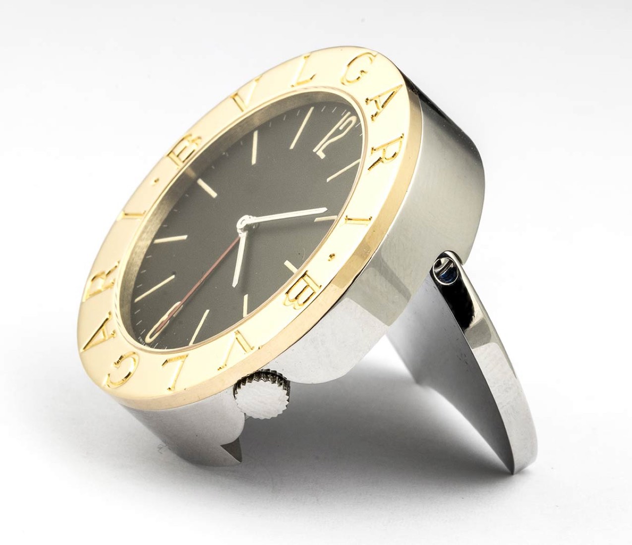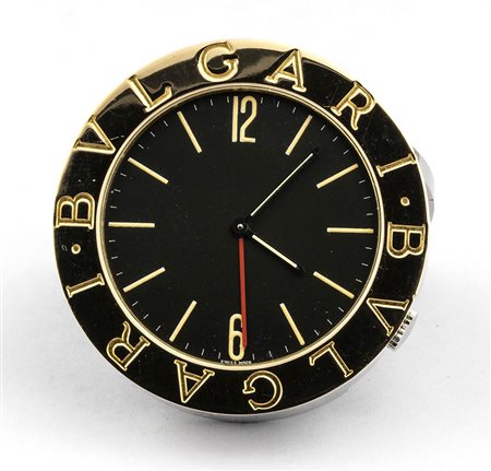 quadrante nero opaco con indici a bastone e numeri arabi dorati. Orologio da tavolo-sveglia da viaggio di forma rotonda in oro giallo 18k e acciaio. Collezione BVLGARI BVLGARI ref. ABO1GS con movimento al quarzo. Diametro 37 mm.