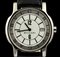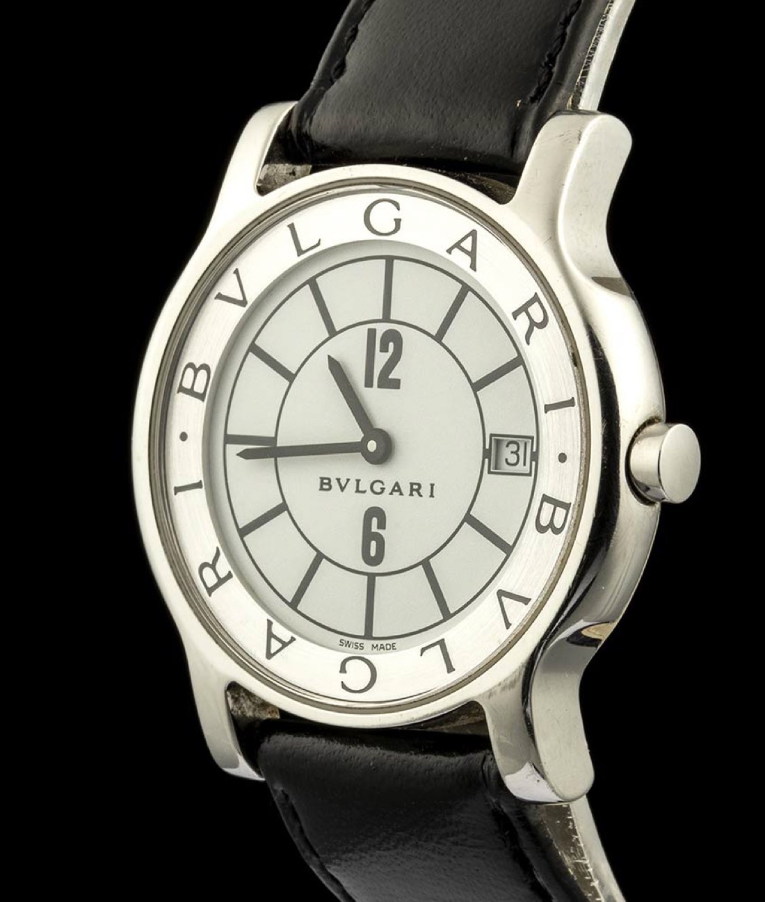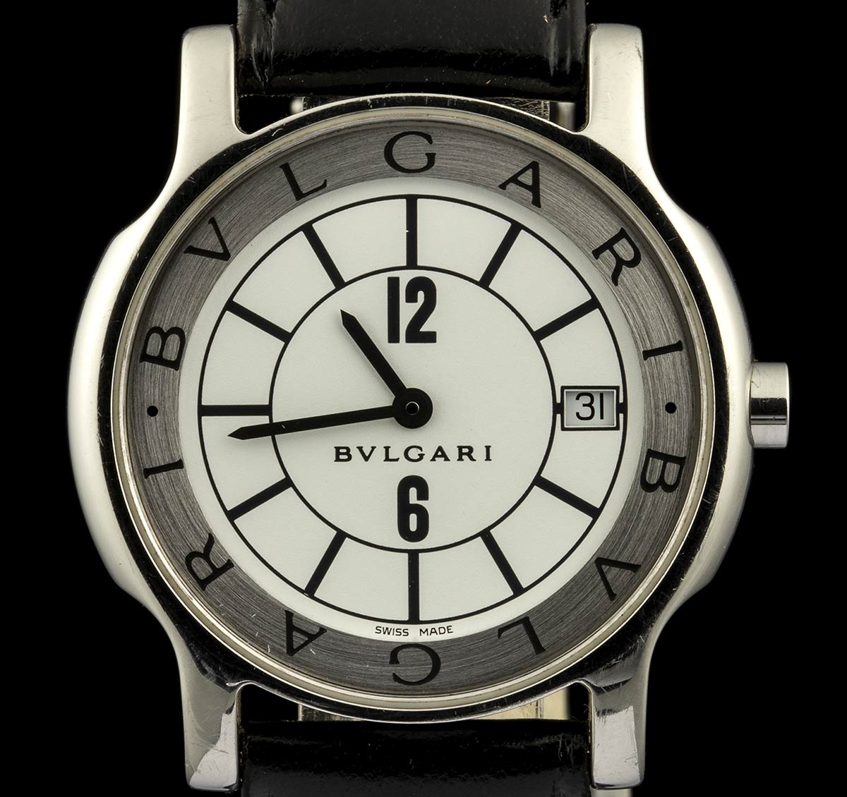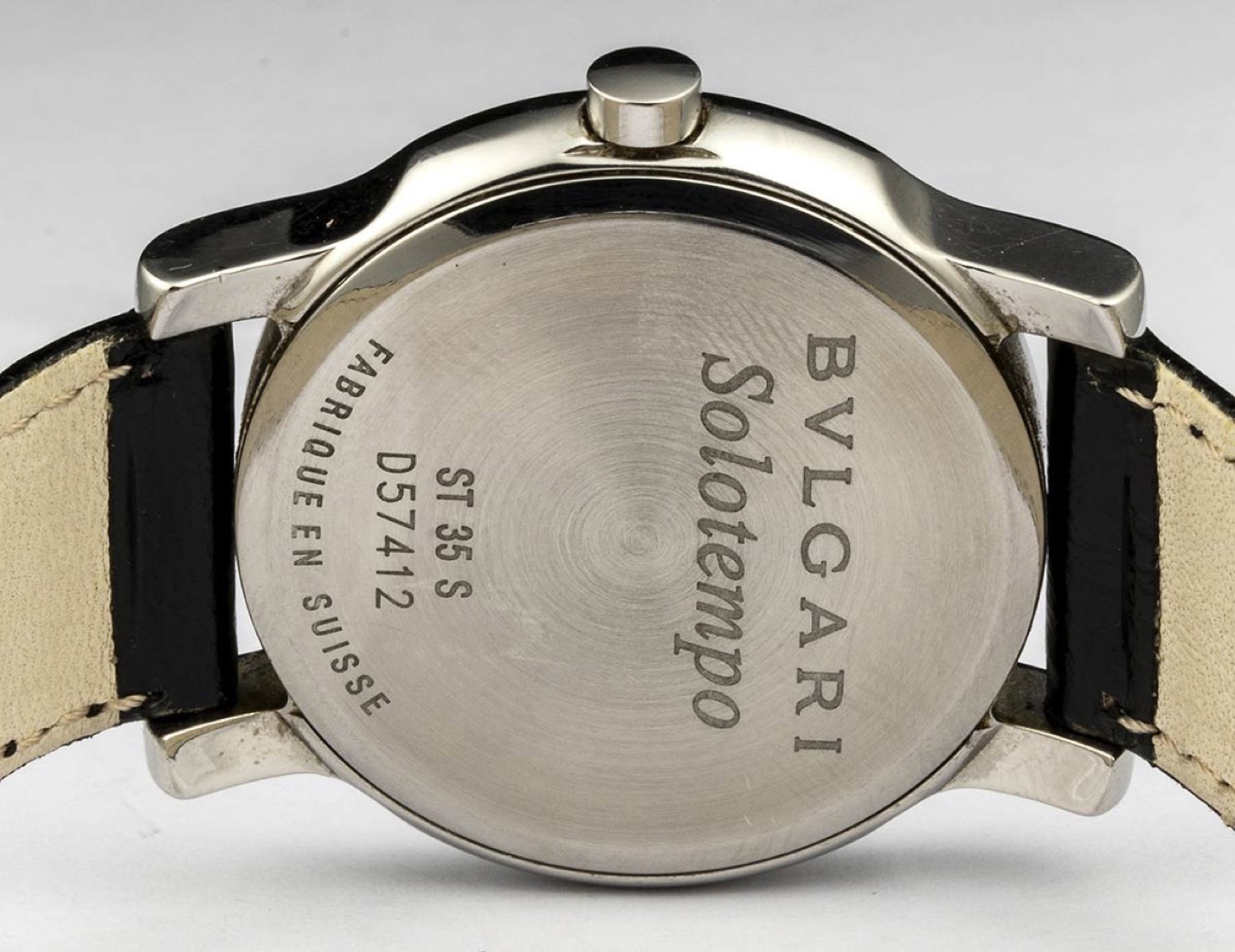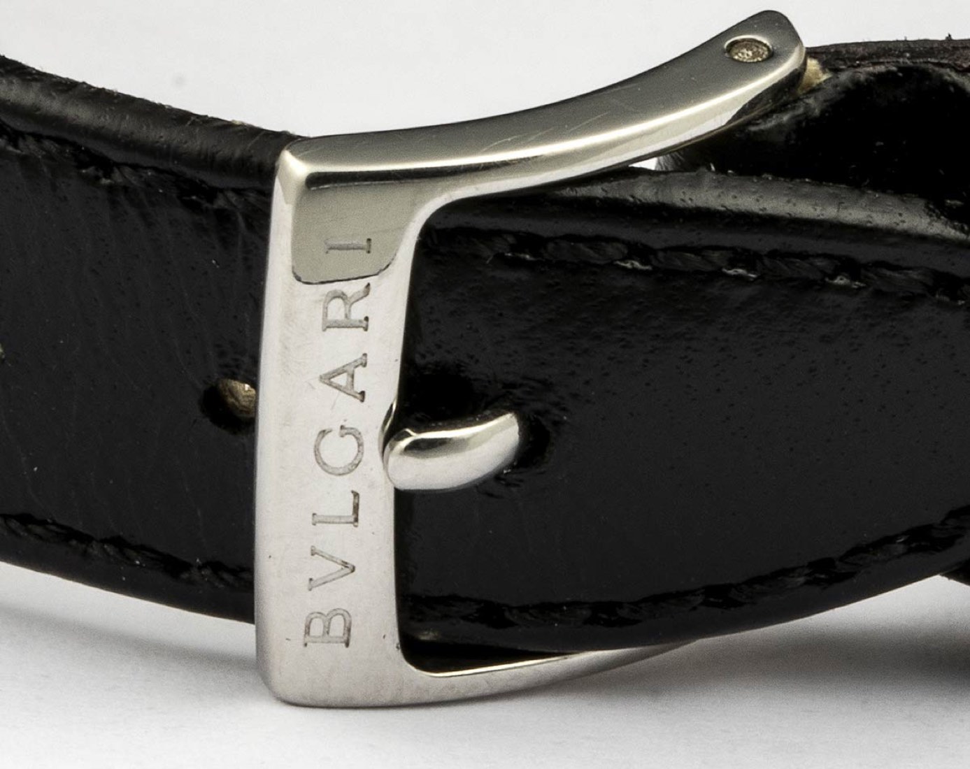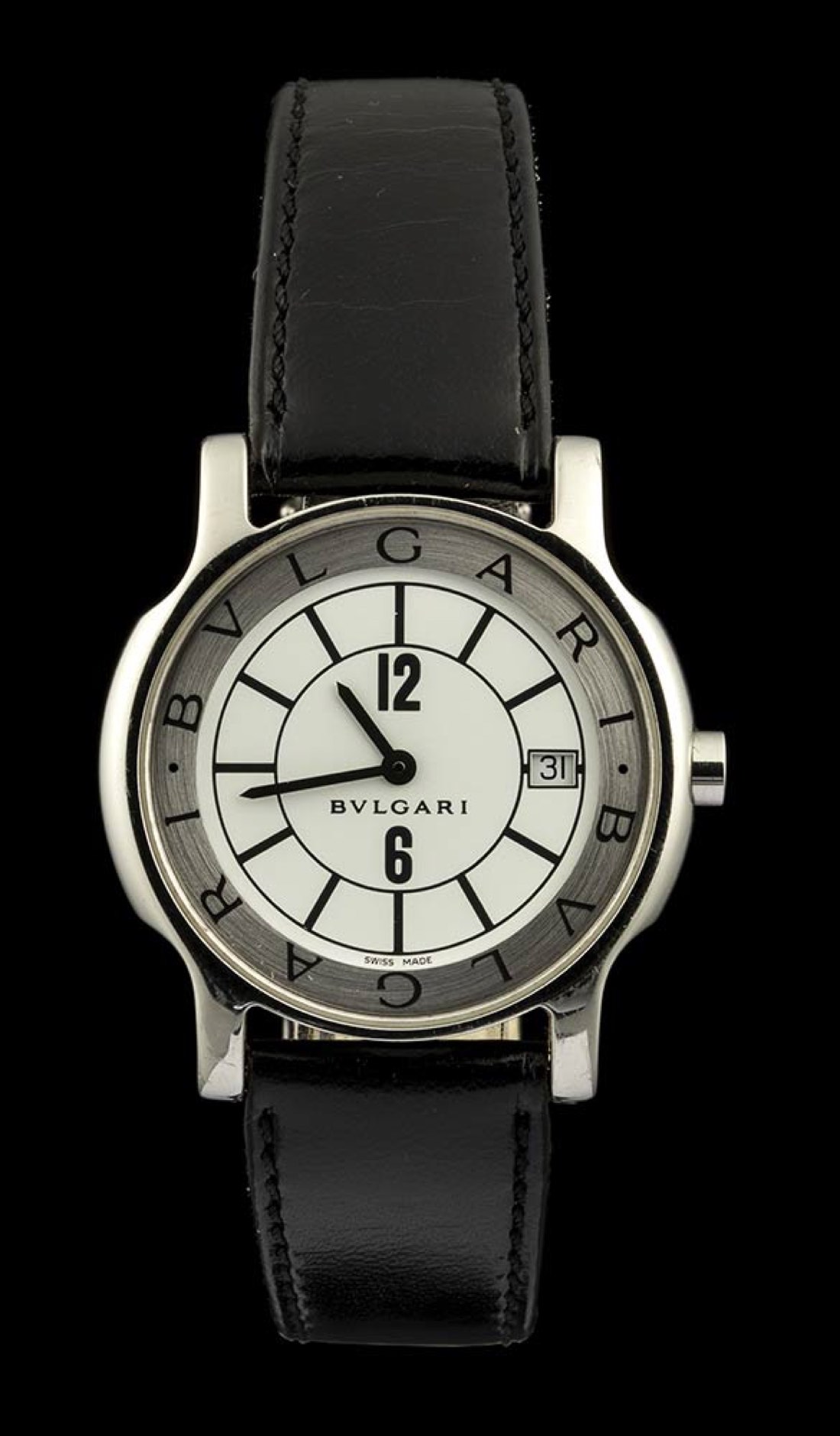 in acciaio, quadrante bianco con indici a bastoni e numeri, datario a ore 3 e vetro zaffiro. Movimento al quarzo. Cinturino in pelle e chiusura ardiglione originale. Diametro della cassa 35 mm.