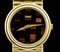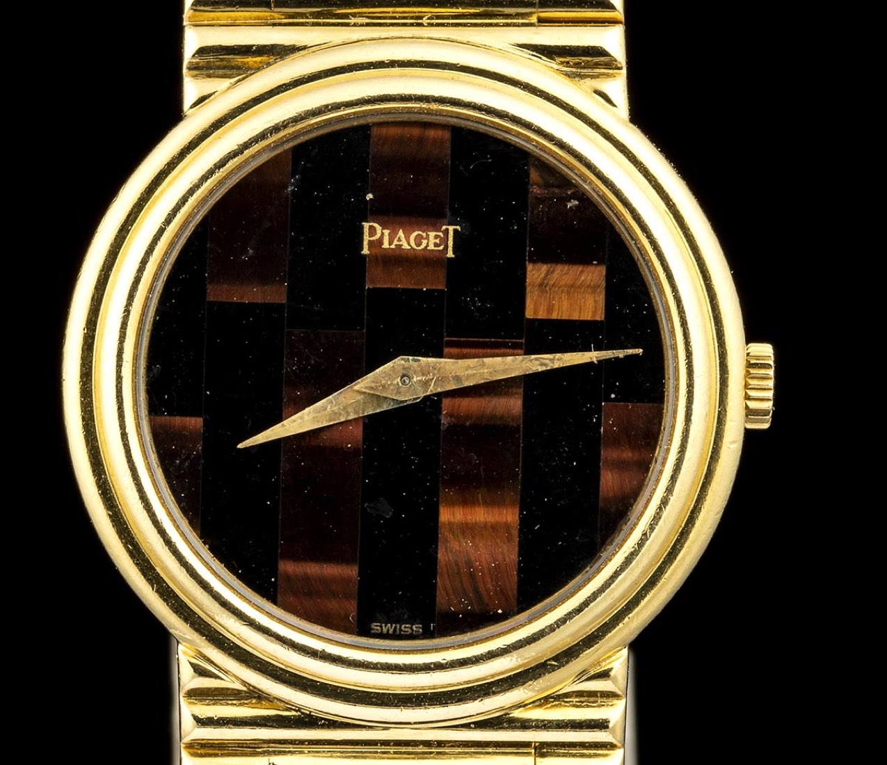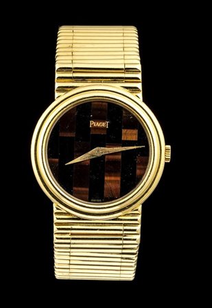 modello da donna con cinturino e cassa in oro giallo 18k. Ref. 9040 G1 con movimento a carica manuale, quadrante nero e occhio di tigre. Diametro cassa 25 mm, lunghezza 16,5 cm.