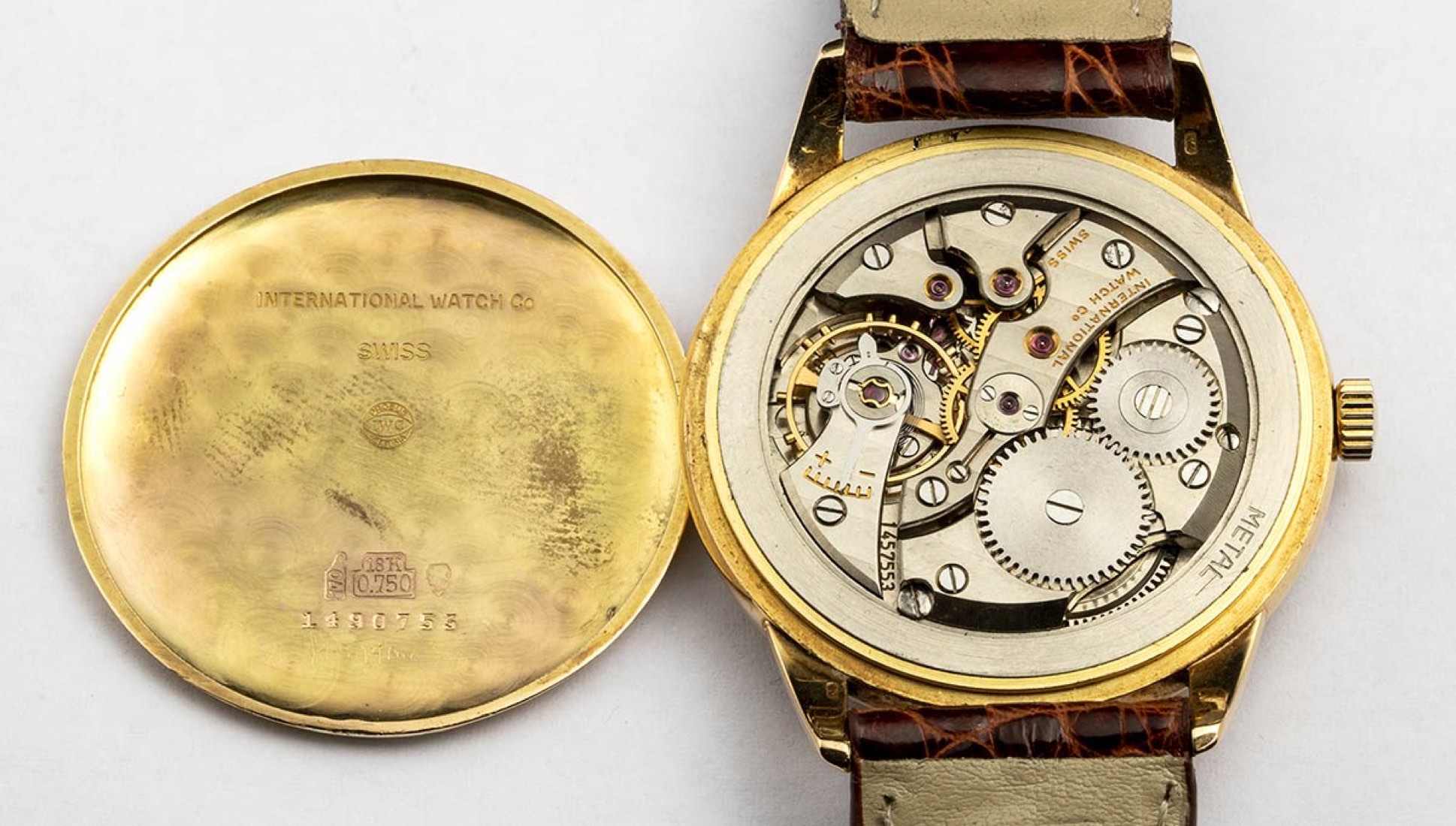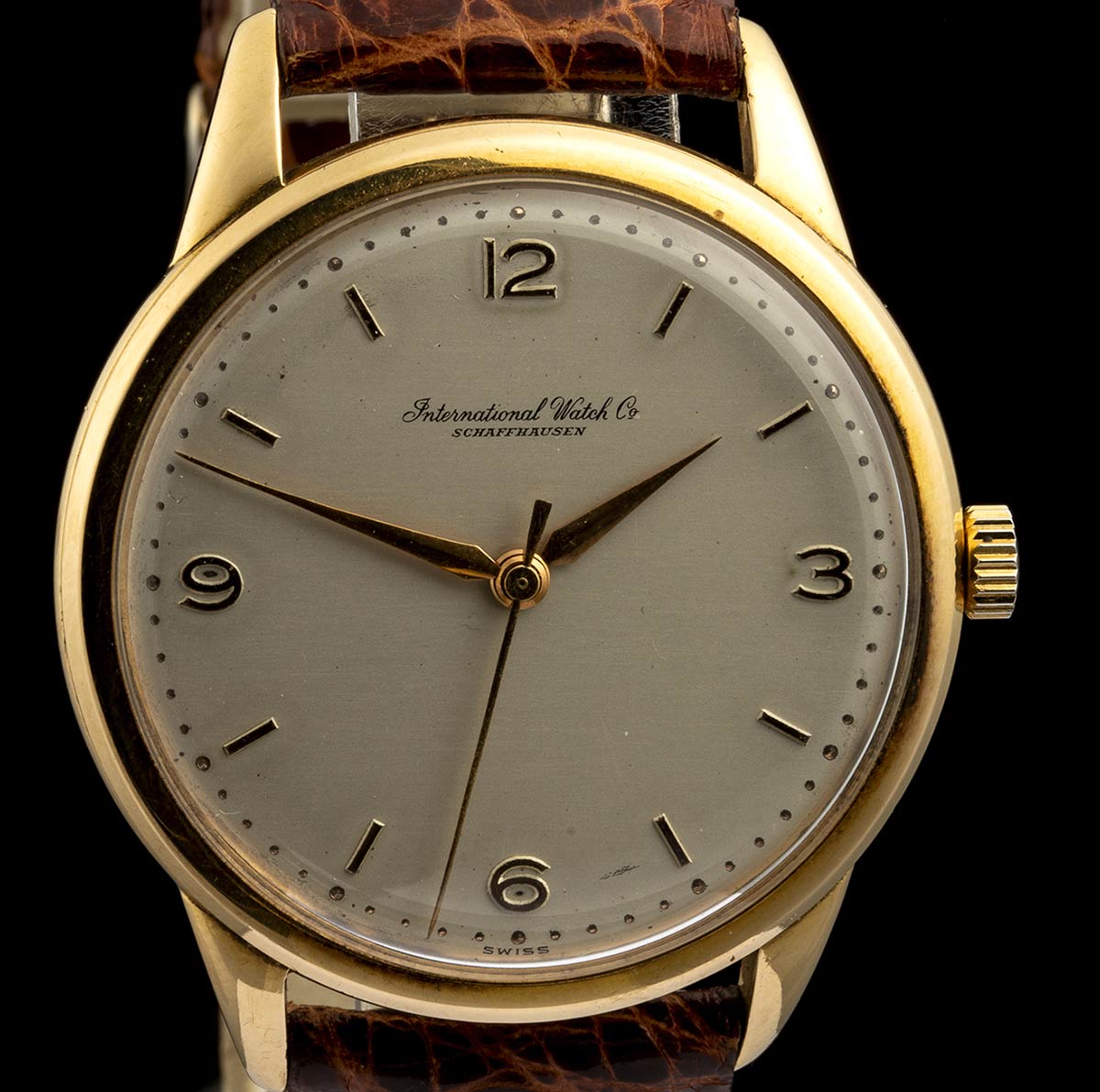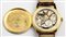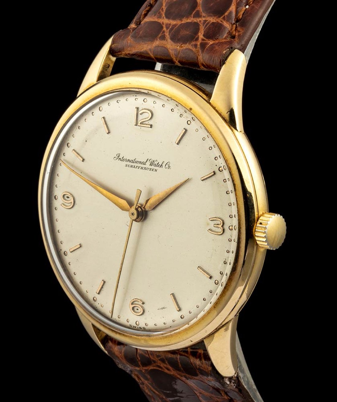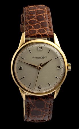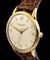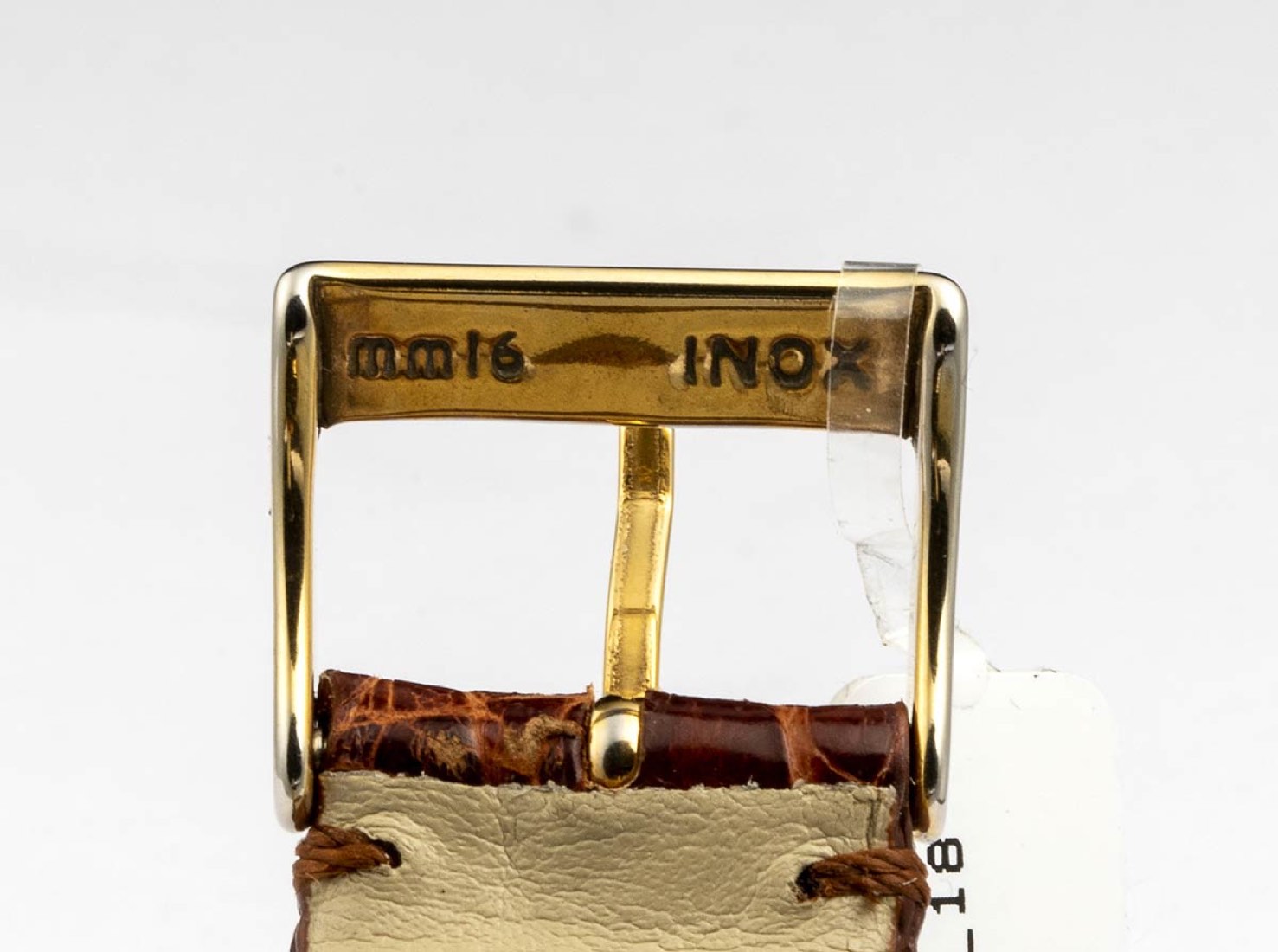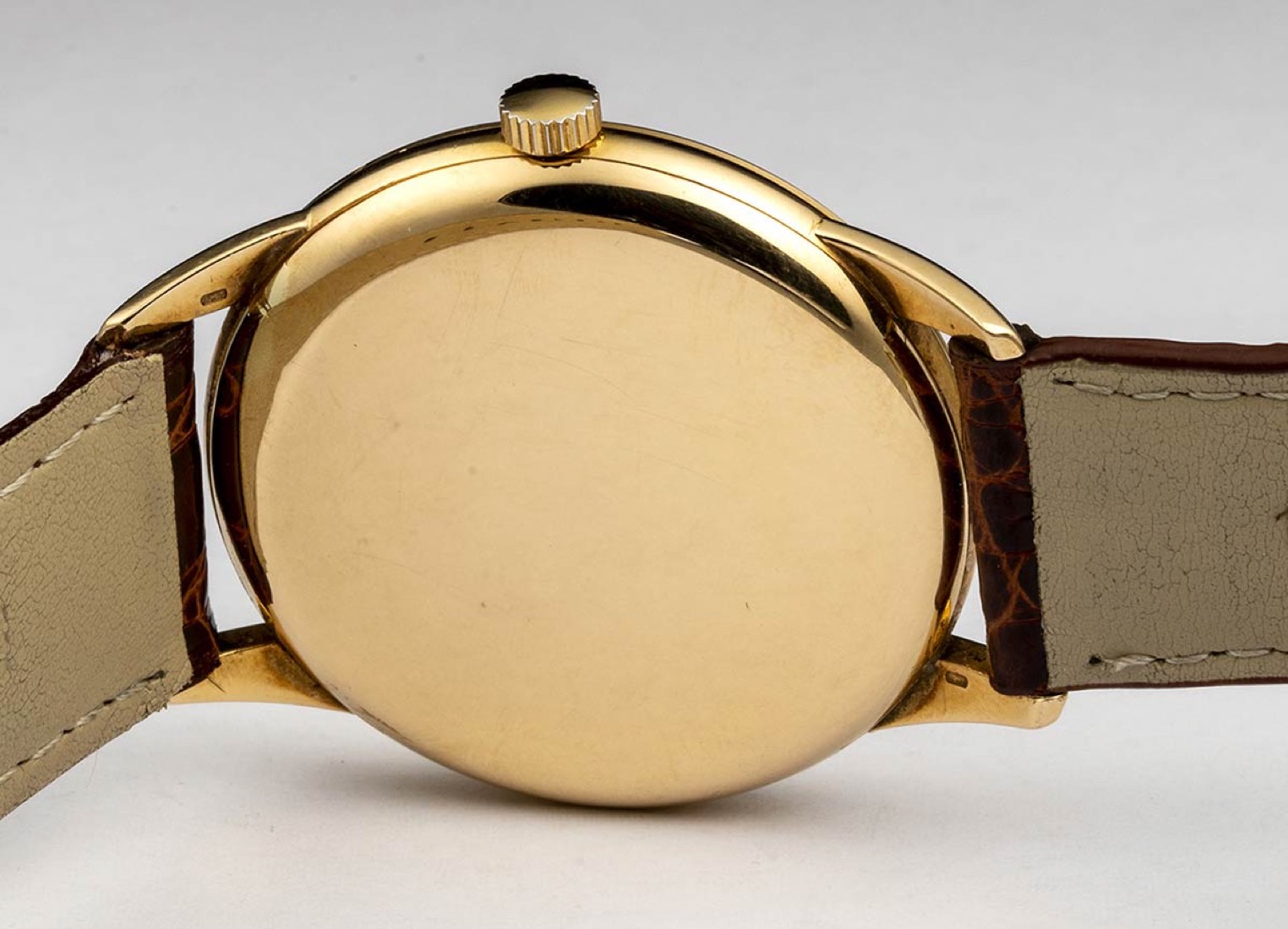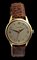 in oro giallo, quadrante avorio con indici e numeri arabi. Movimento a carica manuale. Cinturino in pelle marrone con chiusura ardiglione in metallo. Cassa 36 mm.