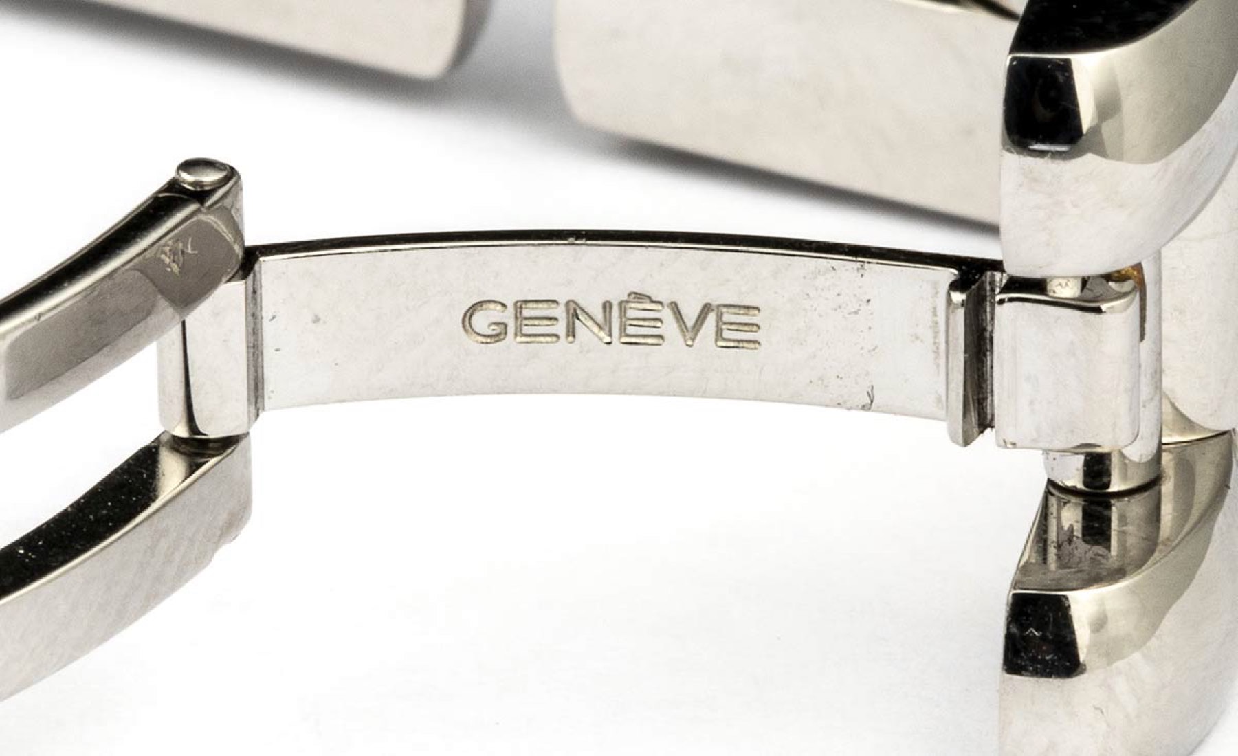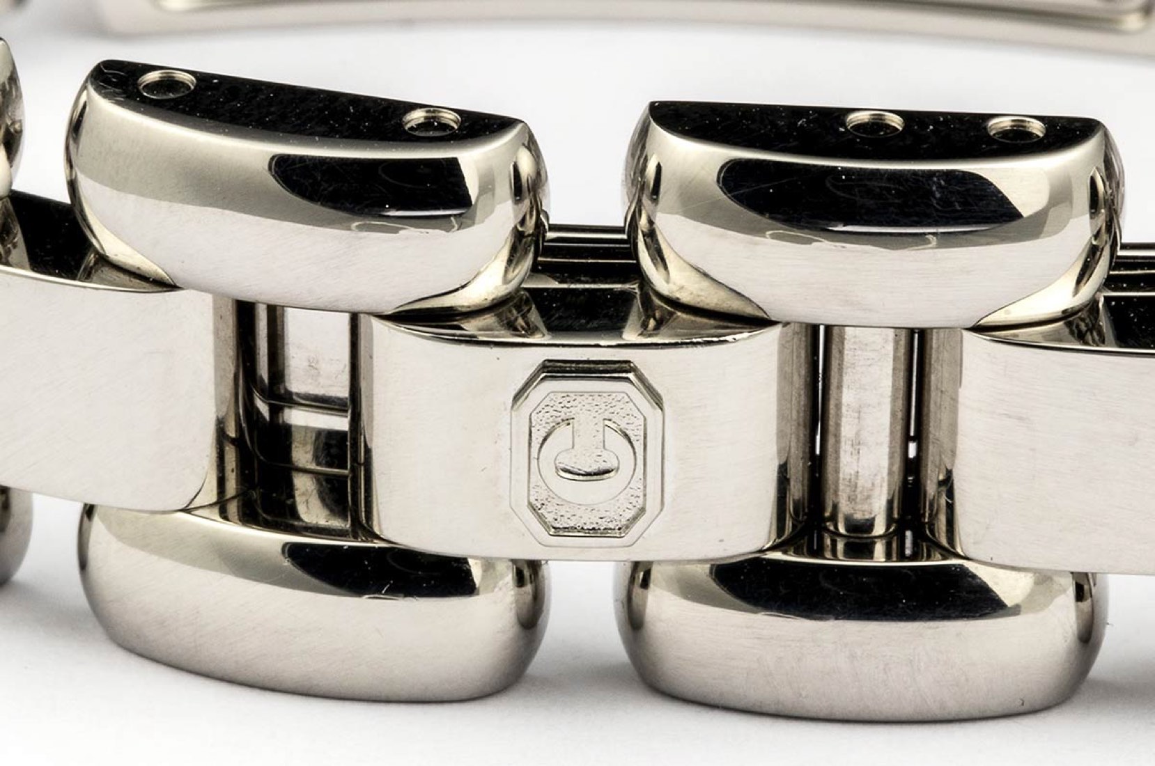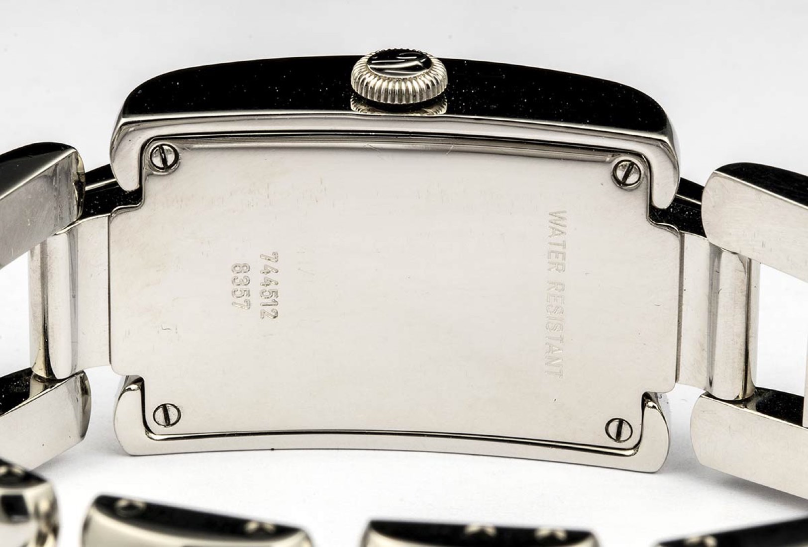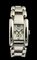 cassa in acciaio, quadrante bianco con indici a numeri romani e bastoni. Movimento al quarzo, ref. 8317. Bracciale in acciaio con chiusura a scomparsa. Cassa 24 x 44 mm, lunghezza 19 cm.