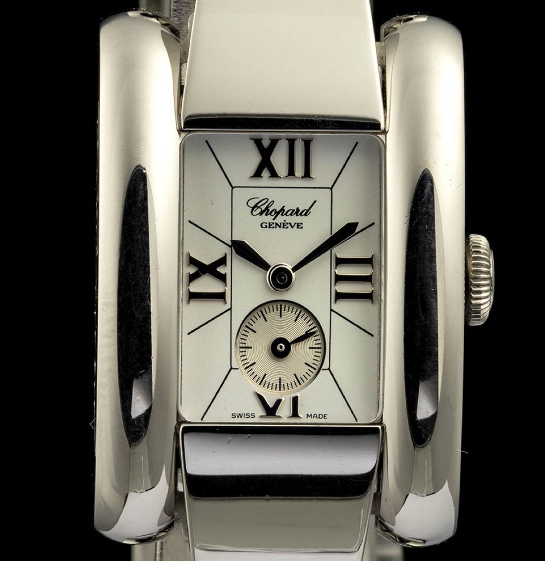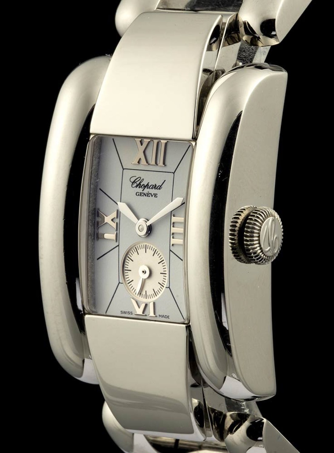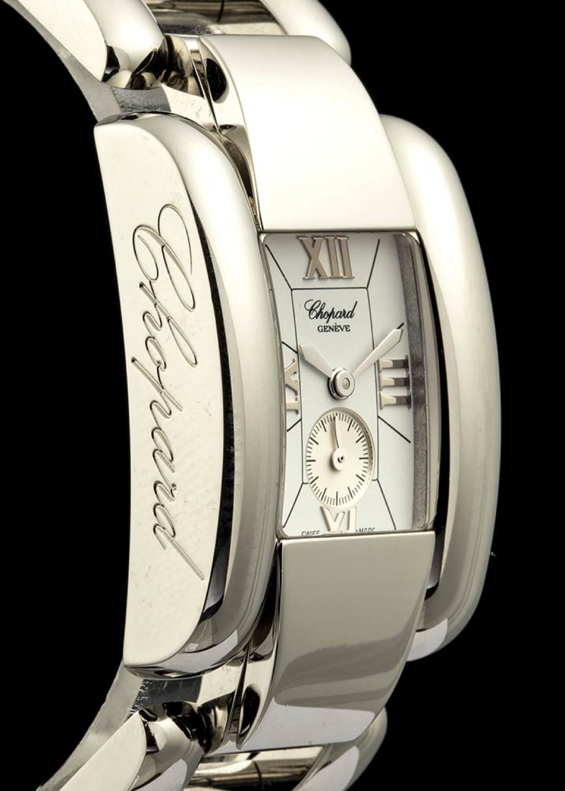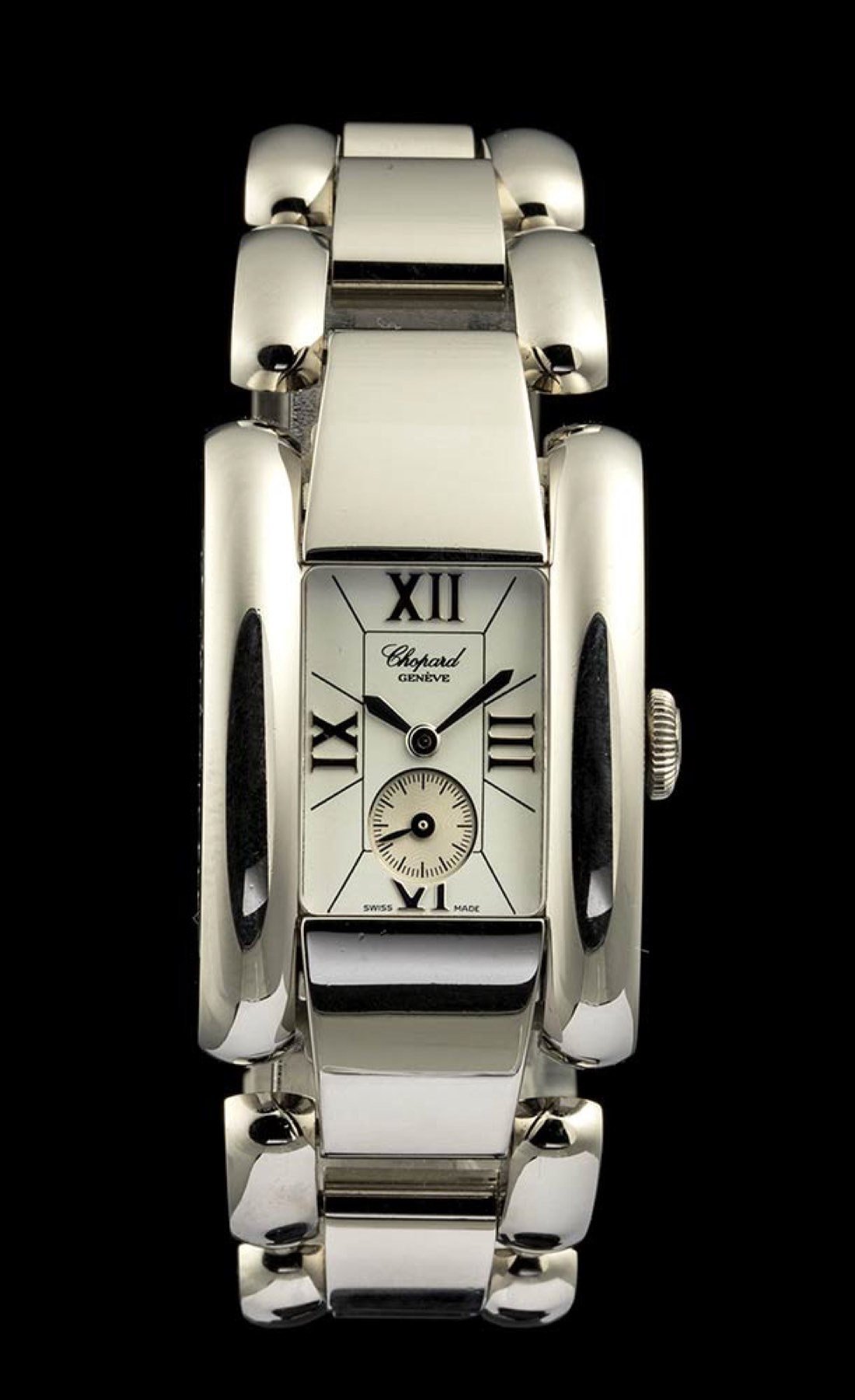 cassa in acciaio, quadrante bianco con indici a numeri romani e bastoni. Movimento al quarzo, ref. 8317. Bracciale in acciaio con chiusura a scomparsa. Cassa 24 x 44 mm, lunghezza 19 cm.