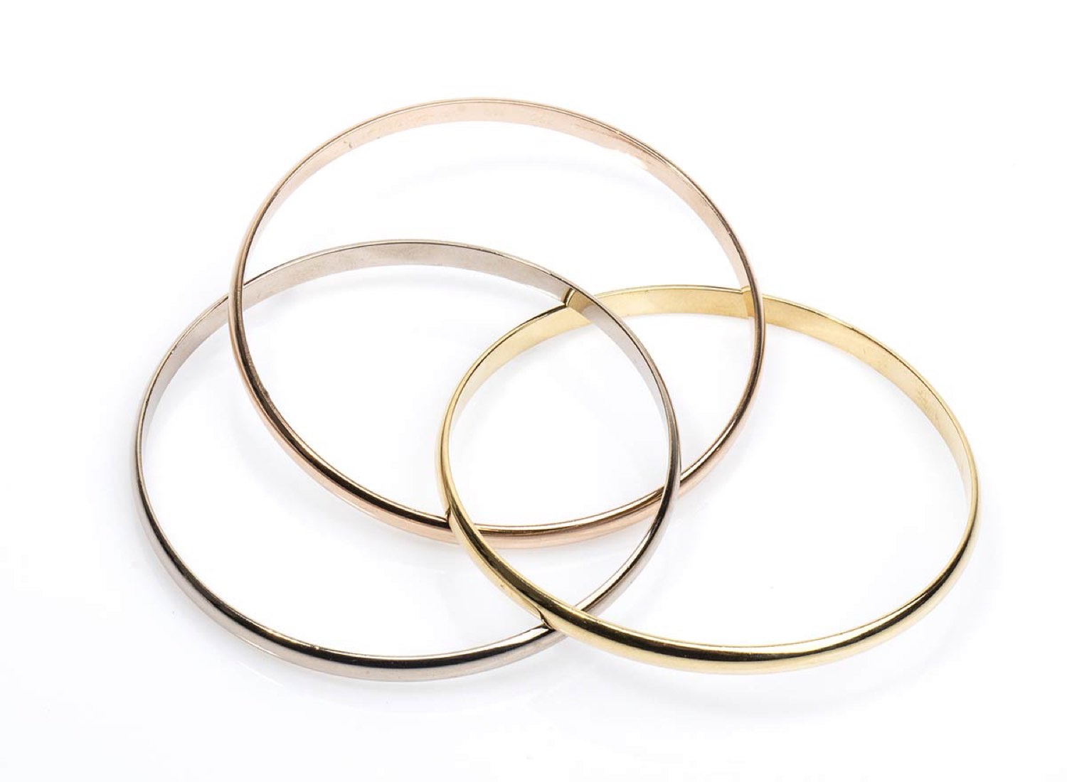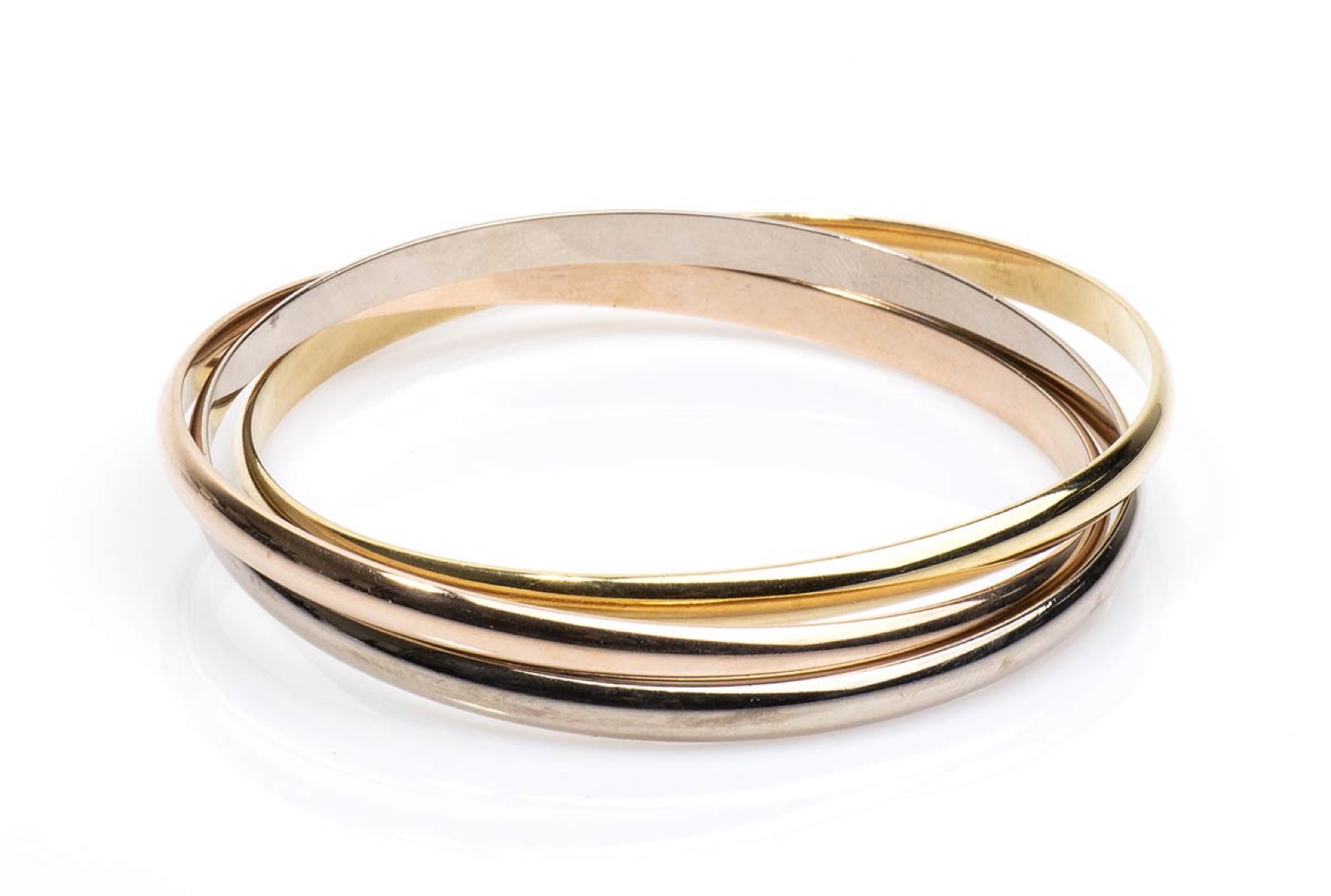 modello "Trinity" in oro giallo, bianco e rosso 18k. Diametro interno 6,5 cm. Peso 59,5 gr. Punzonato "Cartier", "750", "MD", "CARTIER 1997" e "MF642". Stato di conservazione: ***** eccellente.