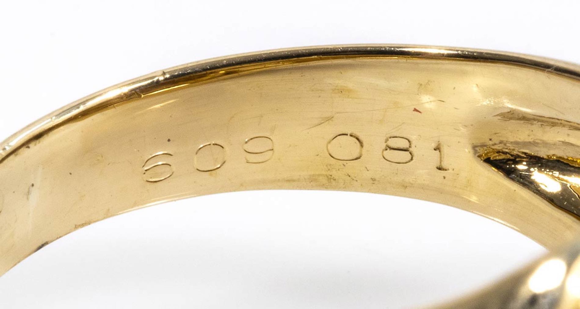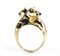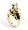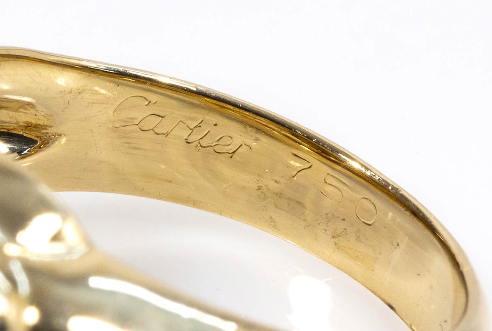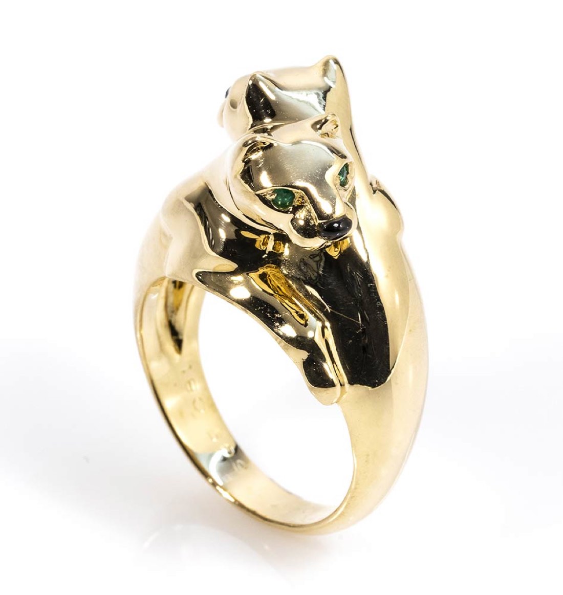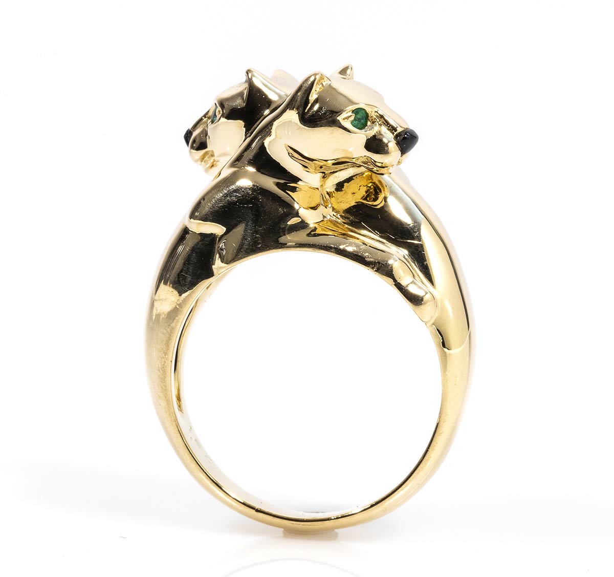 oro giallo 18k, incastonato con smeraldi 0,08 ct circa, ed onice. Fine ed elegante anello dalla collezione "Panthère De Cartier" anni '80. Raffigurante due pantere affiancate, occhi in piccoli smeraldi, naso di onice nera. Punzonato "Cartier", "750", "609081". Peso 14,7 gr. Misura IT 15, misura US 7.