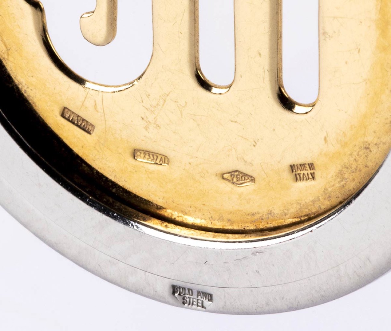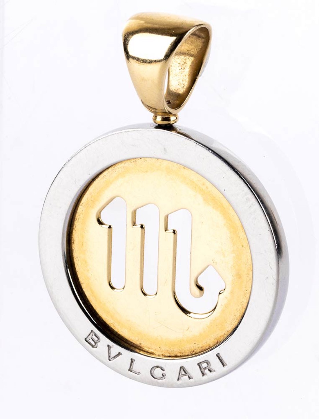 oro giallo 18k e acciaio raffigurante il segno zodiacale dello scorpione, realizzato da BVLGARI. Lunghezza 44 mm. Diametro 32 mm . Punzonato "BULGARI" , "2337 AL", "750" "Made in Italy" e "gold and steel". Peso 12,9 gr. Stato di conservazione: ***** eccellente.