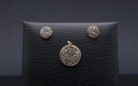 in oro rosa brunito 18k con diamanti taglio brillante. Manifattura "Pomellato", Milano. Diamanti 1,16 ct ca. colore "brown" purezza VVS. Punzonato "750", "469 AL" e "P16001558 ". Diametro orecchini 8 mm. Diametro pendente 13 mm. Peso 6,4 gr. Stato di conservazione: ***** eccellente.