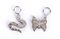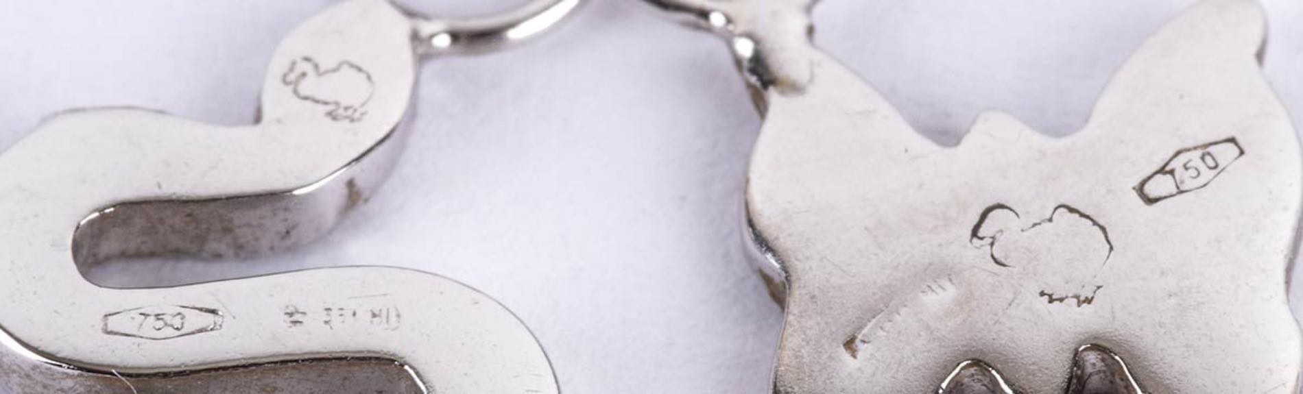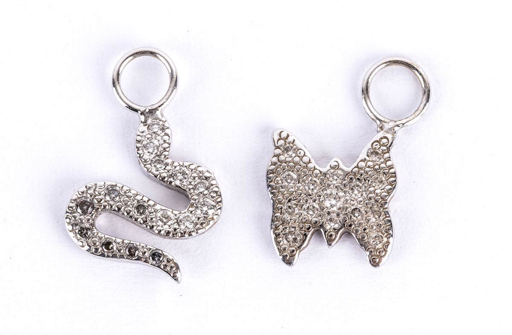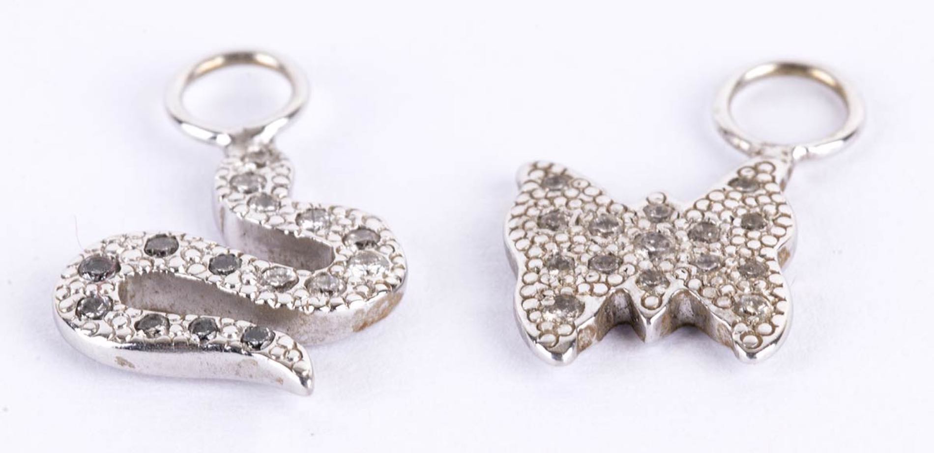 oro bianco 18k, incastonati con pavé di diamanti taglio brillante bianchi e brown 0,35 ct circa. Manifattura DODO POMELLATO. Punzonati "750", "351 MI" e firma. Dimensioni pendente a forma di serpente 15 x 11 mm, peso 0,90 gr. Dimensioni pendente a forma di farfalla 15 x 11 mm. Peso 0,93 gr. Stato di conservazione: ***** eccellente.