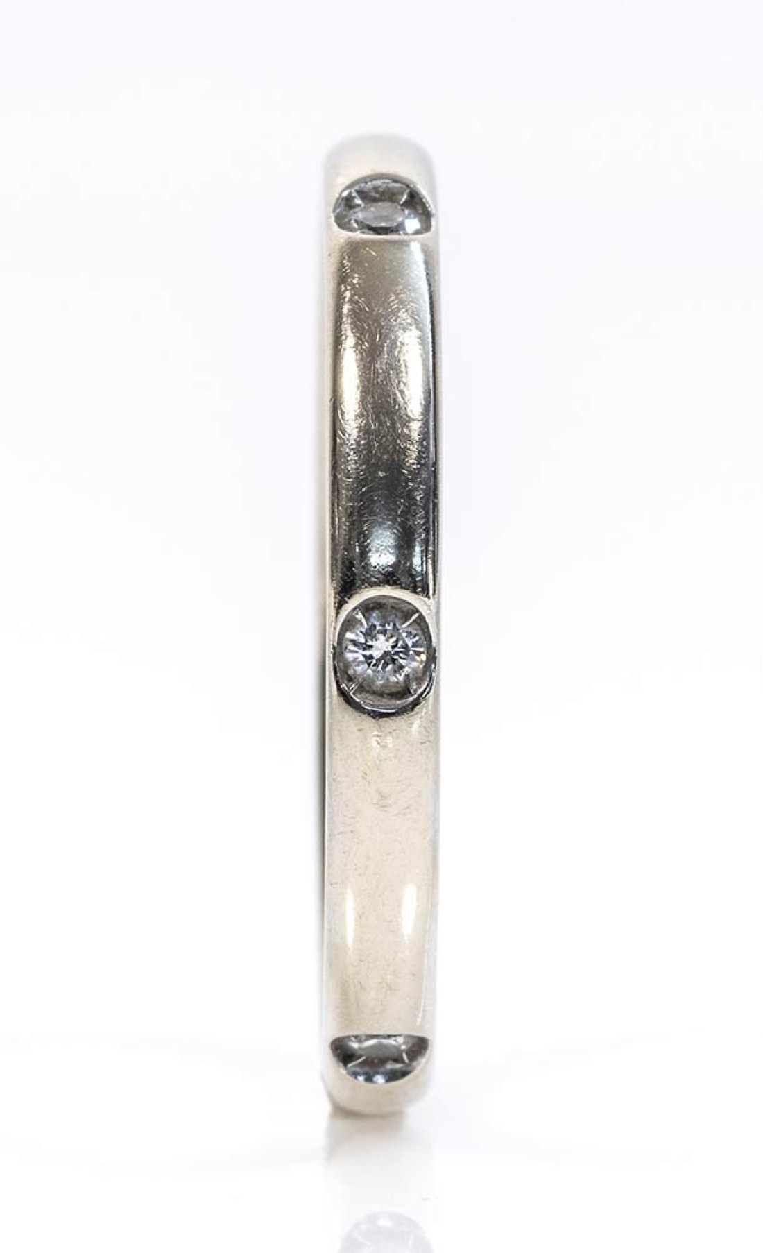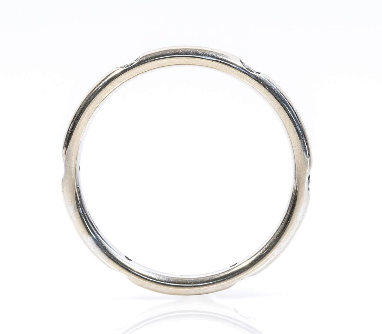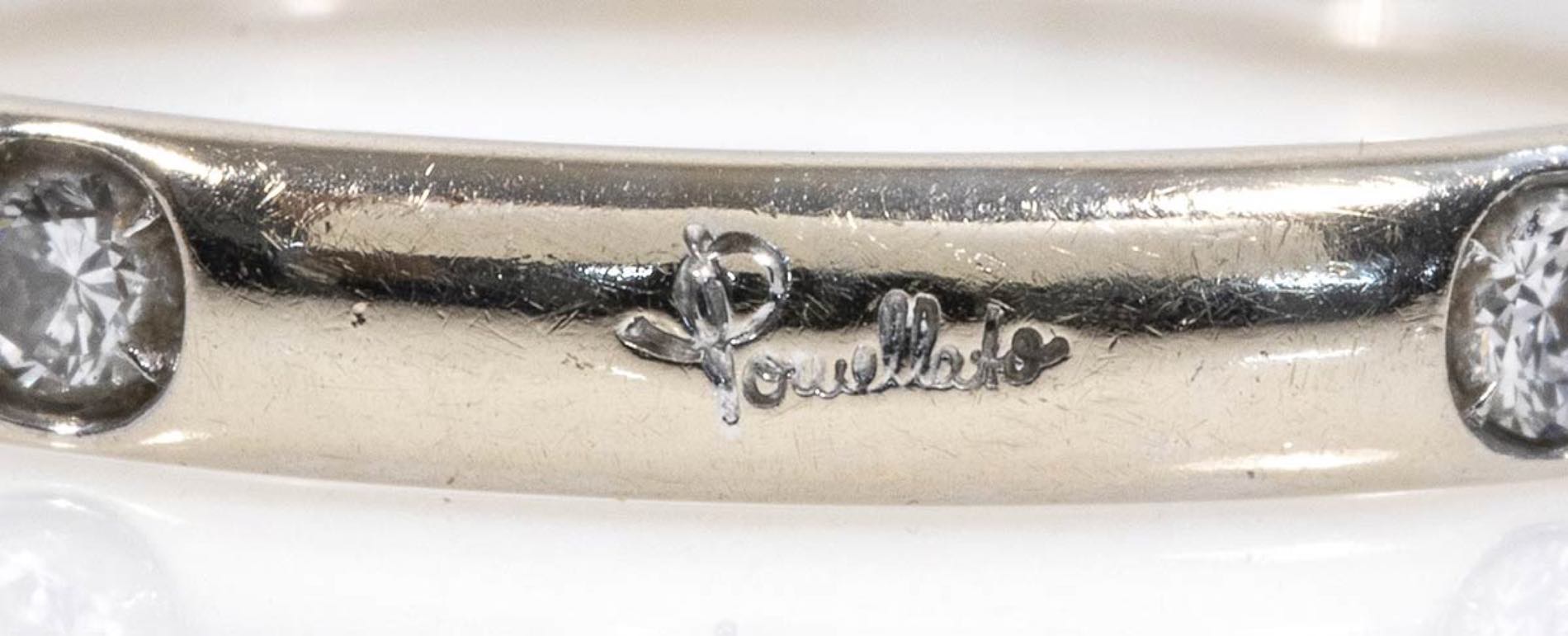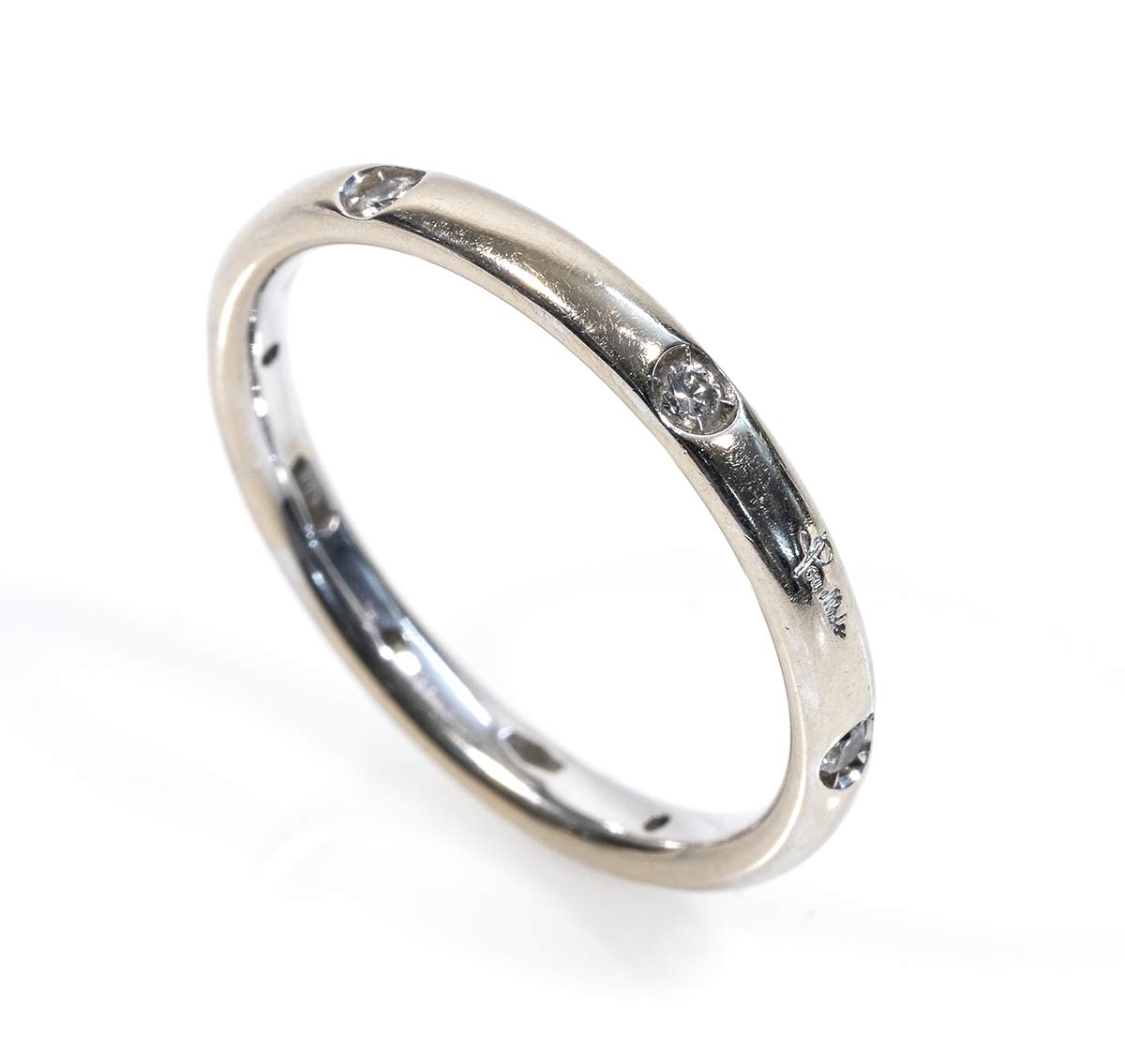 oro giallo 18k, incastonato con diamanti taglio brillante 0,13 ct circa, F-G, VVS-VS. Manifattura POMELLATO, collezione "LUCCIOLE". Larghezza 2,5 mm. Misura IT 16, misura US 7,5. Punzonato "Pomellato ", "750" e "1819 MI". Peso 2,9 gr. Stato di conservazione: ***** eccellente.