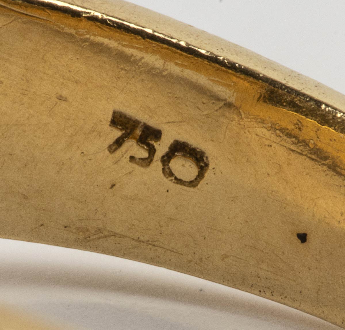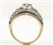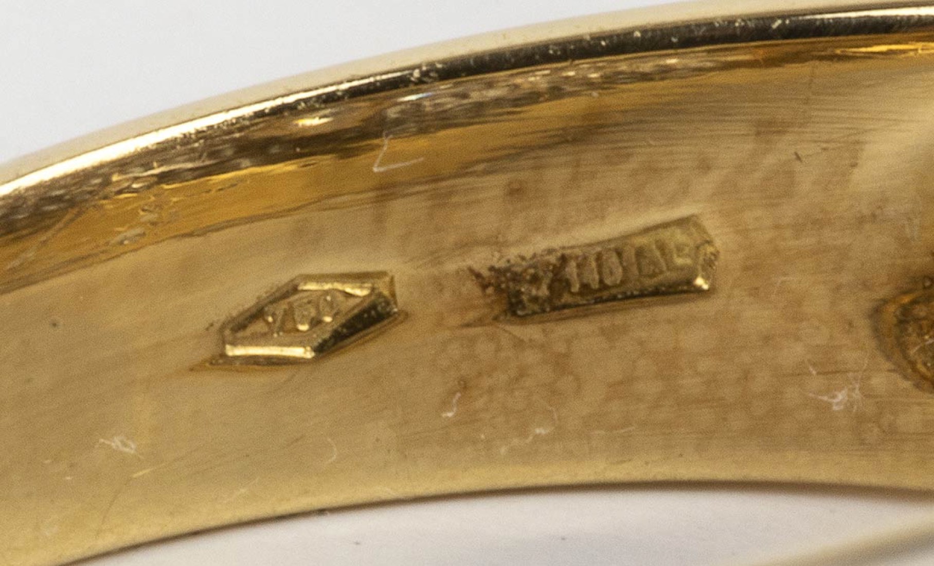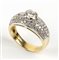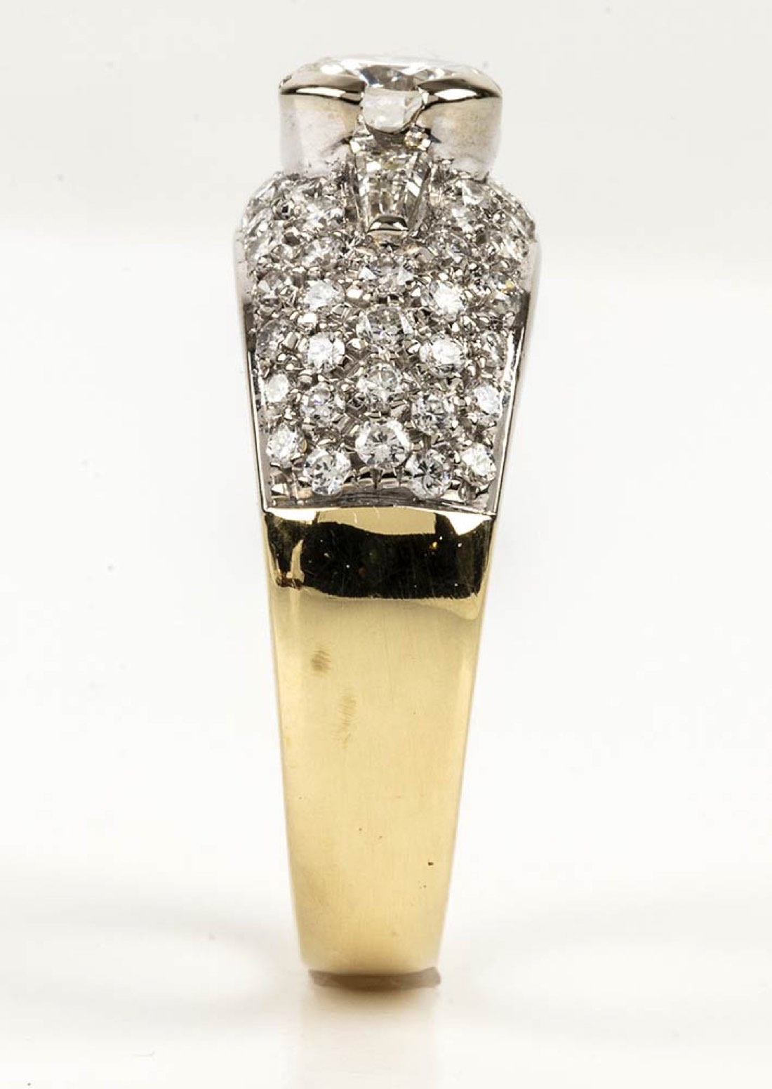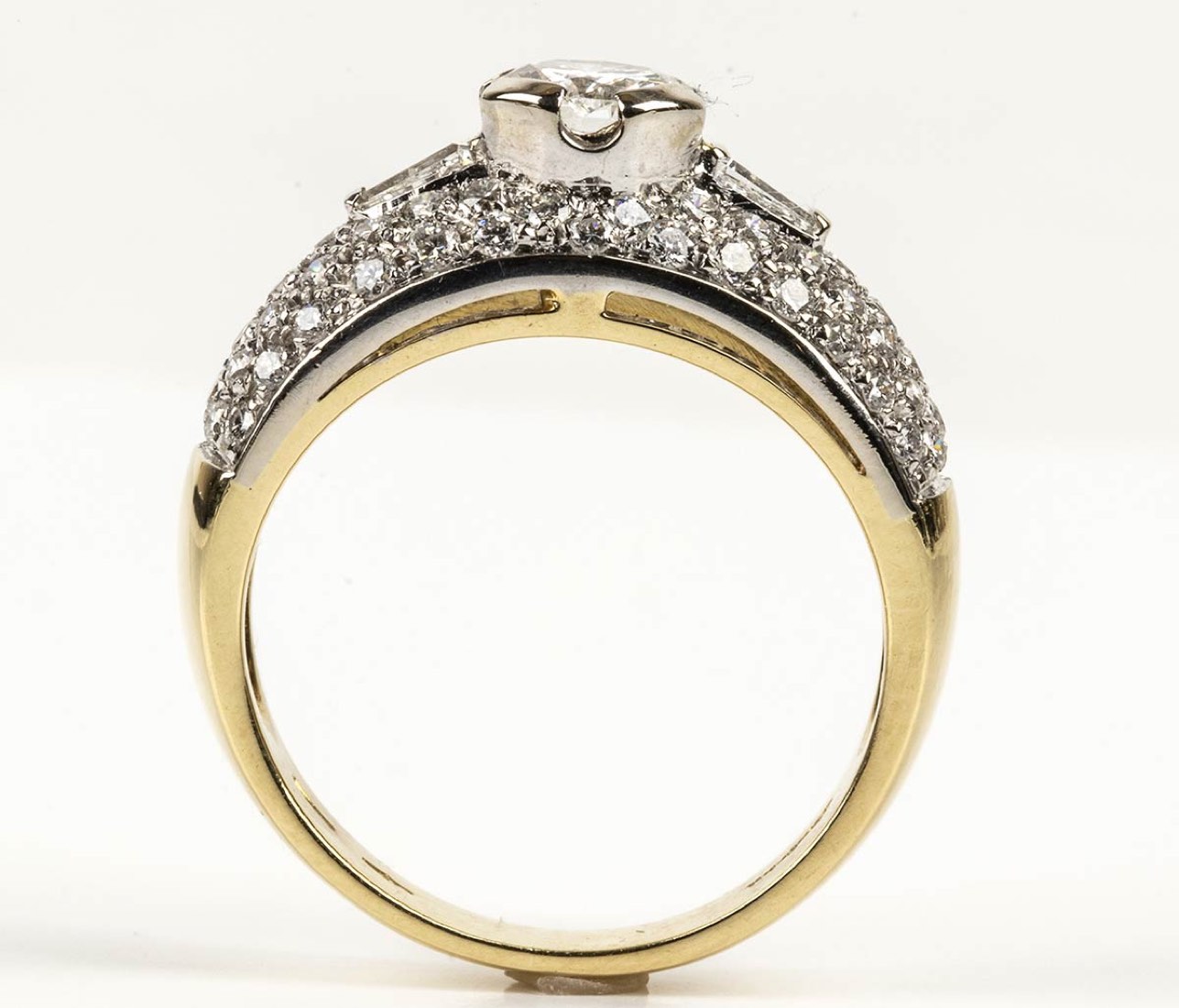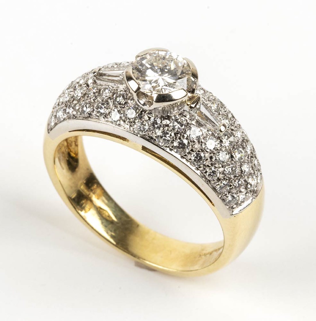 oro giallo e bianco 18k, incastonato con centrale diamante taglio brillante 0,60 ct circa, affiancato da coppia di diamanti taglio tapered 0,20 ct circa e contornati da pavé di diamanti 0,60 ct. G, VVS. Manifattura SALVINI. Punzonato "1463 AL", "750" e "Salvini". Dimensioni fronte 9 x 21 mm. Misura IT 14 - misura US 7,5. Peso 7 gr. Stato di conservazione: ***** eccellente.