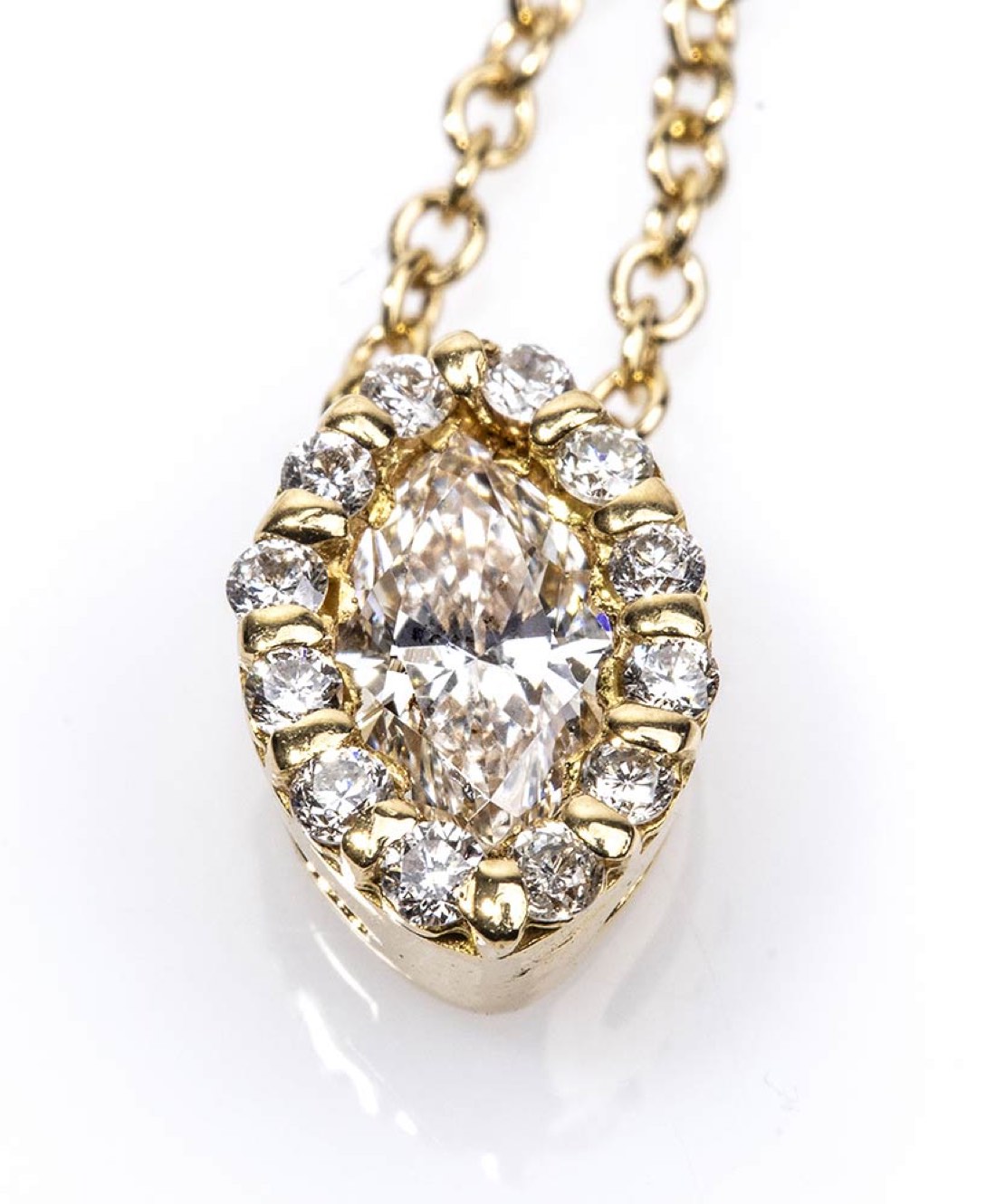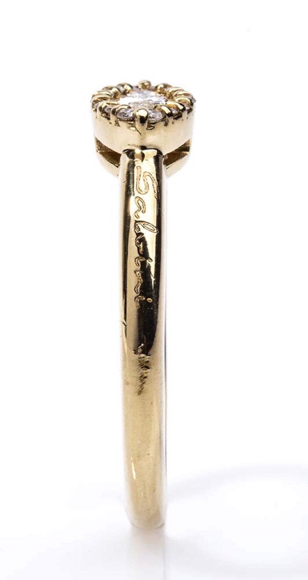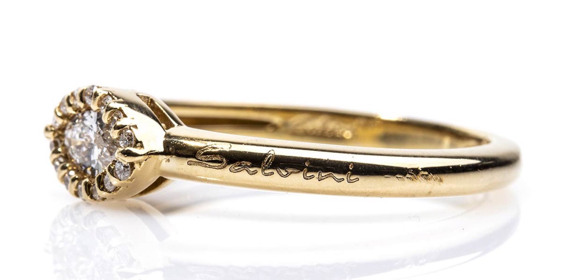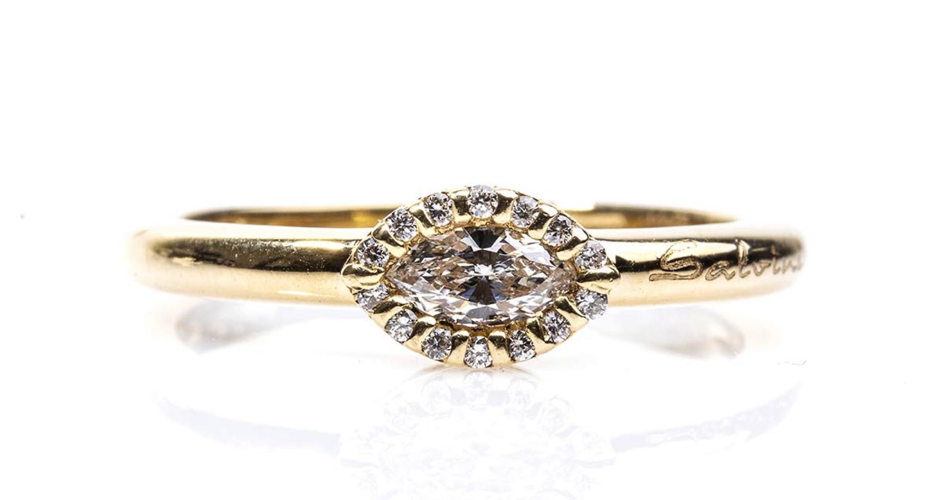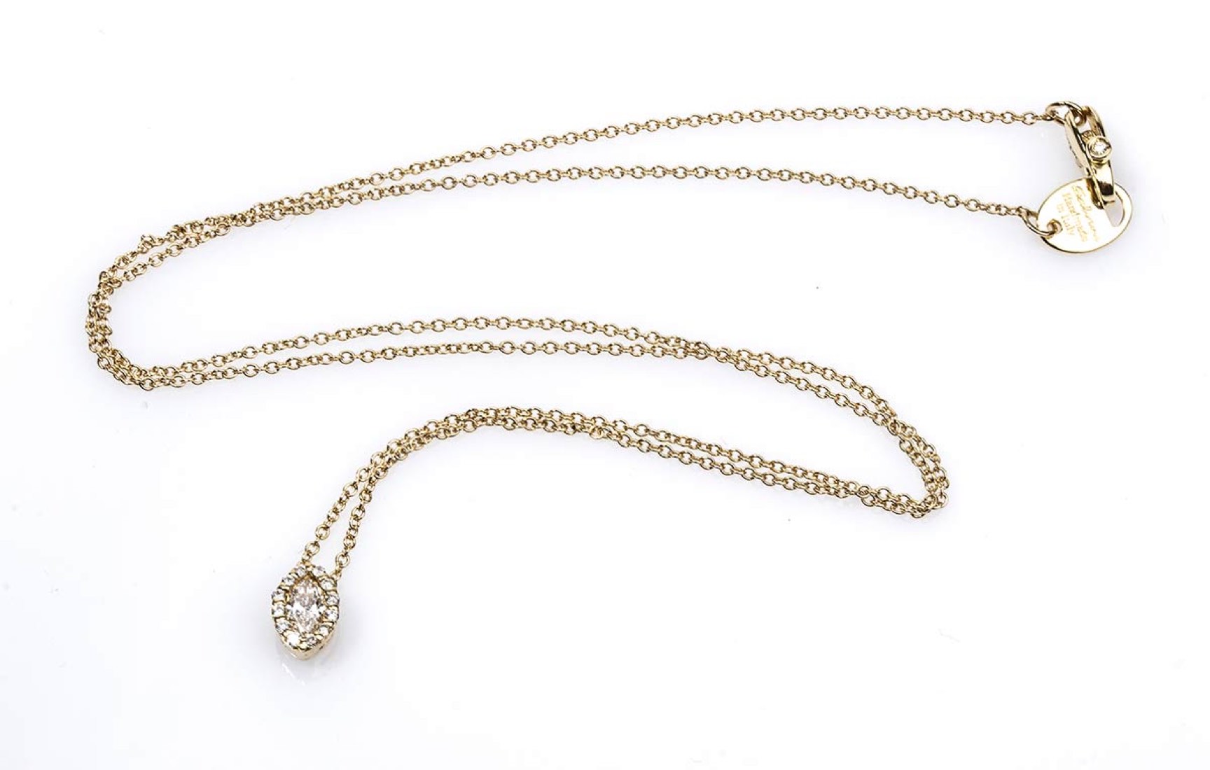oro giallo 18k impreziositi con diamanti taglio navetta e taglio brilliante 0,46 ct circa, F-G, VVS. Punzonato "Salvini", "750", "Made in Italy", "3181 AL" e "Handmade in Italy". Lunghezza collana 43 cm. Peso 2,2 gr. Misura anello IT 15 - Misura anello US 7. Peso 3,7 gr. Stato di conservazione: ***** eccellente.