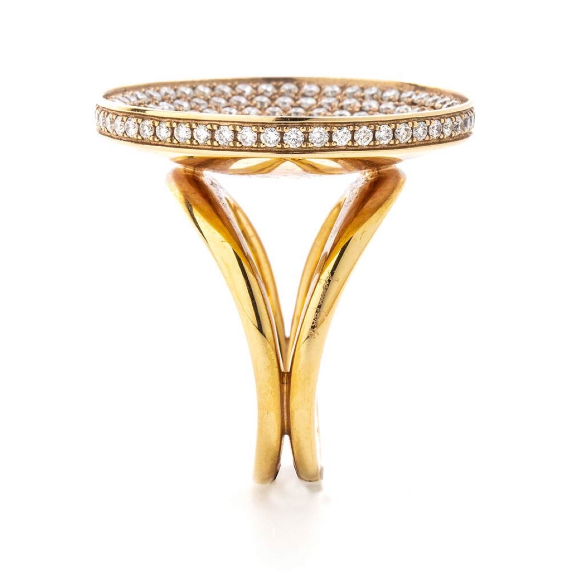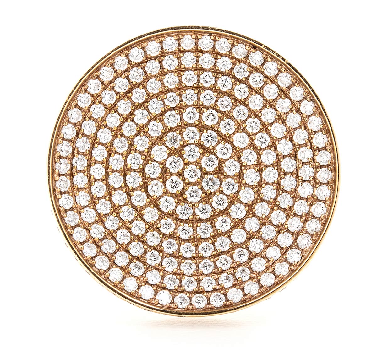oro rosa 18k, incastonato con pavé di diamanti di forma rotonda taglio brillante 2,60 ct circa, G, VVS. Firmato "Gianni Carita'" e punzonato "750" e "1826 NA'". Dimensioni fronte 27 x 27 mm. Peso 21,7 gr. Misura IT 15 - Misura US 7,25. Stato di conservazione: ***** eccellente.