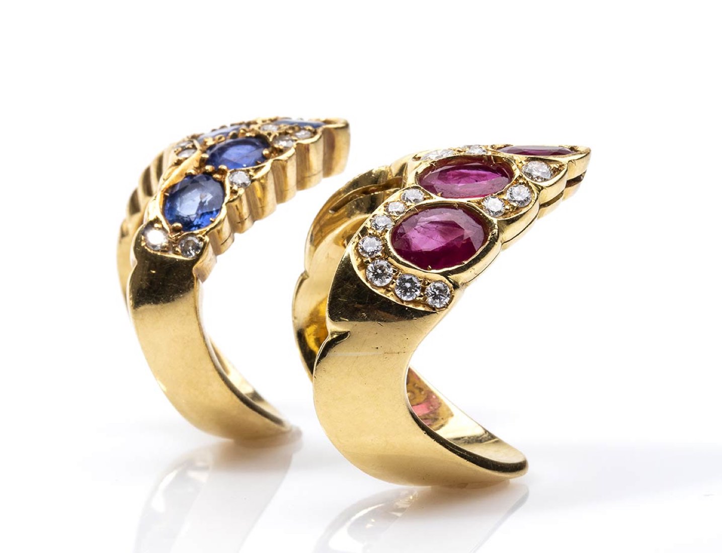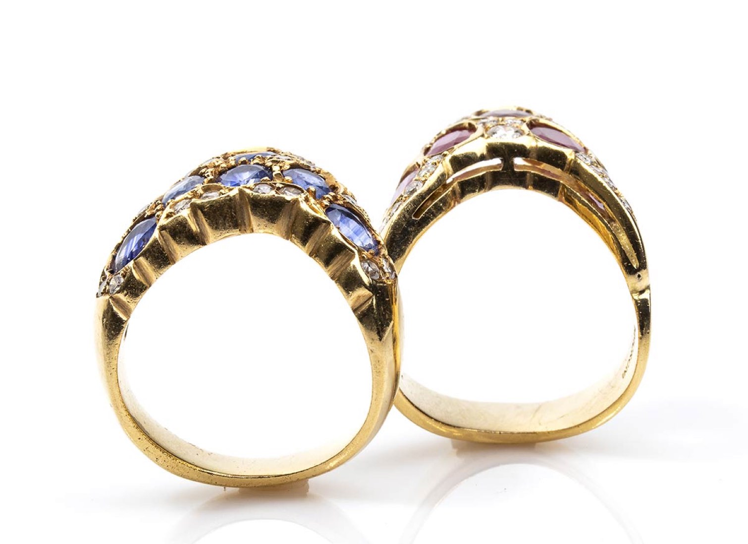Coppia di anelli in oro con rubini, zaffiri e diamanti, manifattura FILIPPO MORONI