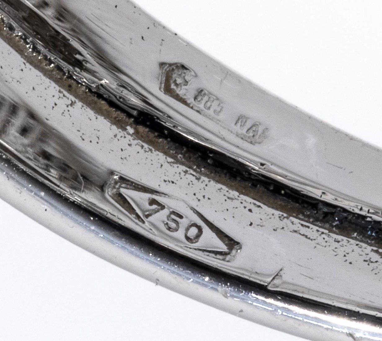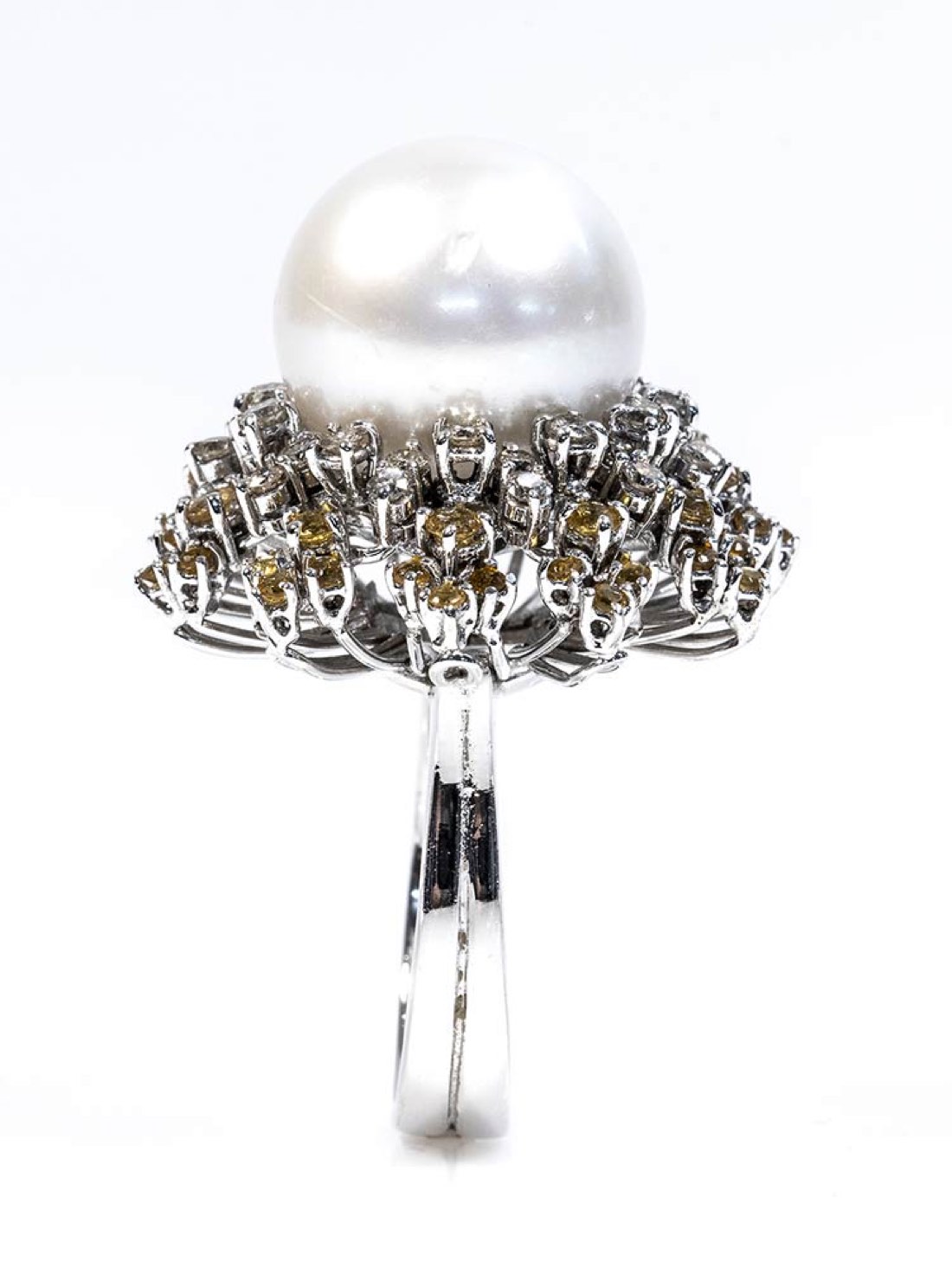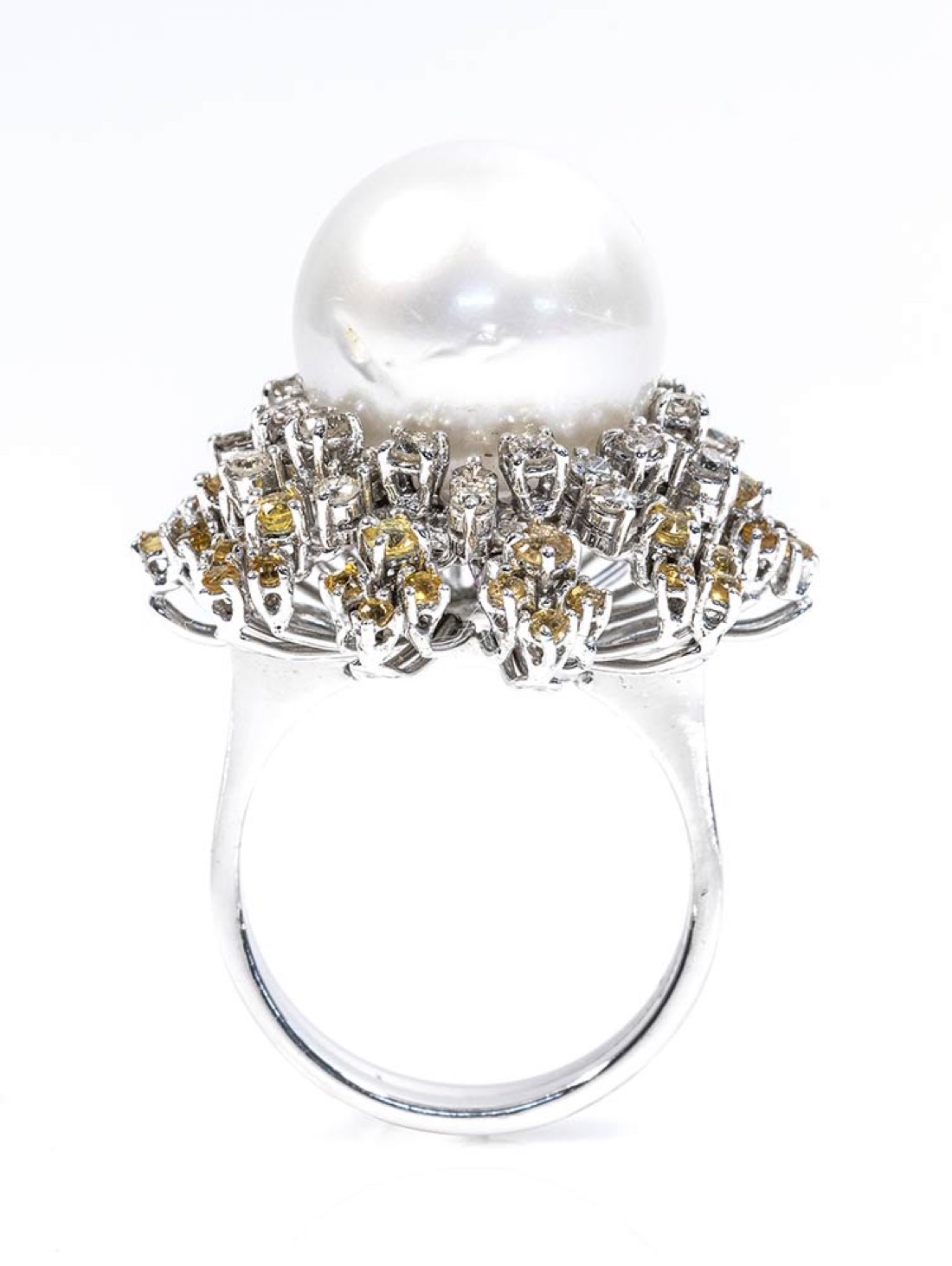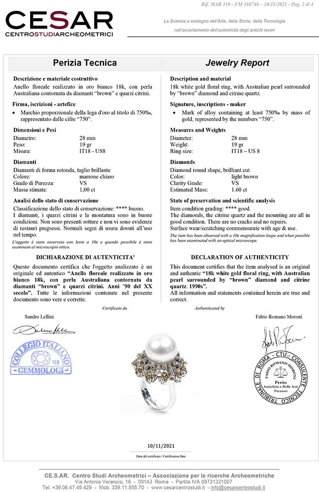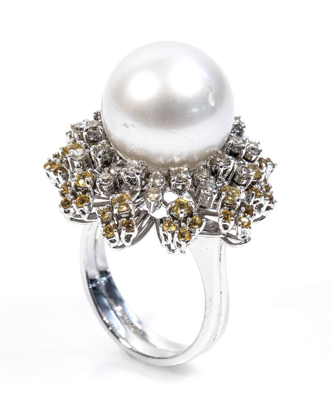 oro bianco 18k, con perla Australiana contornata da diamanti taglio brillante 1,60 ct circa, colore brown, purezza VS e quarzi citrini. Diametro perla 15 mm. Misura IT 18 - Misura US 8. Punzonato "750" e "885 NA". Peso 18,8 gr. Stato di conservazione: ***** eccellente. Accompagnato da certificato di verifica gemmologica Ce.S.Ar. Centro Studi Archeometrici.