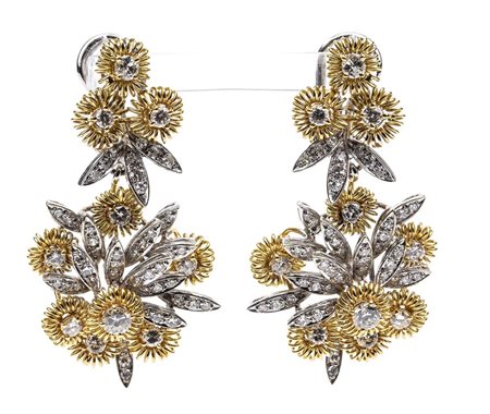 oro giallo e bianco 18K, di forma floreale, realizzati a mano in Italia. Incastonati con diamanti taglio brilliante 3,20 ct circa, G-H, VVS-VS. Dimensioni 5 x 2,5 cm. Peso 21,7 gr. Stato di conservazione: ***** eccellente.