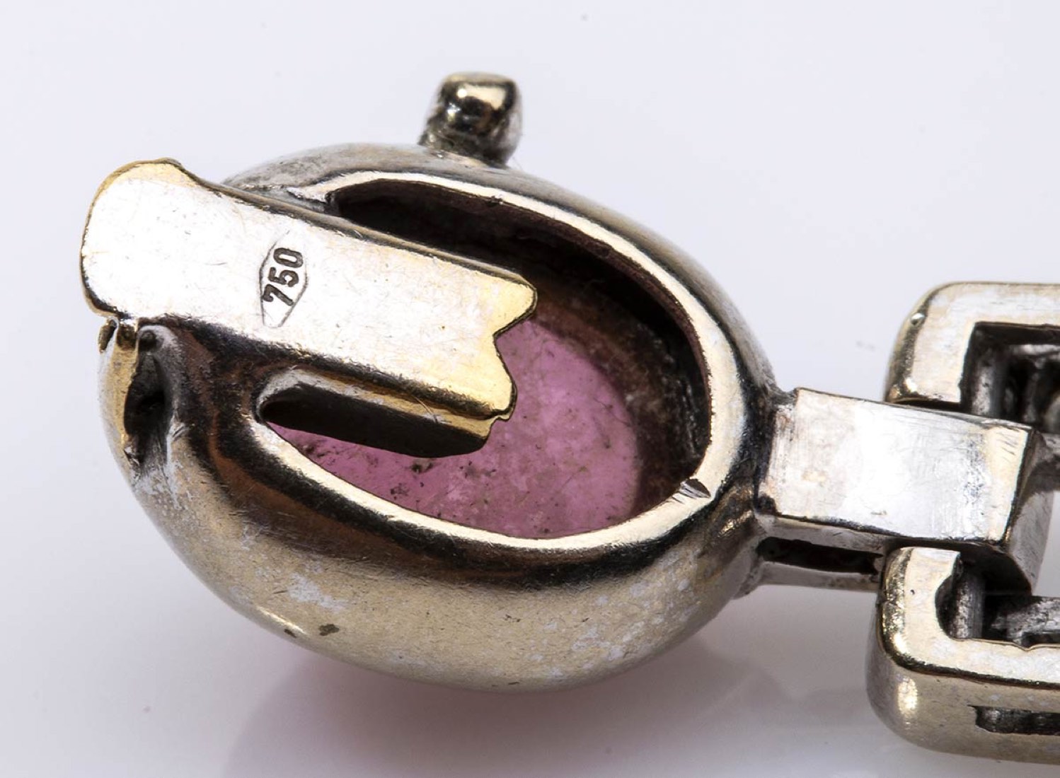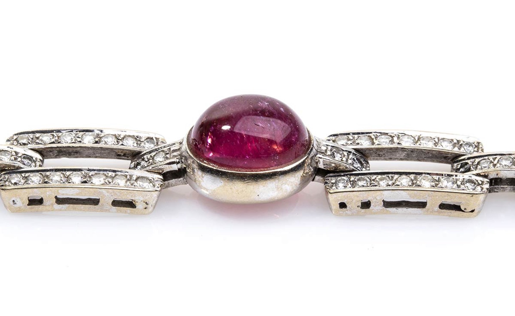 oro bianco 18k. Punzonato "750". Rubellite taglio cabochon 9,00 ct circa, diamanti taglio brilliante 1,44 ct circa, H-I, VVS-VS. Lunghezza 18 cm, larghezza 1 cm. Peso 26,3 gr. Stato di conservazione: ***** eccellente.