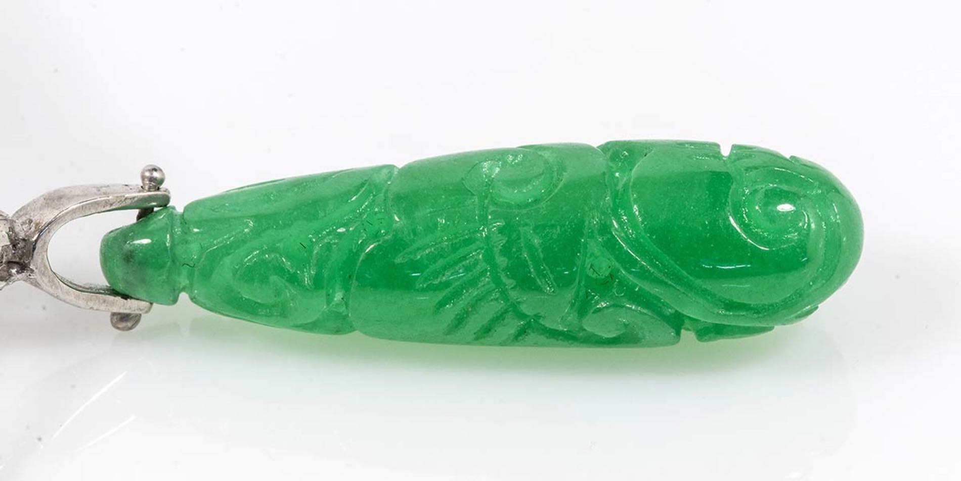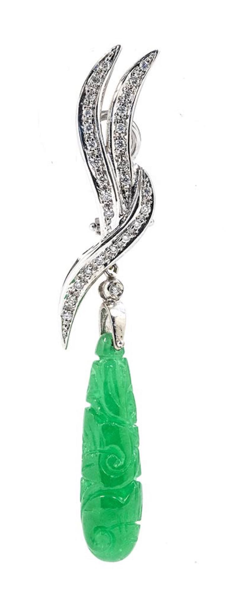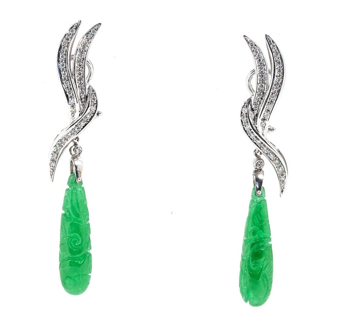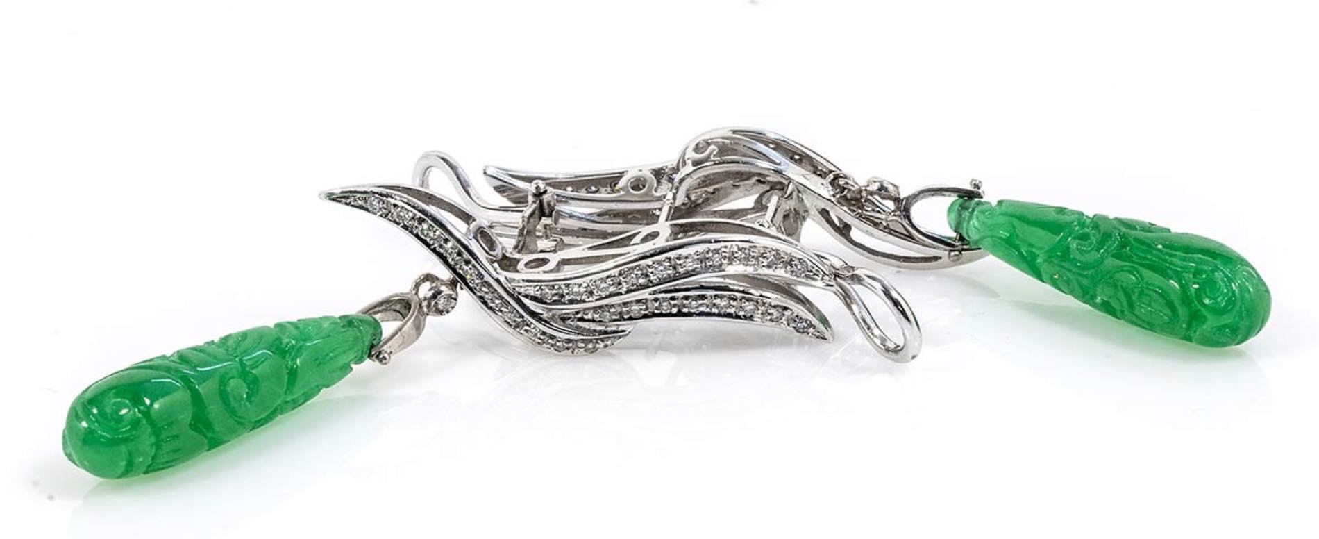 oro bianco 18k, con pendenti a goccia di colore verde sormontati da diamanti taglio brillante 0,60ct circa, G, VVS. Punzonati "750". Dimensioni fronte 65 x 10 mm. Peso 17,9 gr. Stato di conservazione: ****** eccellente