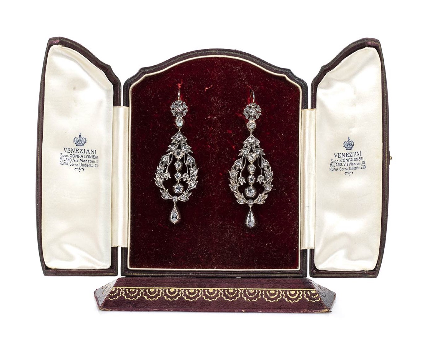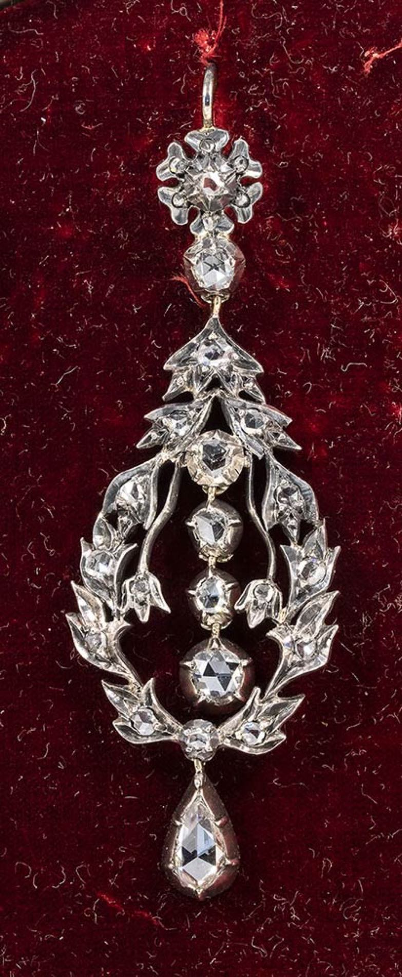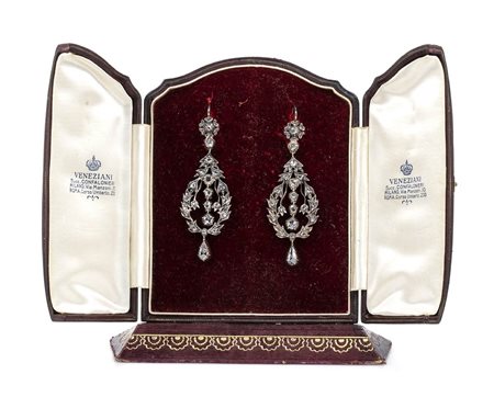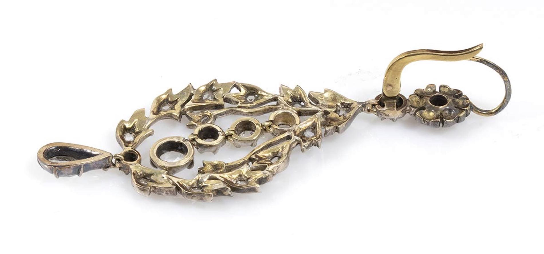 argento e oro 18k, con diamanti taglio a rosa 1,10 ct circa. Dimensioni fronte 72 x 25 mm. Peso 17,9 gr. Stato di conservazione: **** buono.