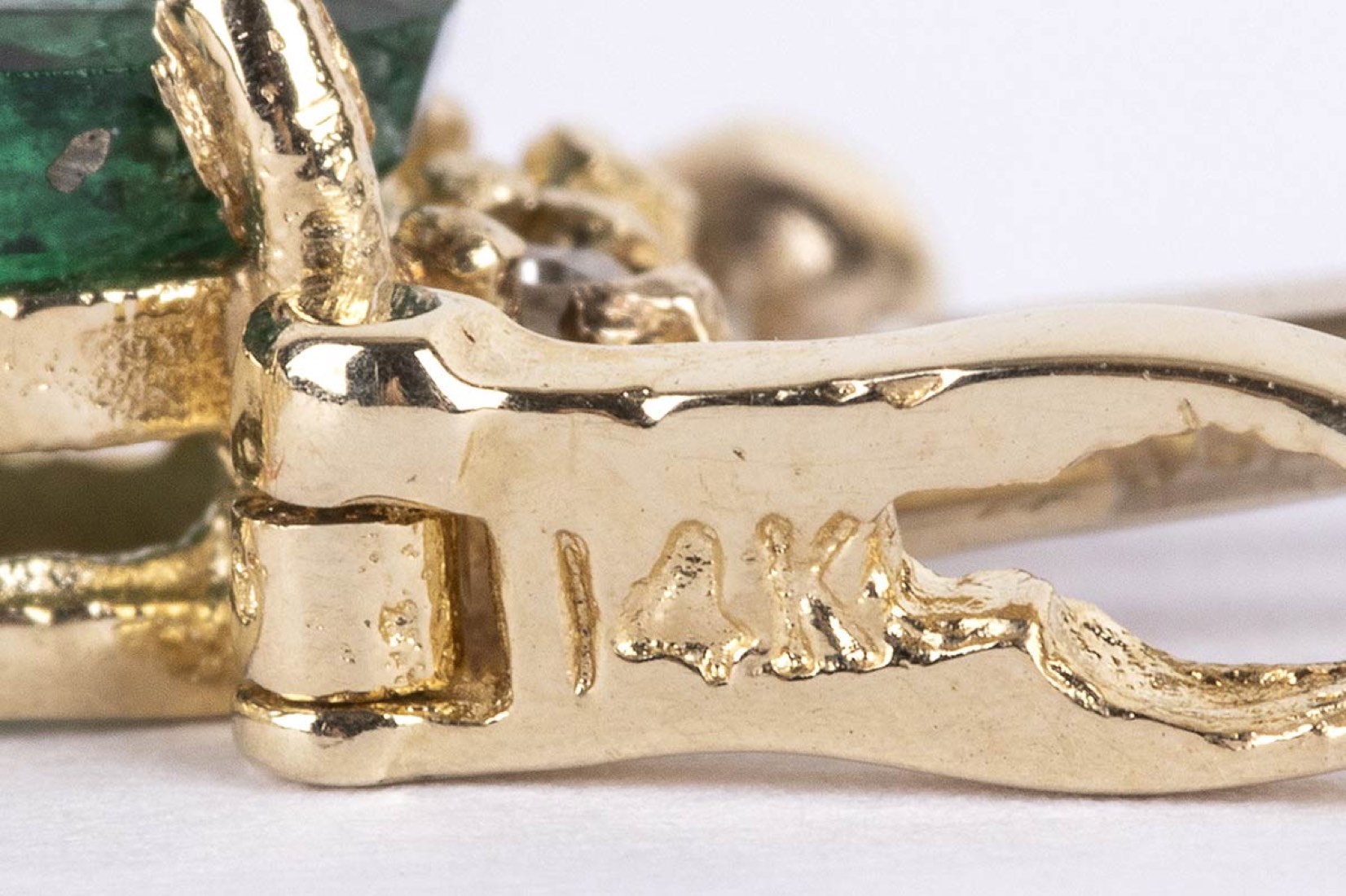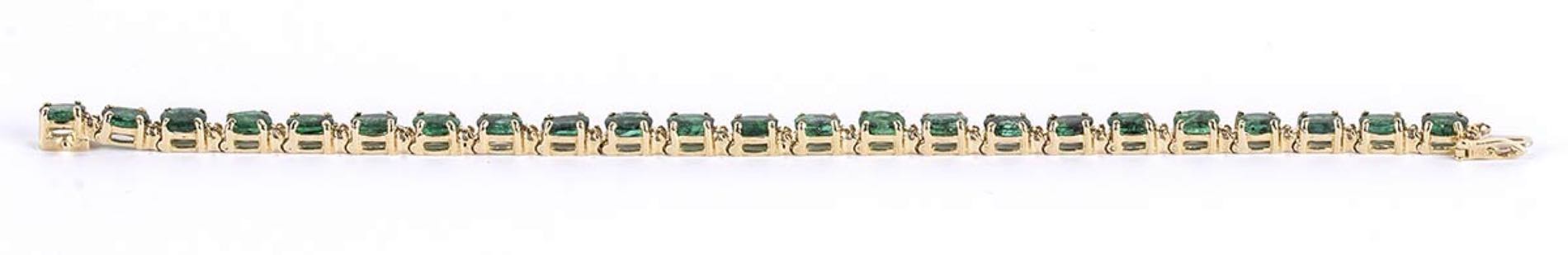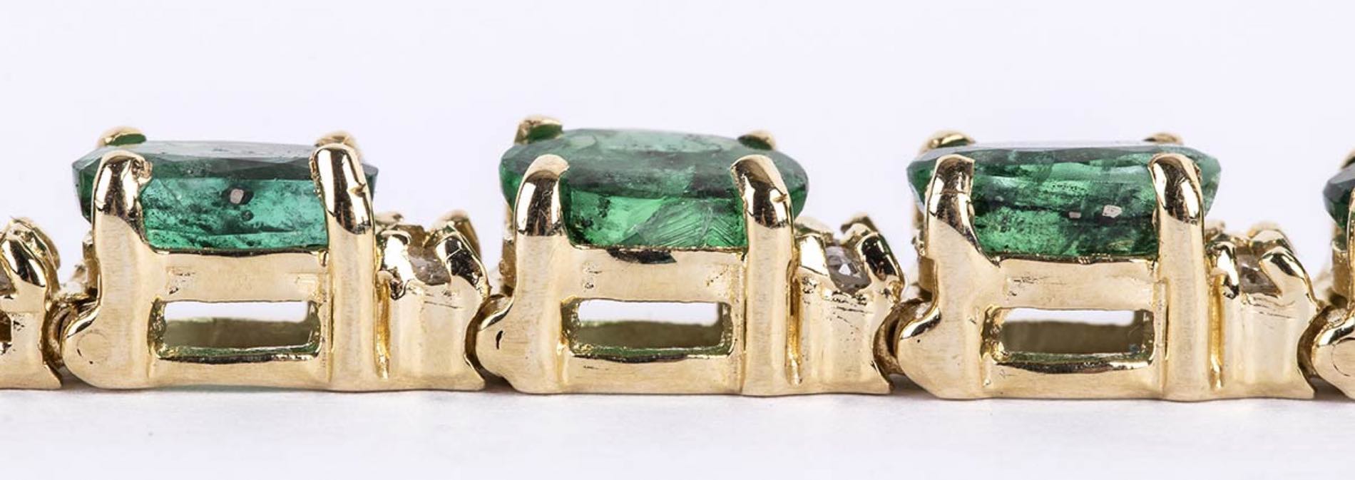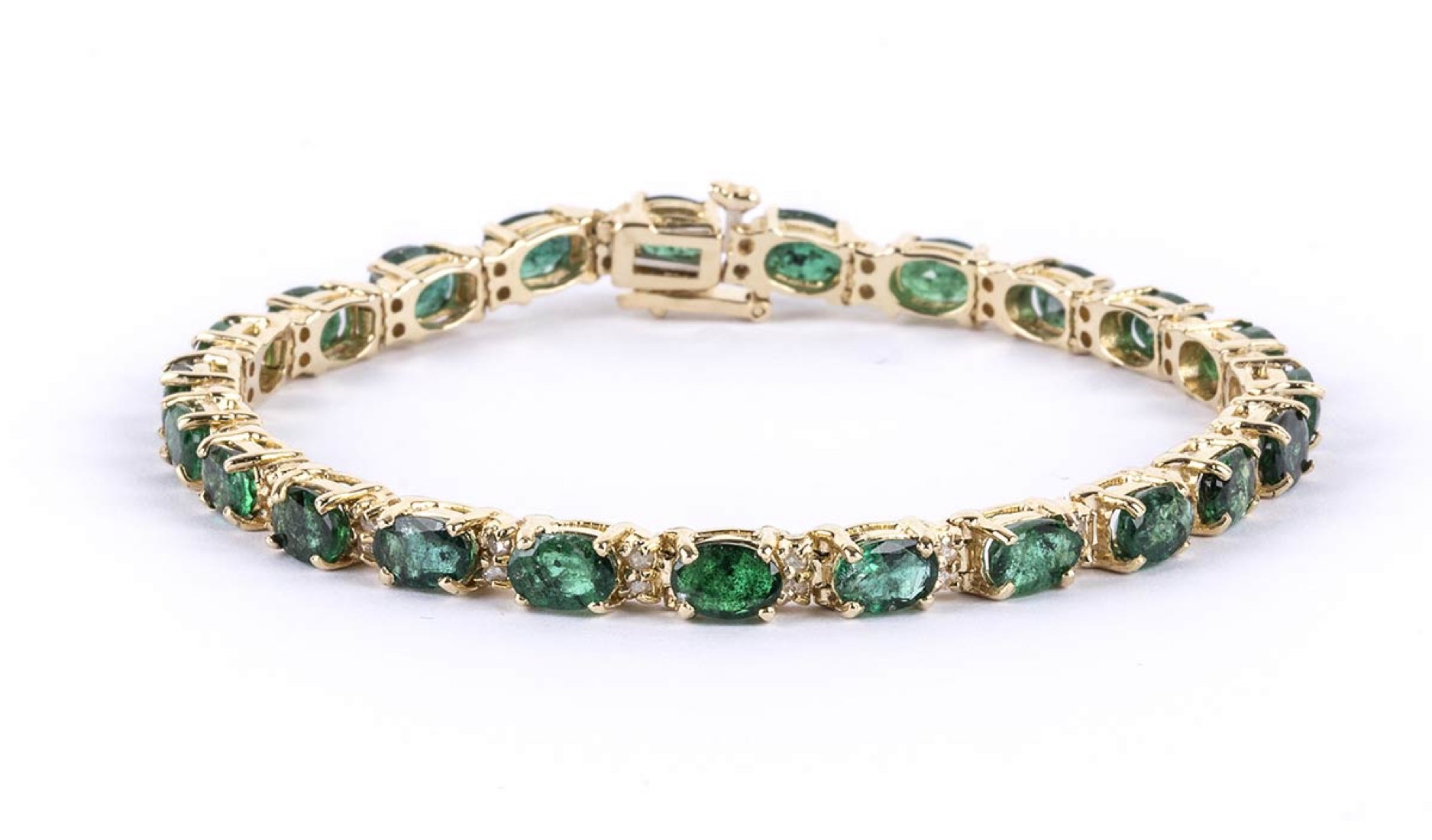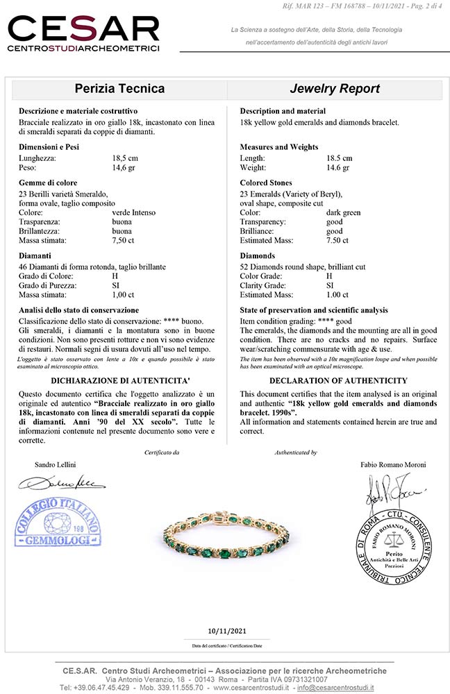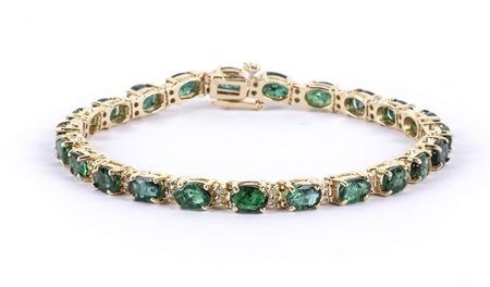 oro giallo 14k, incastonato con linea di smeraldi 7,50 ct circa e diamanti taglio brillante 1,00 ct circa, H, SI. Lunghezza 18,5 cm. Peso 14,6 gr. Punzonato "14 k". Stato di conservazione: ***** eccellente. Accompagnato da certificato di verifica gemmologica Ce.S.Ar. Centro Studi Archeometrici.