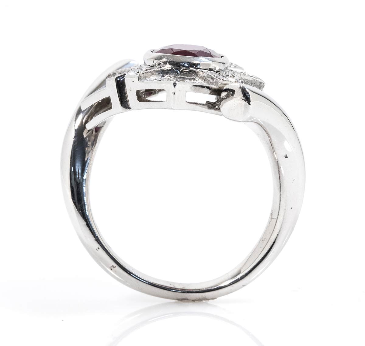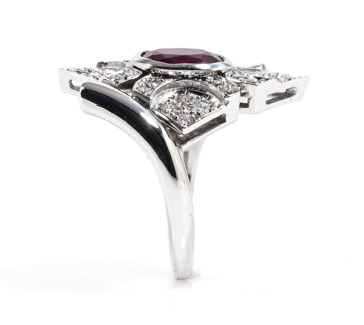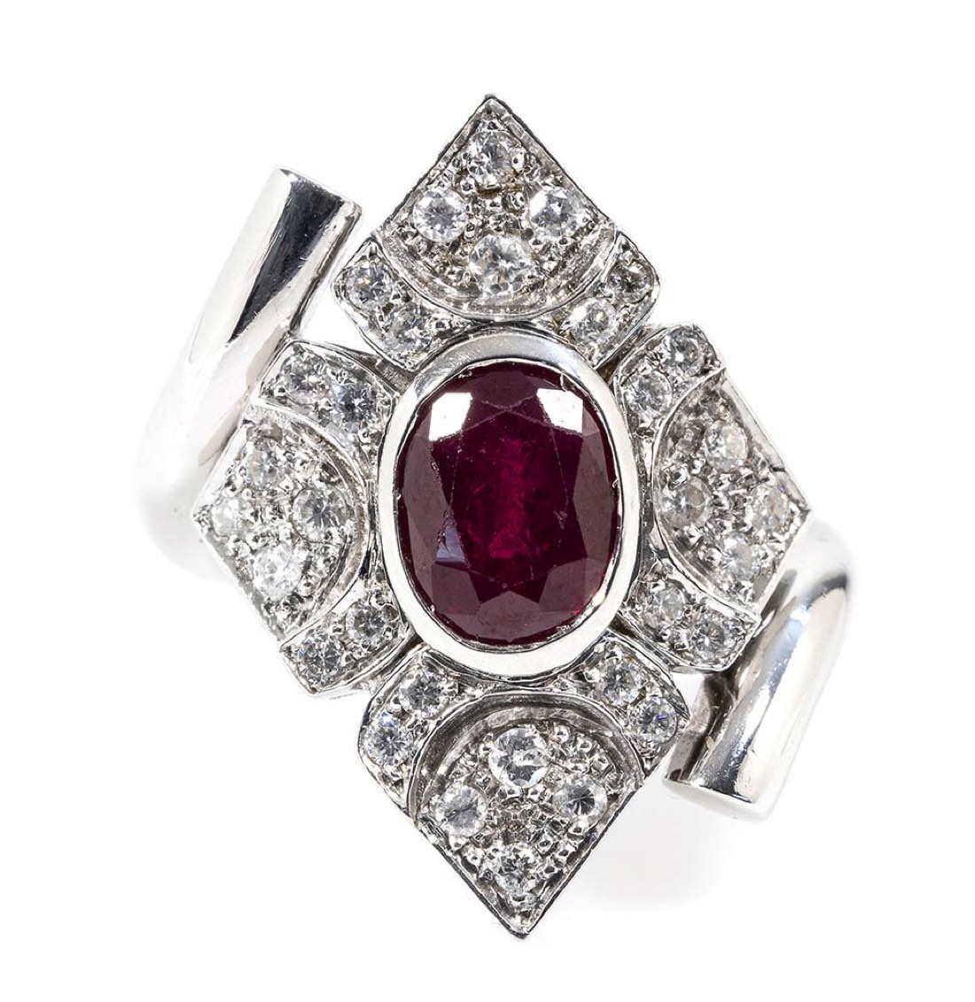 oro bianco 18k, motivo geometrico, incastonato con rubino sintetico e diamanti taglio brillante 0,75 ct circa, I-J, VS-SI. Punzonato "750". Dimensioni fronte 21 x 27 mm. Misura IT 16 - Misura US 7,5. Peso 12,2 gr. Stato di conservazione: **** buono. Accompagnato da certificazione di analisi dell' "Istituto Gemmologico nazionale", Roma.