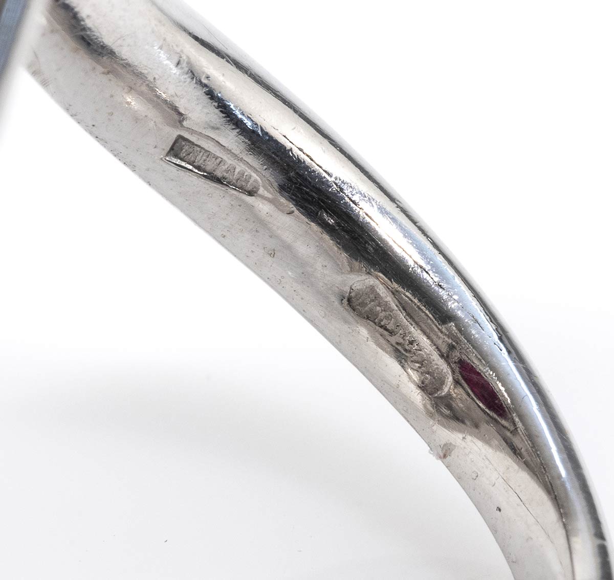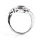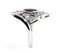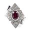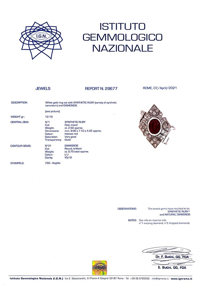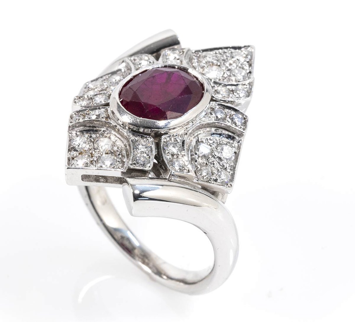 oro bianco 18k, motivo geometrico, incastonato con rubino sintetico e diamanti taglio brillante 0,75 ct circa, I-J, VS-SI. Punzonato "750". Dimensioni fronte 21 x 27 mm. Misura IT 16 - Misura US 7,5. Peso 12,2 gr. Stato di conservazione: **** buono. Accompagnato da certificazione di analisi dell' "Istituto Gemmologico nazionale", Roma.