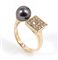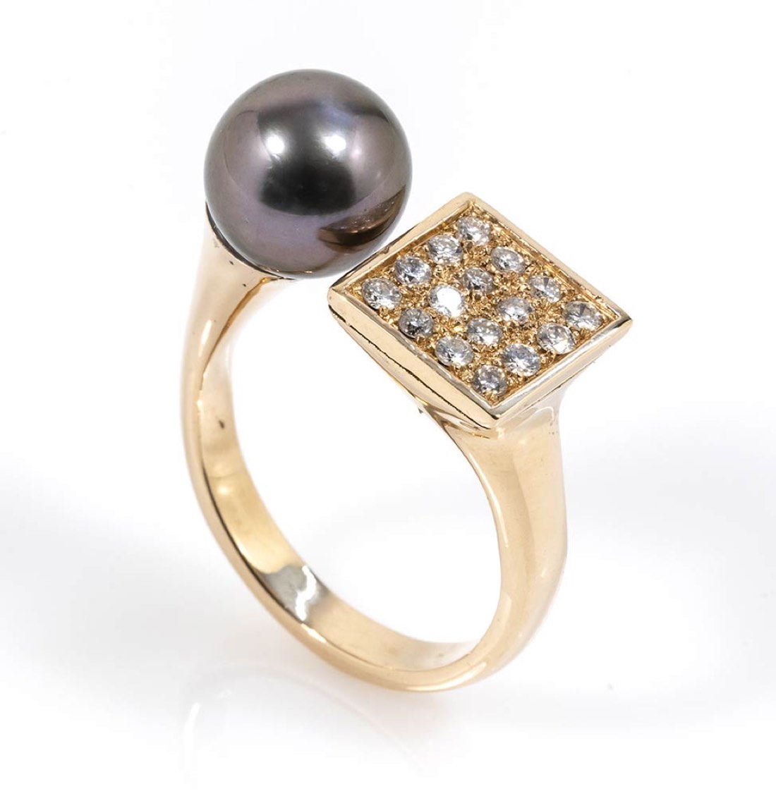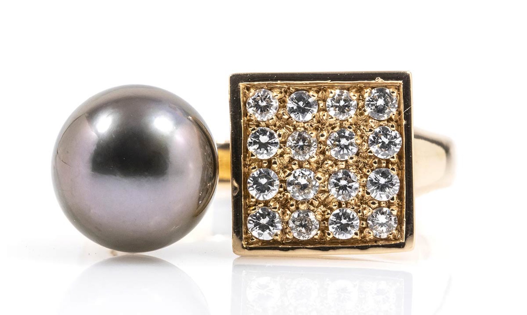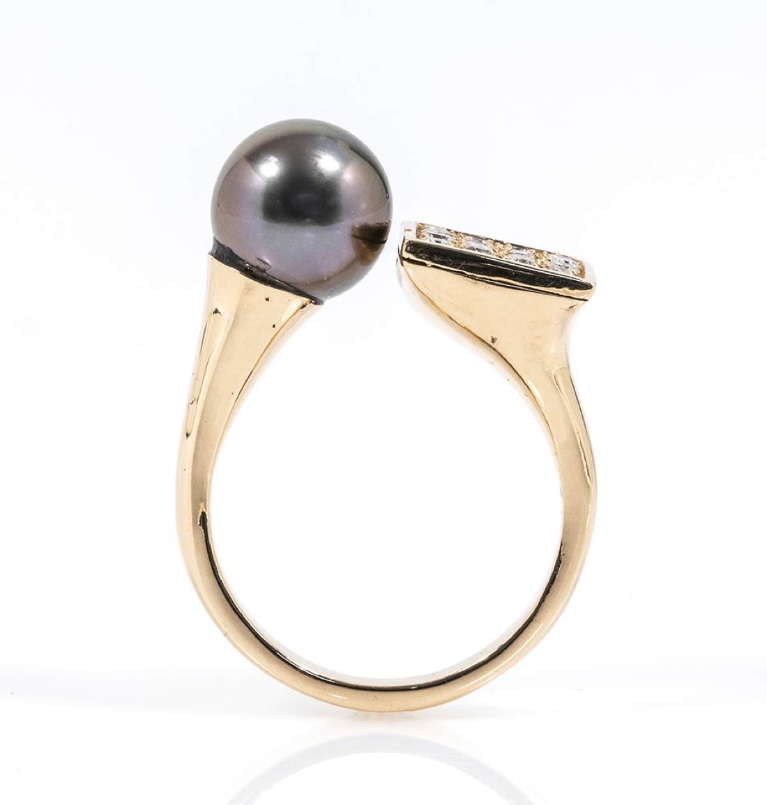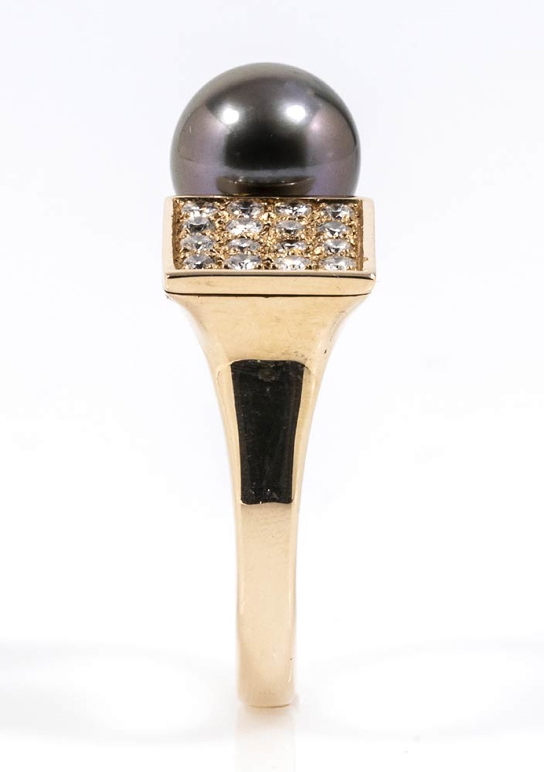 oro rosa 18k, motivo contrarié con perla Tahiti e diamanti taglio brillante 0,32 ct circa, G, VVS. Diametro perla 9 mm. Dimensioni fronte anello 20 x 10 mm. Misura IT 15 - Misura US 7,5. Peso 78,2 gr. Stato di conservazione: **** buono.