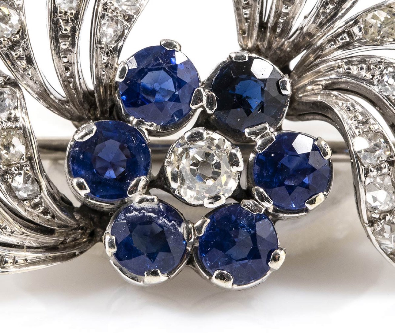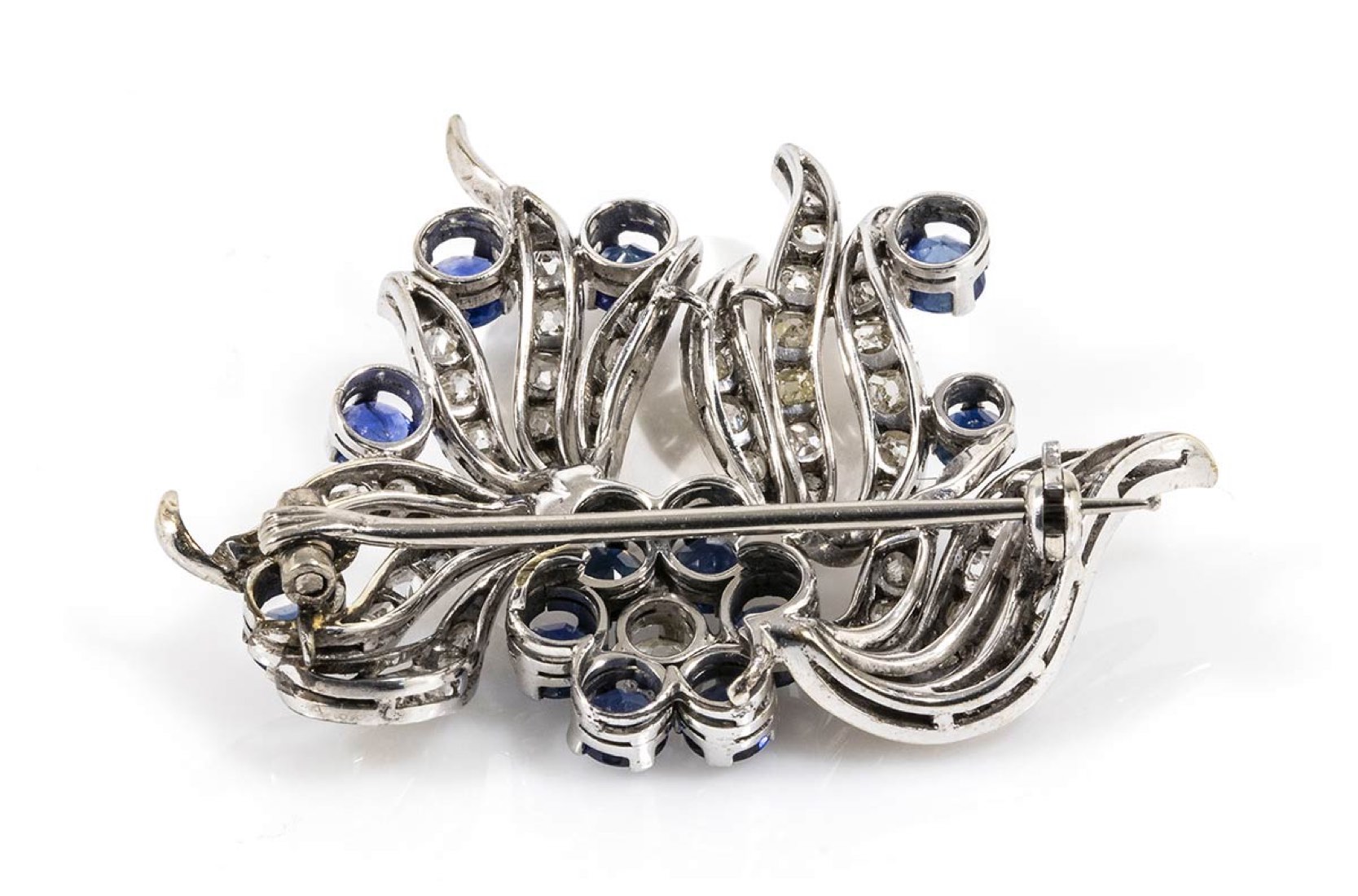 oro bianco 18k, incastonata con diamanti taglio vecchio europeo 3,90 ct circa, e zaffiri 2,80 ct circa. Dimensioni fronte 50 x 35 mm. Peso 13,8 gr. Stato di conservazione: ***** eccellente.