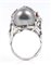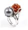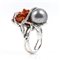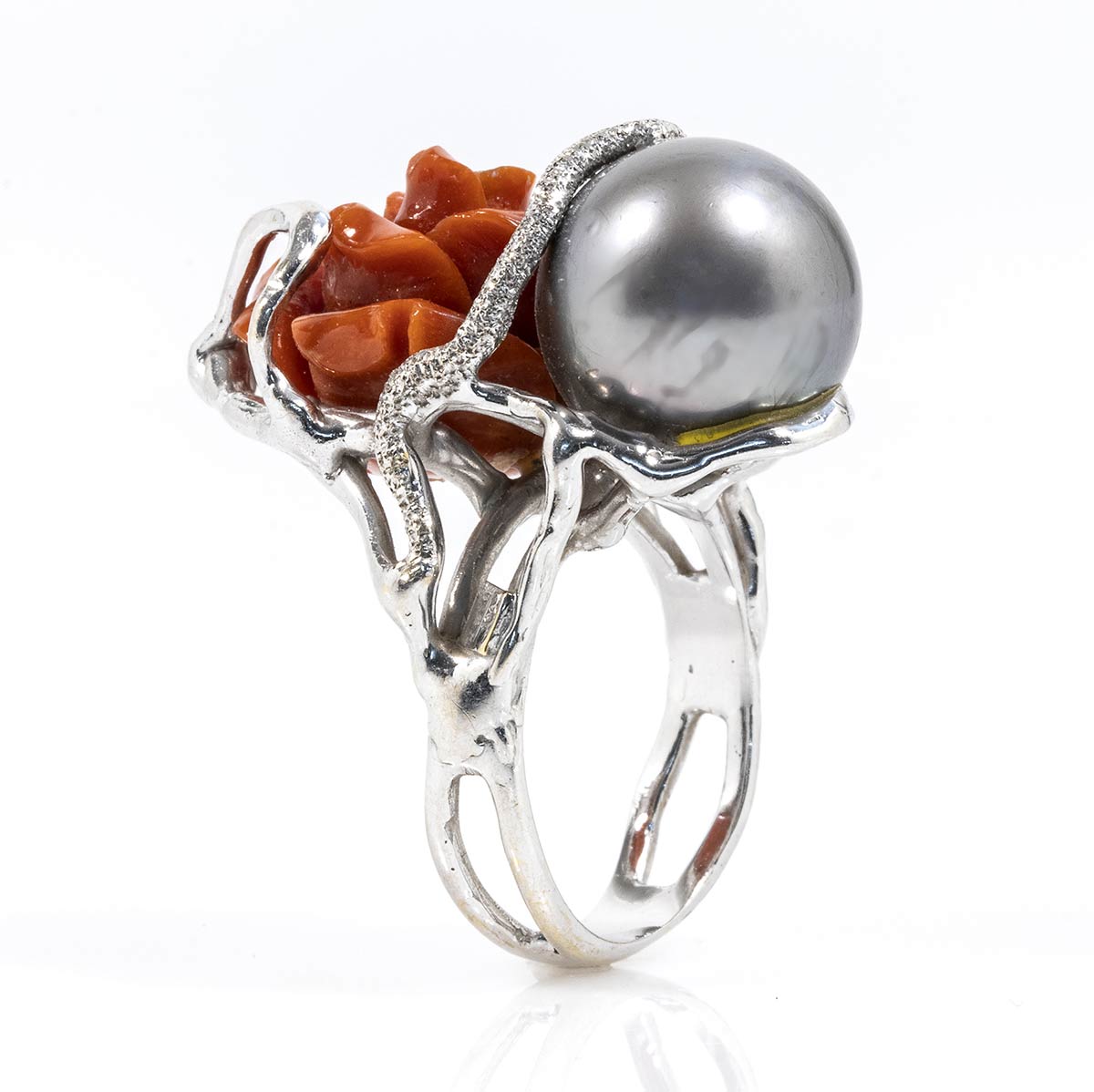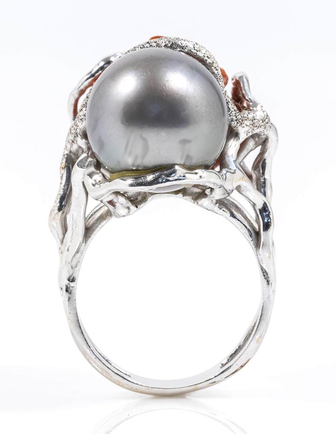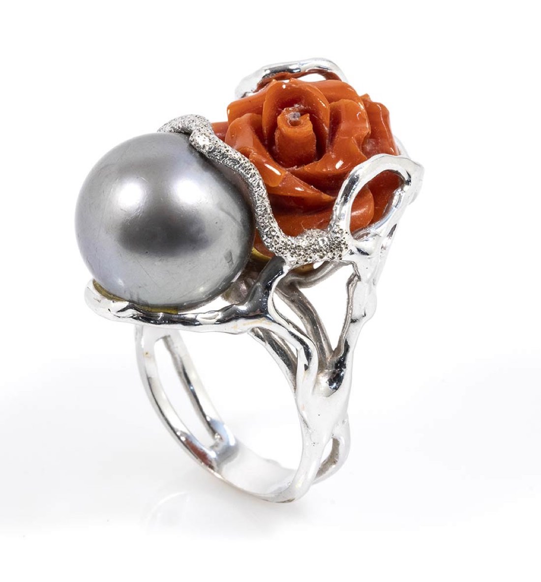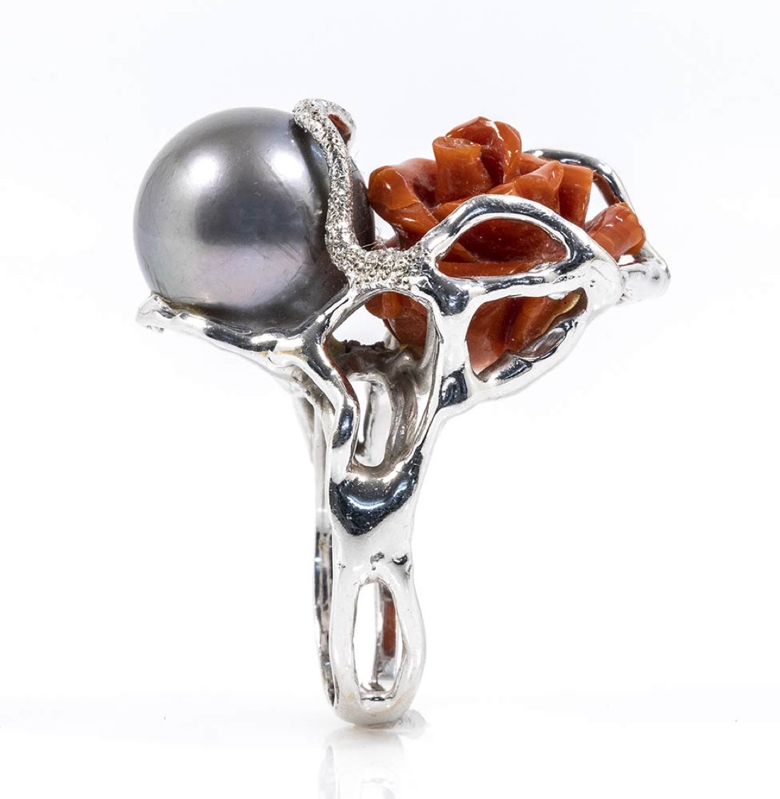 oro bianco 18k, motivo contrarié incastionato con perla Tahiti e corallo Mediterraneo (corallium rubrum) scolpito a motivo di rosa. Perla diametro 13,5 mm. Corallo diametro 16 mm. Dimensioni fronte 30 x 22 mm. Peso 18,2 gr. Misura IT 16, misura US 7,5. Stato di conservazione: ***** eccellente.