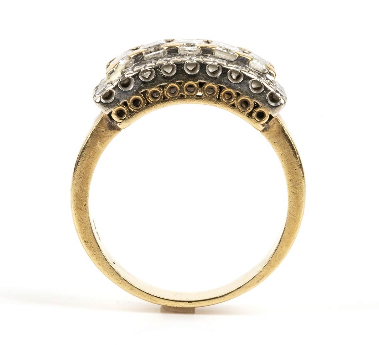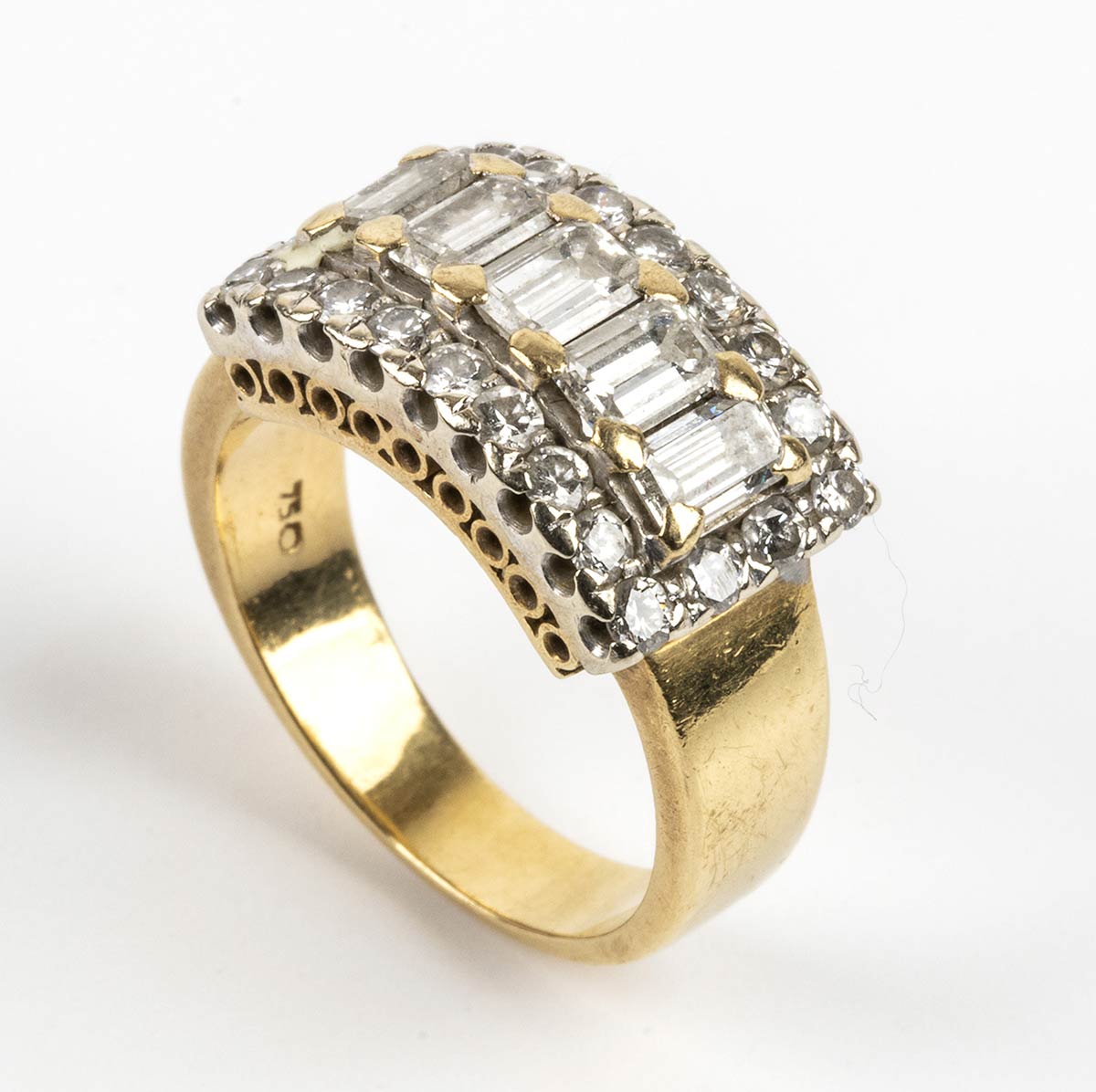in due colori d'oro 18k, modellato come una fascia, incastonato con diamanti taglio brillante, 2,20 ct circa, G, VVS-VS. Dimensioni fronte 23 x 10 mm. Peso 10 gr. Misura ITA 15 - Misura US 7. Stato conservazione : **** buono.