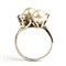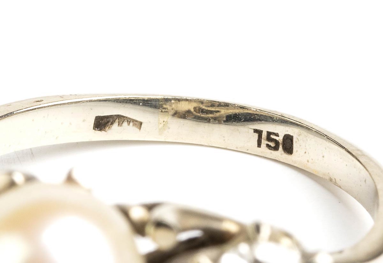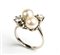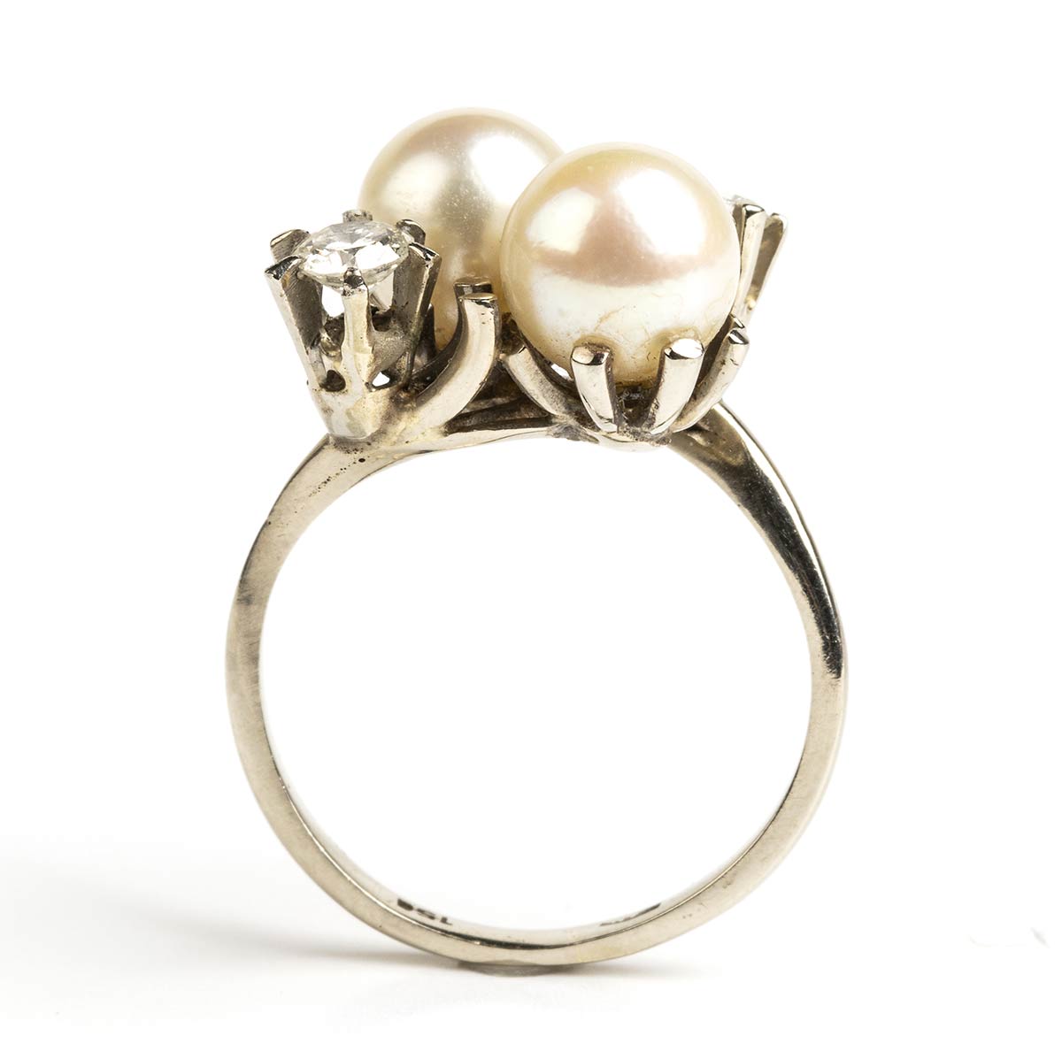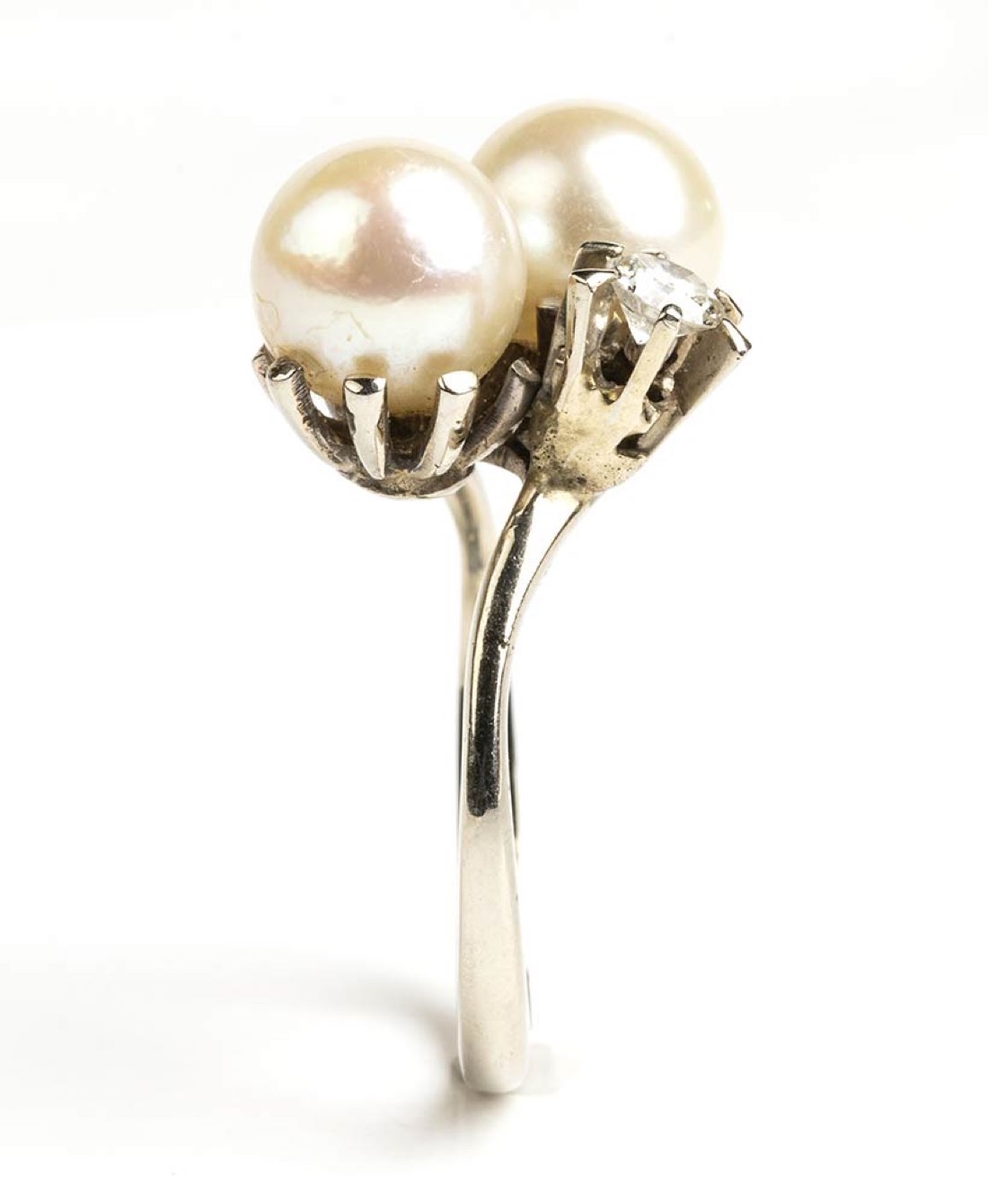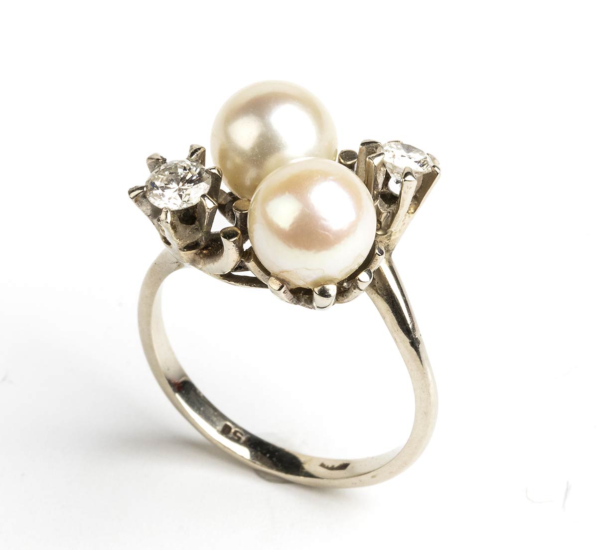 in oro bianco 18k, con perle coltivate d'accqua salata affiancate da coppia di diamanti taglio brillante 0,40 ct circa, H, VS. Punzonato "750". Peso 5 gr. Misura IT 13 - Misura US 6,5. Stato conservazione: **** buono.