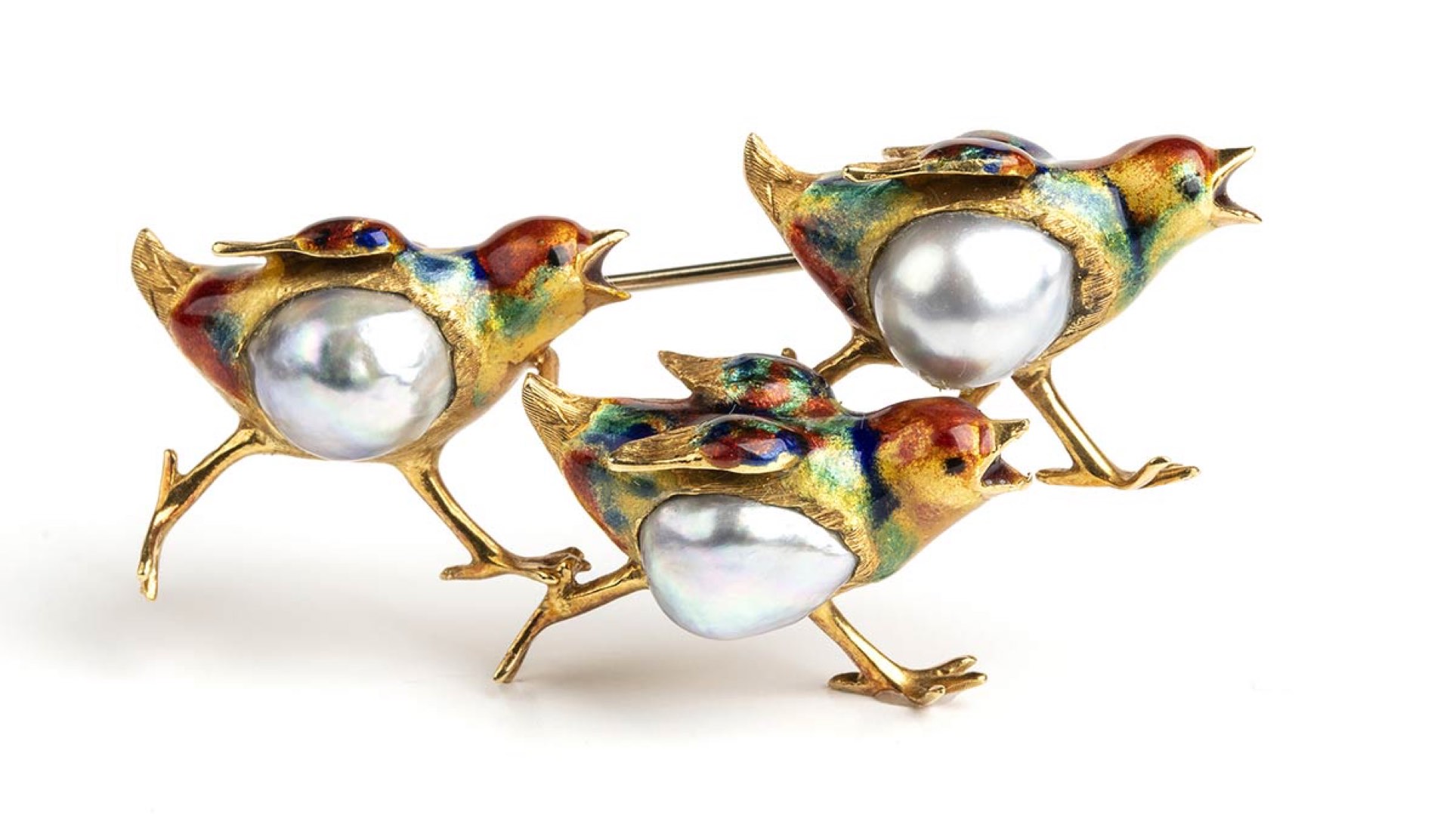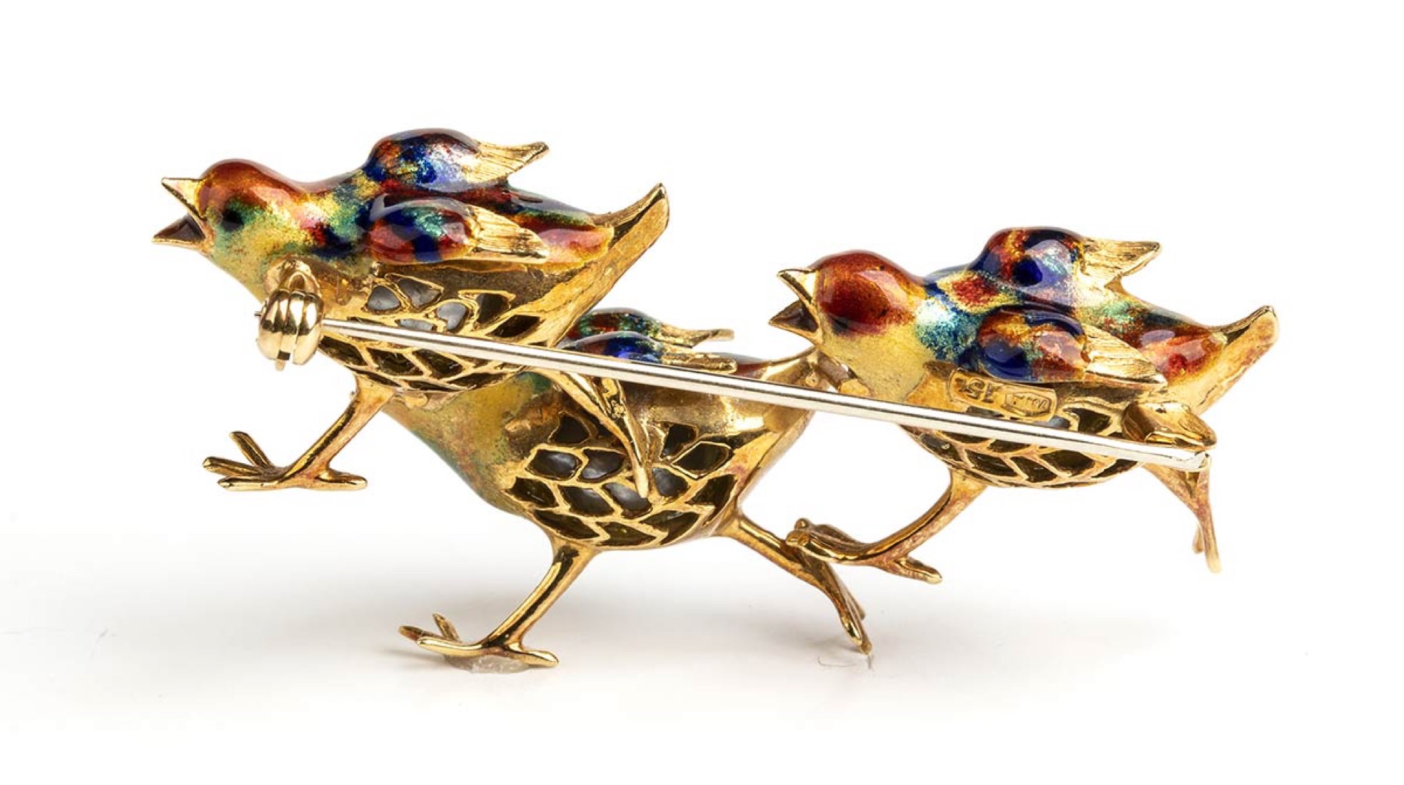 in oro giallo 18k con motivo di tre pulcini, corpo realizzato con perla Tahiti ed applicazione di smalti policromi. Punzonata "750" e "784AL". Dimensioni 5 x 2,5 cm. Peso 18,4 gr. Stato conservazione: **** buono.