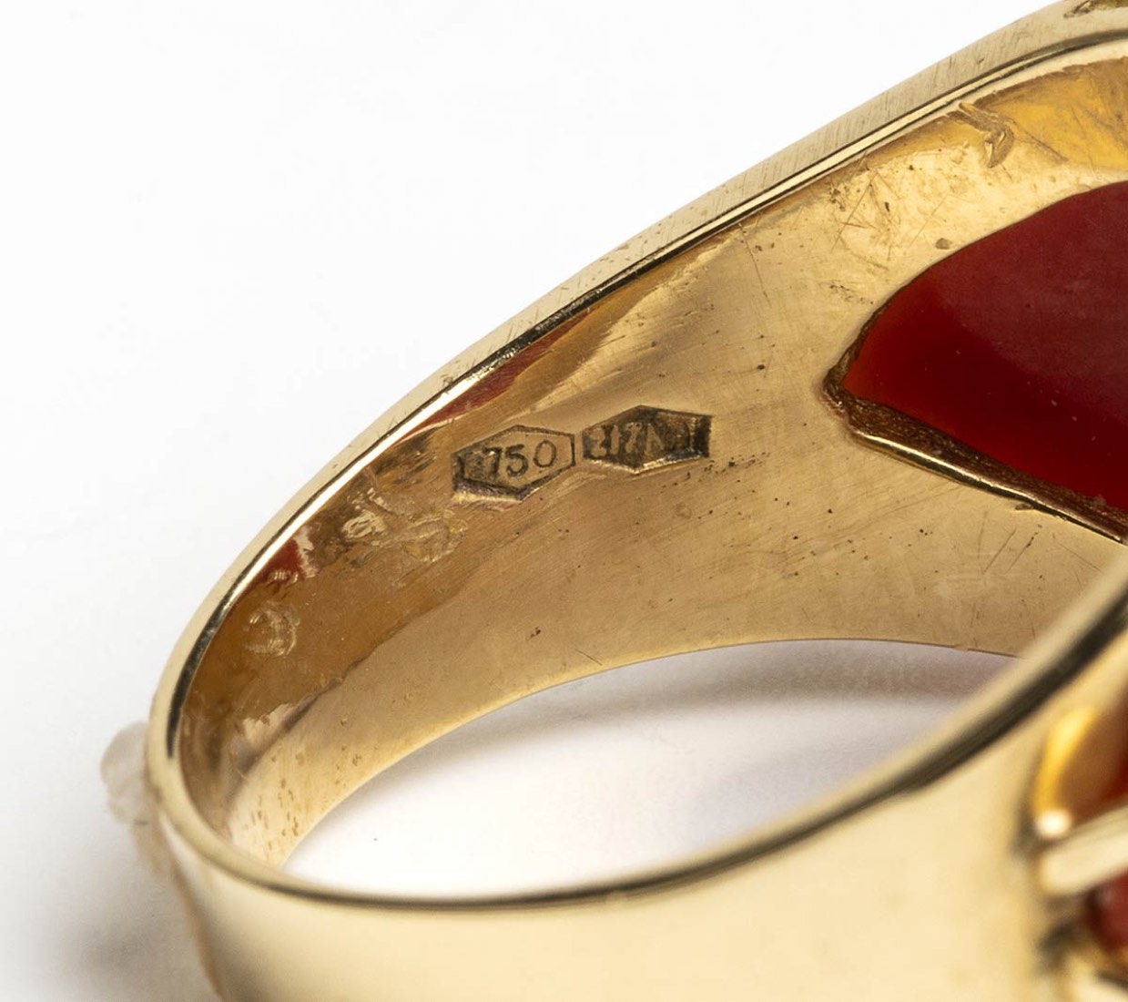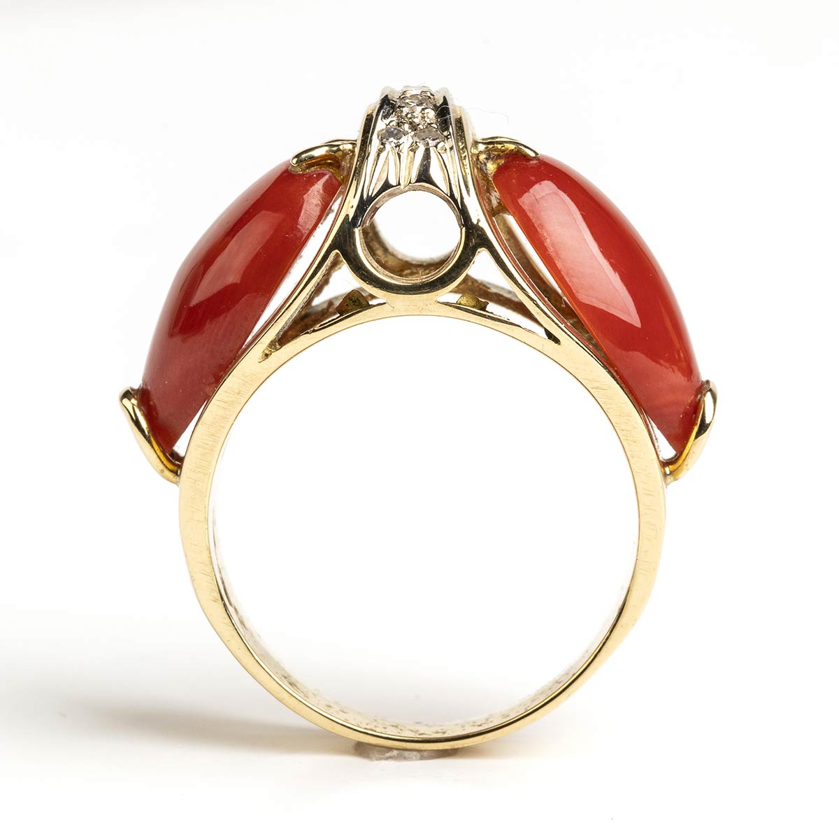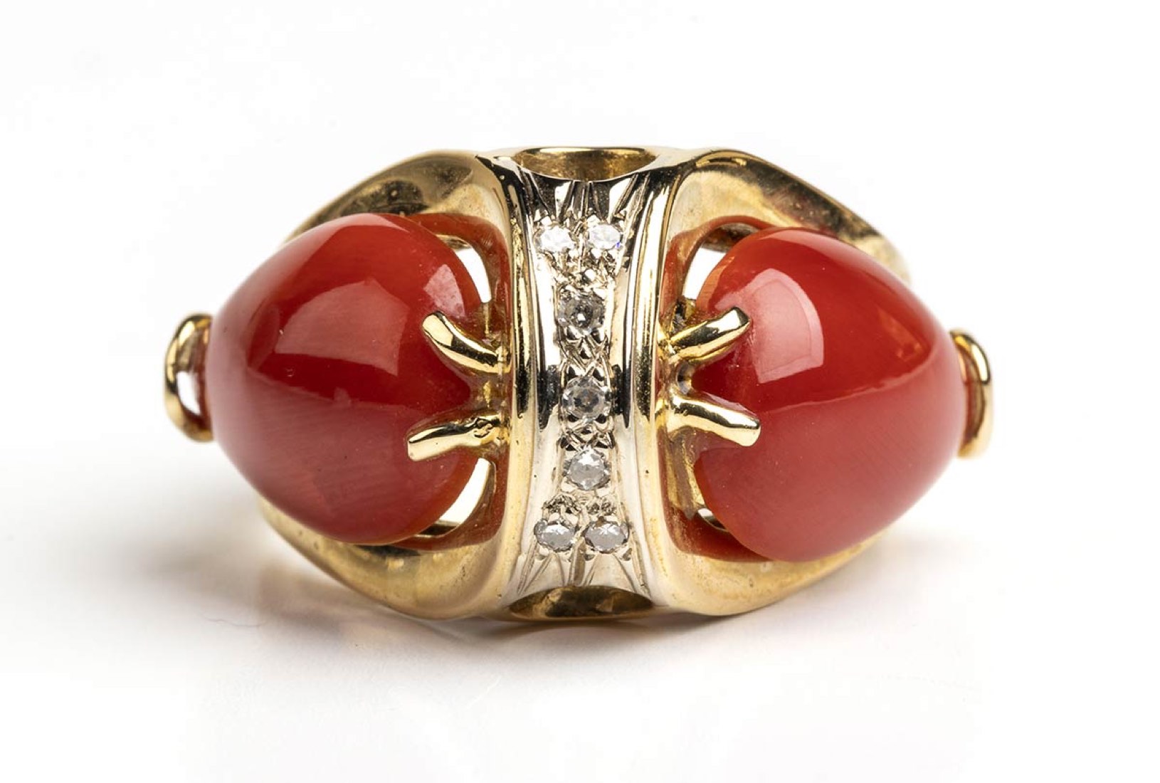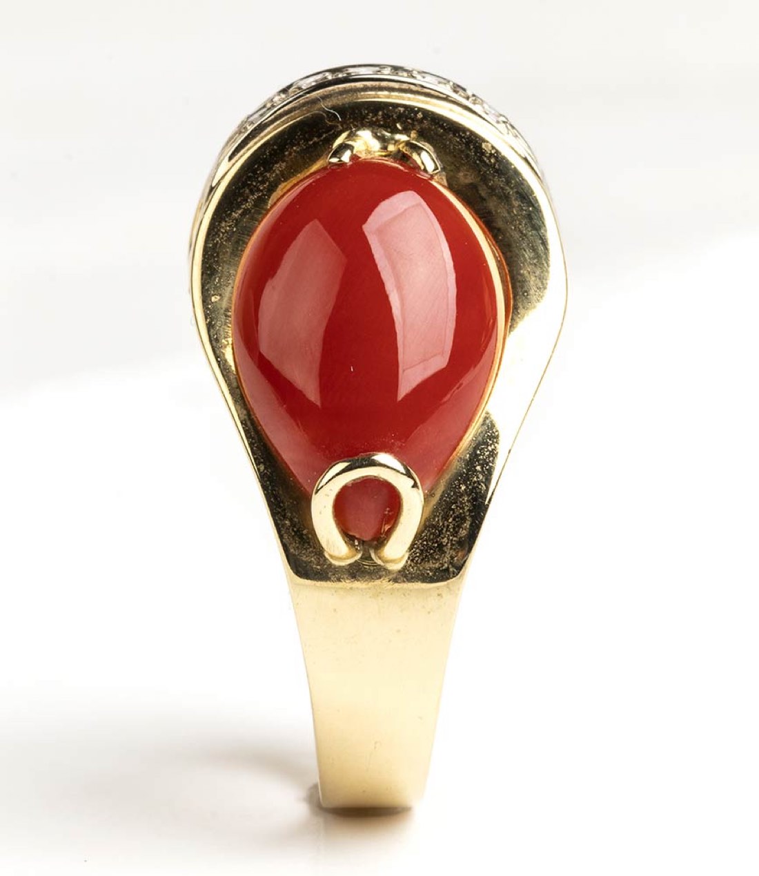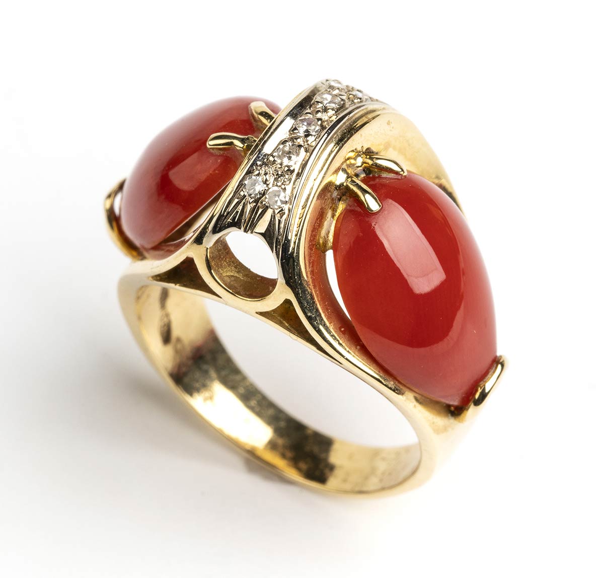 in oro giallo 18k, incastonato con coppia di cabochon di corallo Cerasuolo (Corallium Elatius) separati da linea di diamanti taglio huit-huit, 0,07 ct circa, H, VS-SI. Misure fronte 25 x 15 mm. Misura IT 15 - Misura US 7. Peso 9 gr. Stato conservazione: **** buono.
