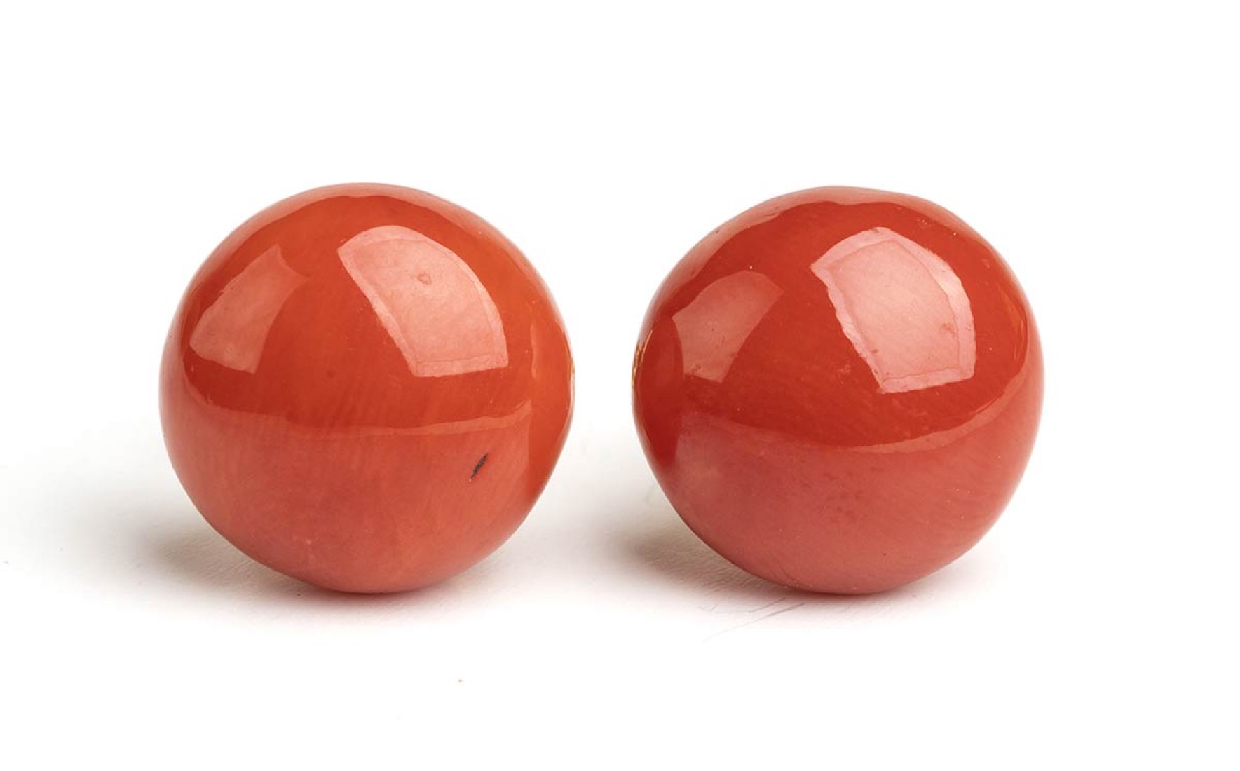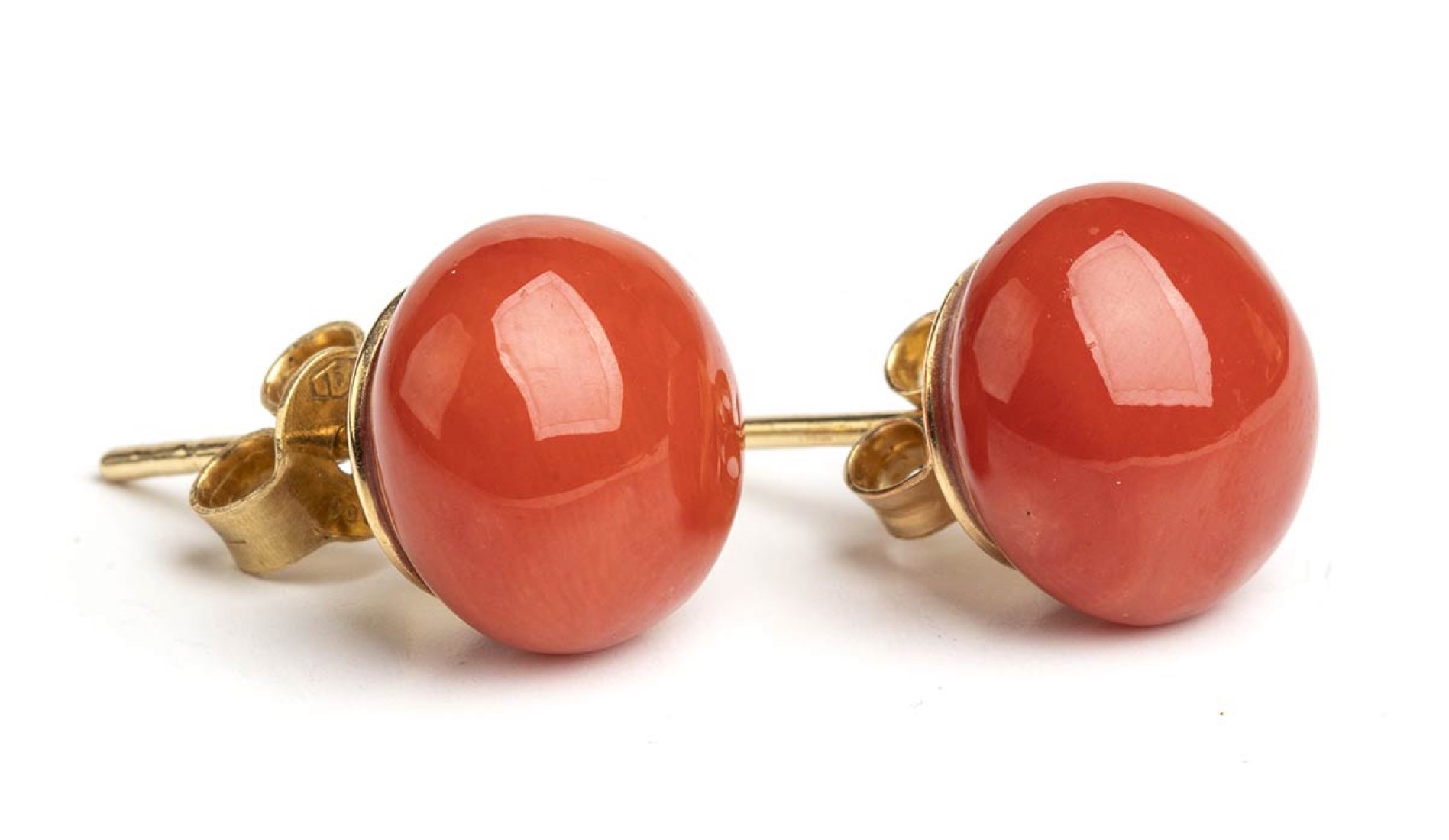 in oro giallo 18k, incastonati con cabochon di corallo Cerasuolo (corallium Elatius). Diametro 11.3 mm. Peso 4,6 gr. Stato conservazione : **** buono.