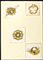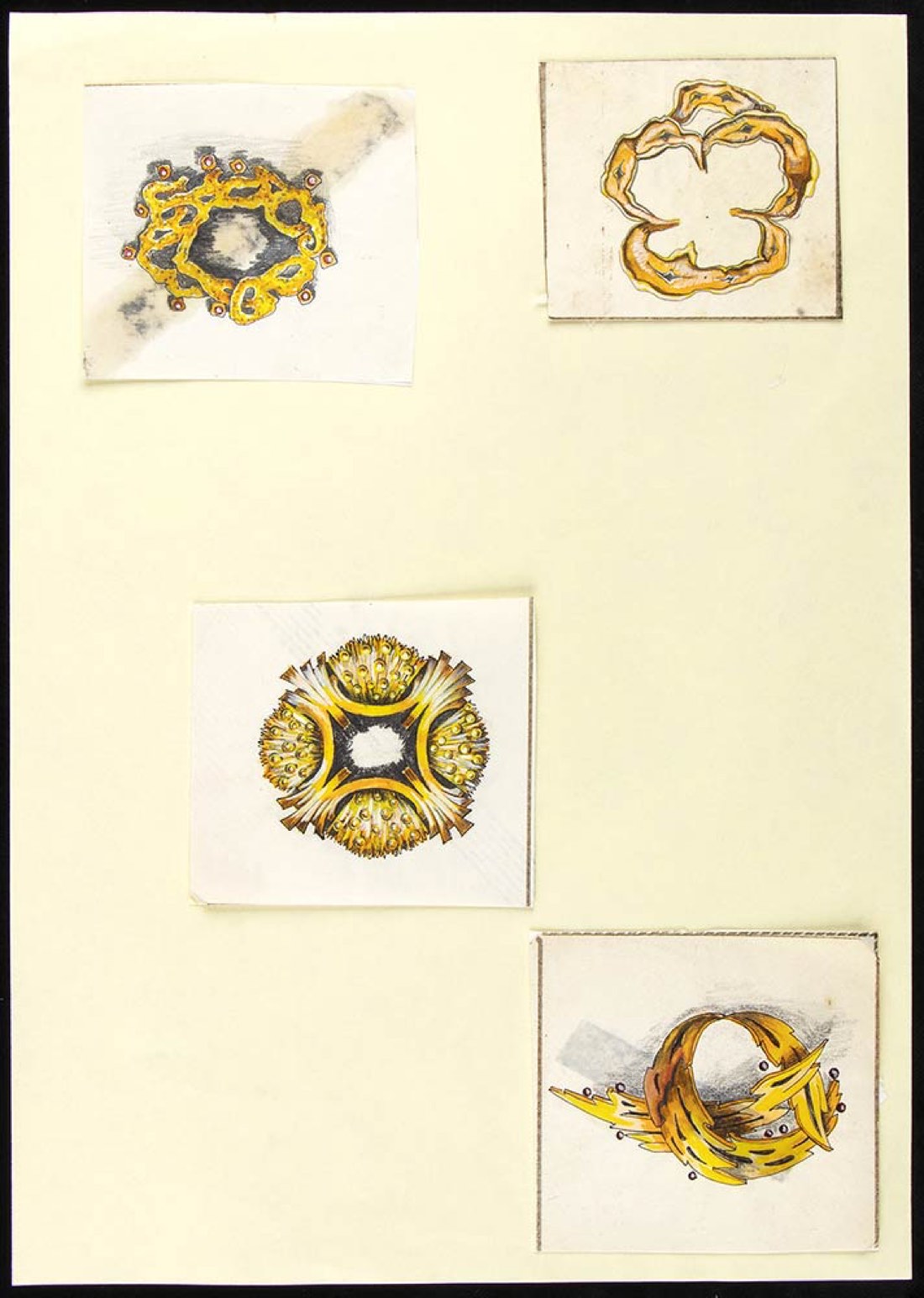 disegni di quattro spille, anni '40. Tecniche miste su velina applicate su foglio, misure massime 7,5 x 8,5 cm. Stato di conservazione: ***** eccellente.