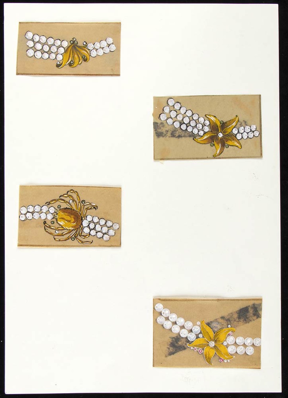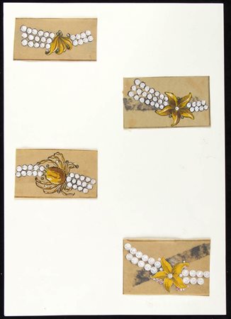 disegni di quattro fermezze per collane di perle, anni '40-'50. Tecniche miste su carta applicate su cartoncino rigido. Stato di conservazione: ***** eccellente.