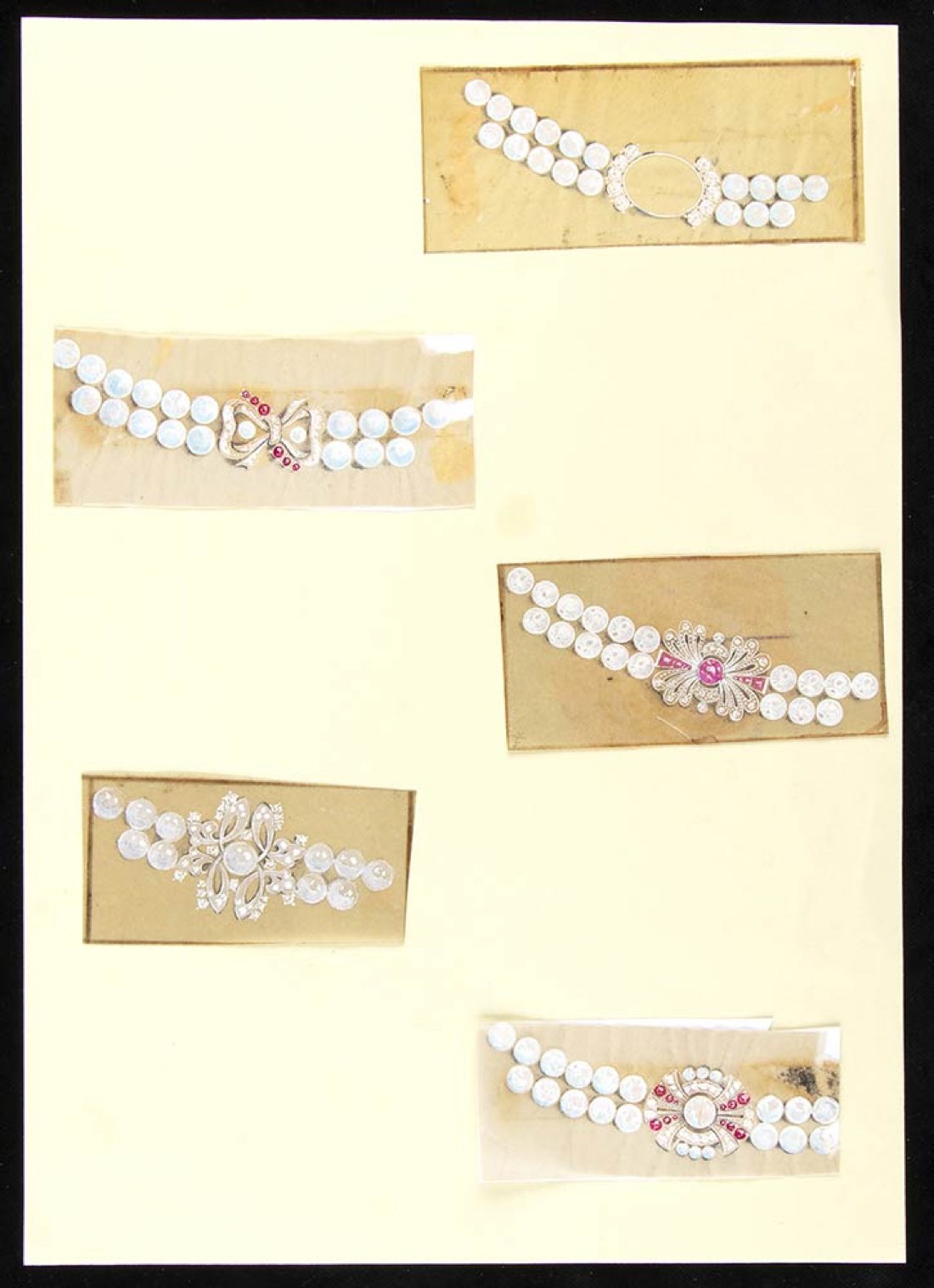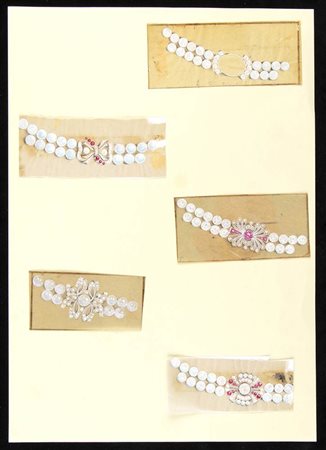disegni di cinque fermezze per collane di perle, anni '40. Tecniche miste su carta applicate su cartoncino rigido. Stato di conservazione: **** buono.