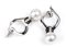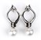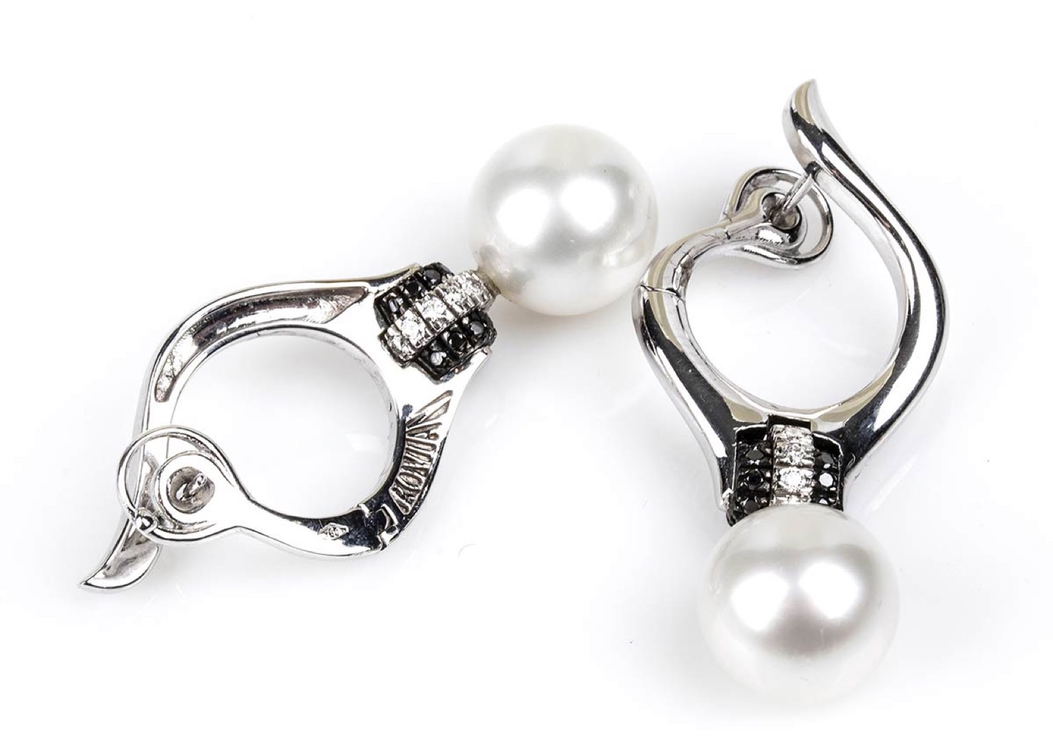 in oro bianco 18k, ciascuno con perla coltivata d'acqua dolce e diamanti taglio brillante incolori e neri. Diamanti incolori 0,48 ct circa, G, VVS-VS. Diamanti neri 0,47 ct circa. Diametro perle 13,5 mm. Dimensioni 45 x 20 mm. Peso 27,1 gr. Stato di conservazione: ***** eccellente.