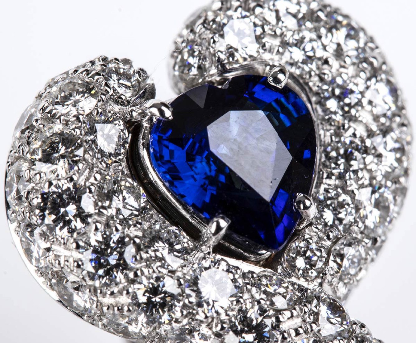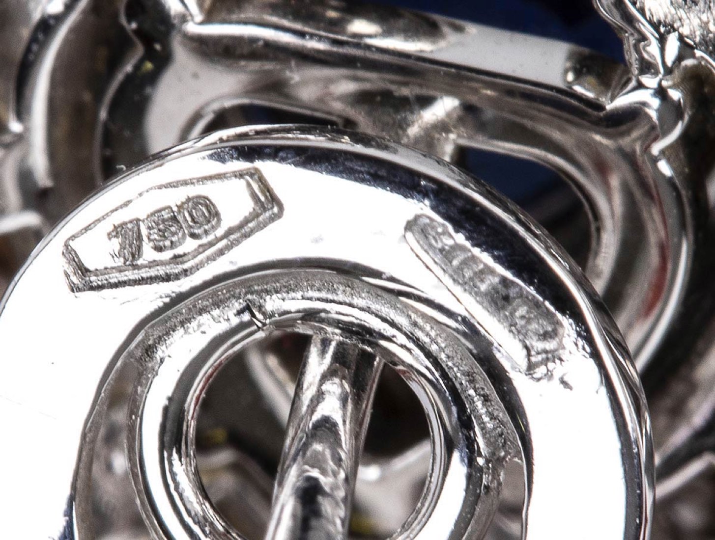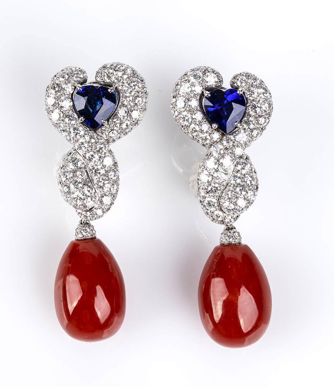 oro bianco 18k, ciascuno con goccia di corallo Aka (corallium Japonicum) sormontata da nastro in pavé di diamanti taglio brillante 5,15 ct circa, G-H, VS e zaffiro a cuore per totali 2,47 ct circa. Punzonati "750" e "145 CE". Dimensioni orecchini 40 x 15 mm, dimensioni gocce di corallo 15 x 11,7 mm. Peso 20,4 gr. Stato di conservazione: ***** eccellente.