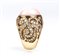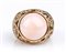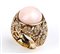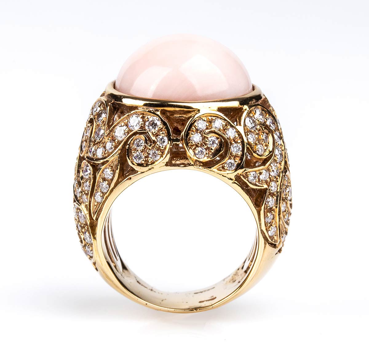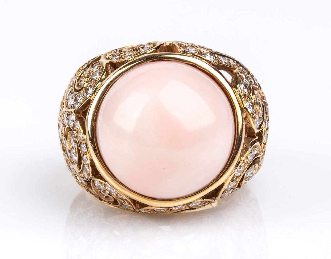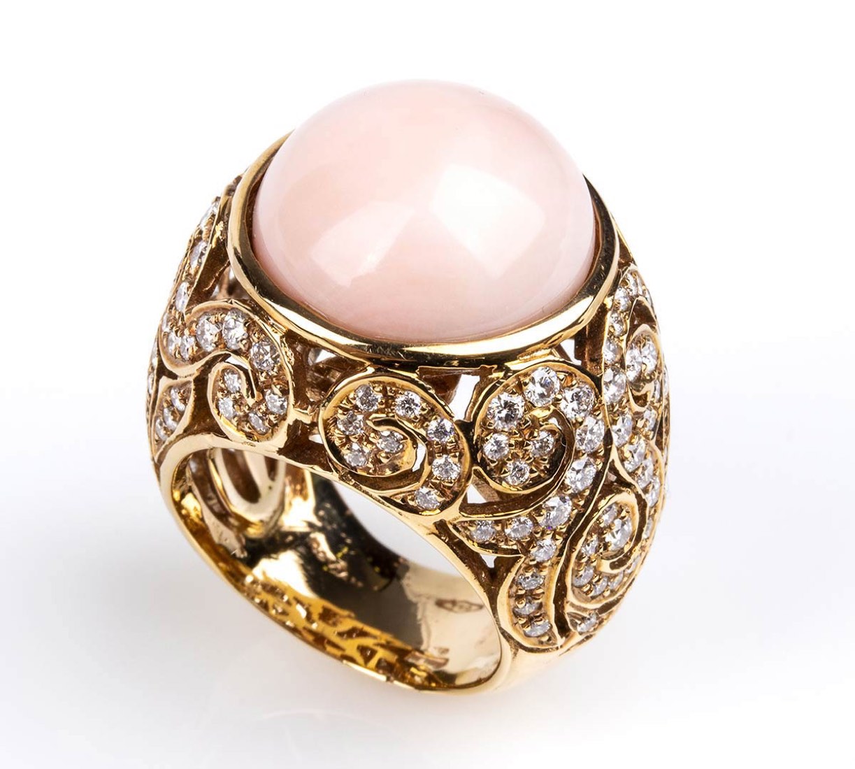 oro giallo 18k, incastonato con cabochon di corallo rosa "pelle d'angelo" (corallium secundum), montatura traforata a motivo di volute in diamanti taglio brillante 2,80 ct circa, G, VVS-VS. Punzonato "750", "ROVIAN" e "307 NA". Peso 22,2 gr. Misura IT 15 - Misura US 7. Stato di conservazione: ***** eccellente.