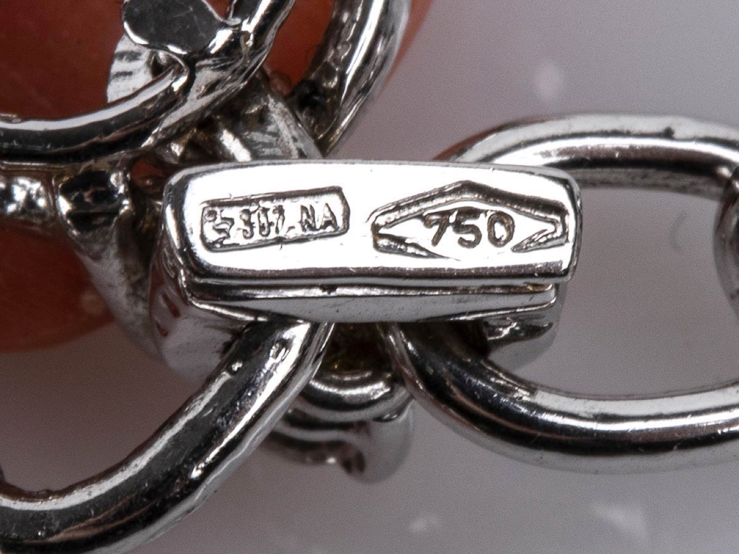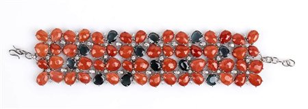 bracciale a fascia morbida in oro bianco 18k incastonato con elementi in corallo Cerasuolo (corallium rubrum) e spinelli neri, tra punteggiature di diamanti taglio brillante 1,73 ct circa, G-H, VS. Spinelli 12,45 ct circa. Punzonato "750" e "307 NA stella". Lunghezza 18 cm, larghezza 4 cm. Peso 76,4 gr. Stato di conservazione: ***** eccellente.