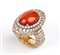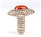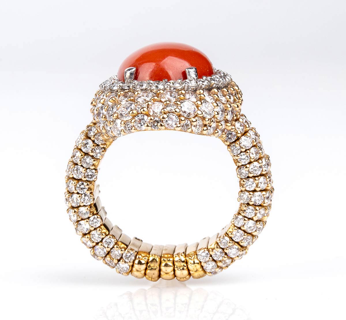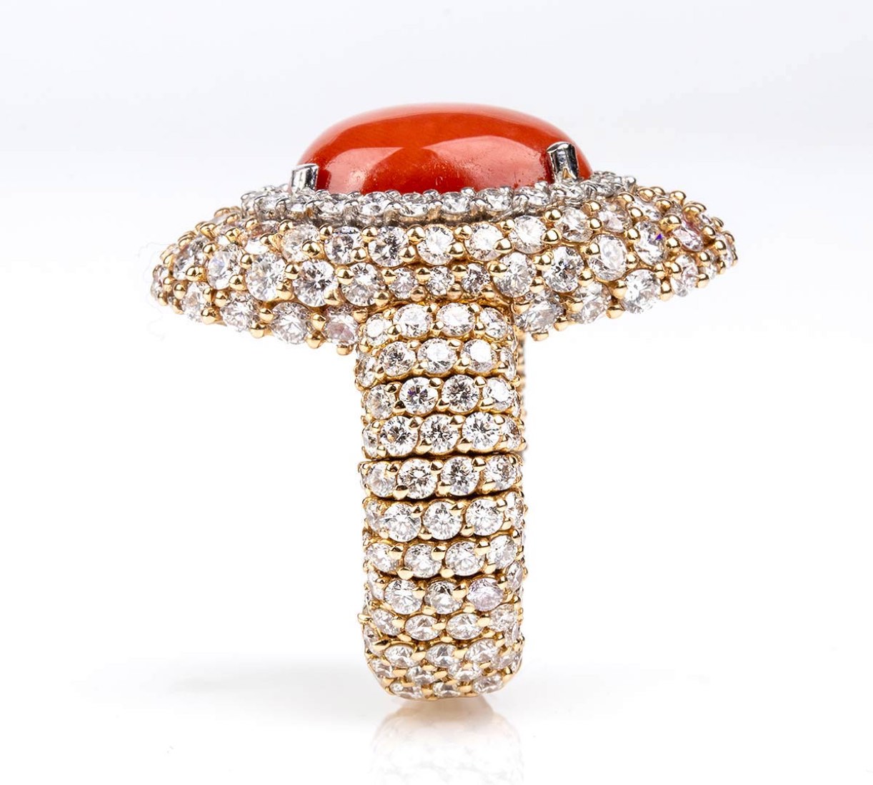 a fascia morbida in oro giallo 18k, incastonato con cabochon di corallo Mediterraneo (corallium rubrum) contornato da pavé di diamanti taglio brillante 5,84 ct circa, G, VS-SI. Firmato "Rovian" e punzonato "750", "4477 AL" e "patented". Dimensioni fronte 26 x 24 mm. Peso 17,8 gr. Misura IT 17 - Misura US 8. Stato di conservazione: ***** eccellente.