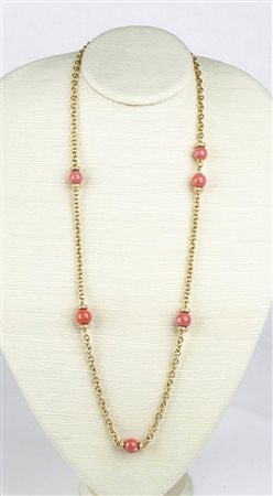 catena a maglia forzatina in oro giallo 18k, interrotta da sfere di corallo Cerasuolo (corallium elatius), dettagli in diamanti taglio brillante 2,07 ct circa, G, VS. Diametro corallo 12-12,5 mm. Peso 82,3 gr. Punzonata "750", "307 NA" e "ROVIAN". Stato di conservazione: ***** eccellente.