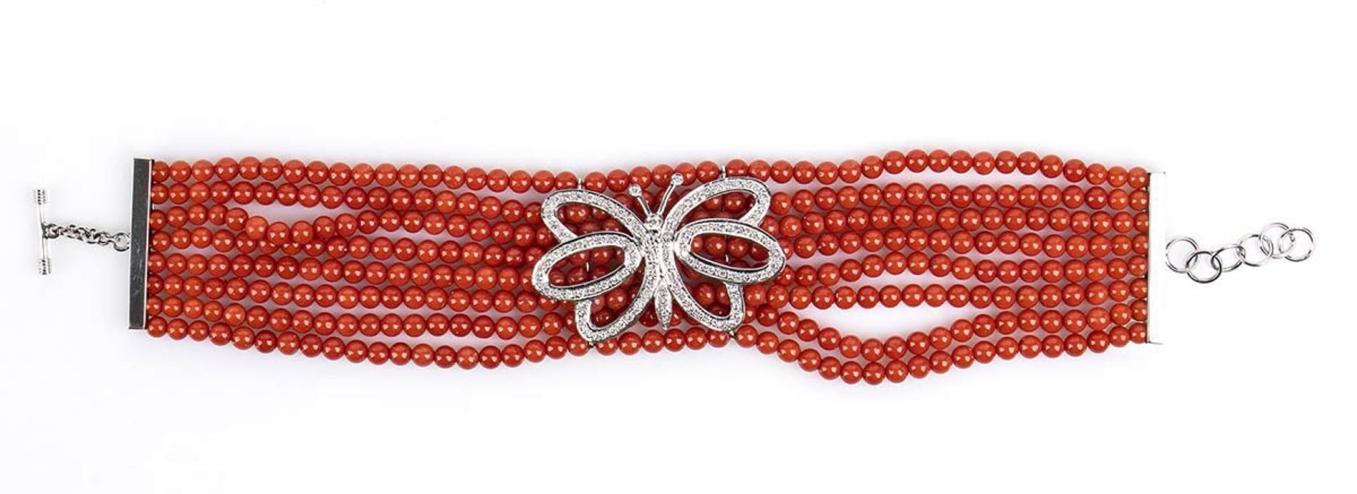 composto da otto fili di piccole sfere di corallo Mediterraneo (corallium rubrum), con farfalla centrale in oro bianco 18k incastonata con diamanti taglio brillante 1,00 ct circa, G, VVS-VS. Punzonato "750". Lunghezza 18 cm, larghezza 3 cm. Peso 50,4 gr. Stato di conservazione: ***** eccellente.
