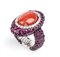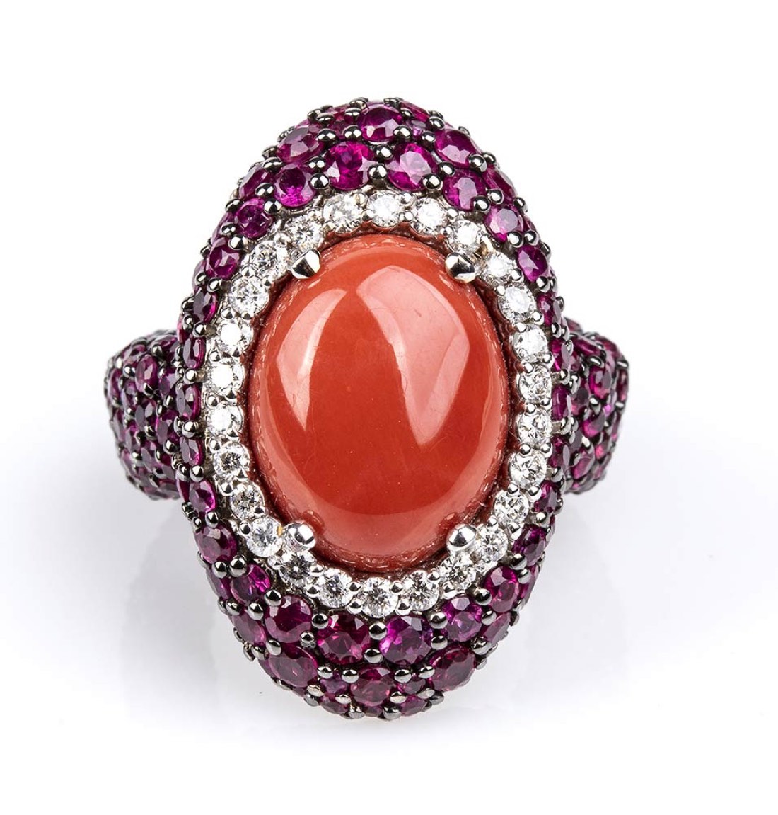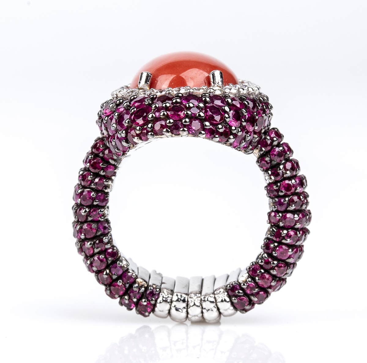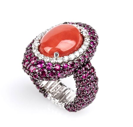 a fascia elastica in oro bianco 18k, incastonato con cabochon di corallo Mediterraneo (corallium rubrum) tra cornice di diamanti taglio brillante 0,42 ct circa, G, VS e pavé di rubini 5,18 ct circa. Firmato "ROVIAN". Dimensioni fronte 25 x 23 mm. Peso 18,4 gr. Stato di conservazione: ***** eccellente.