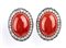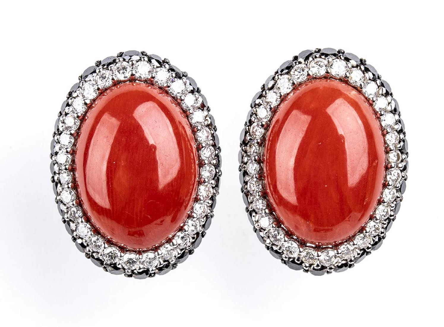 in oro bianco 18k, incastonati con cabochon ovale di corallo Cerasuolo (corallium elatius) incorniciato da diamanti incolori e diamanti neri. Diamanti incolori taglio brillante 0,88 ct circa, G, VVS-VS. Diamanti neri taglio brillante 1,51 ct circa. Punzonato "750". Dimensioni 20 x 15 mm. Peso 8,6 gr. Stato di conservazione: ***** eccellente.